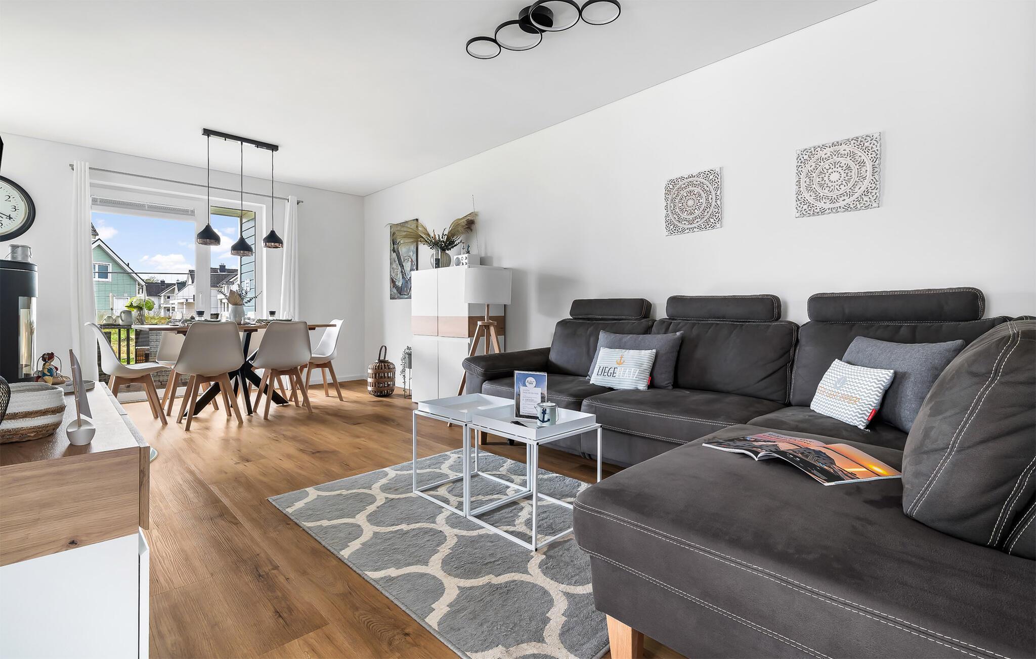 Das gemütliche L-Sofa im Wohnzimmer lässt sich in wenigen Schritten zum komfortablen Schlafsofa (120cm) umbauen. So entstehen hier ein bis zwei weitere bequeme Schlafplätze.