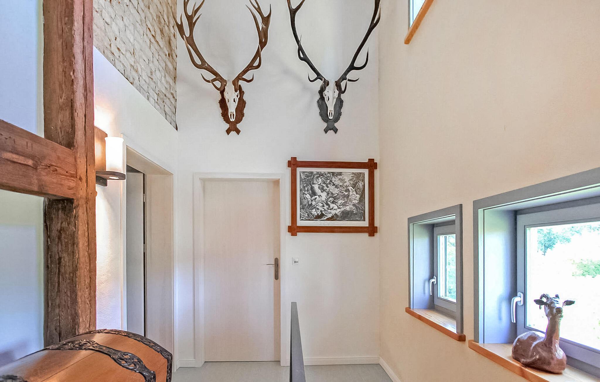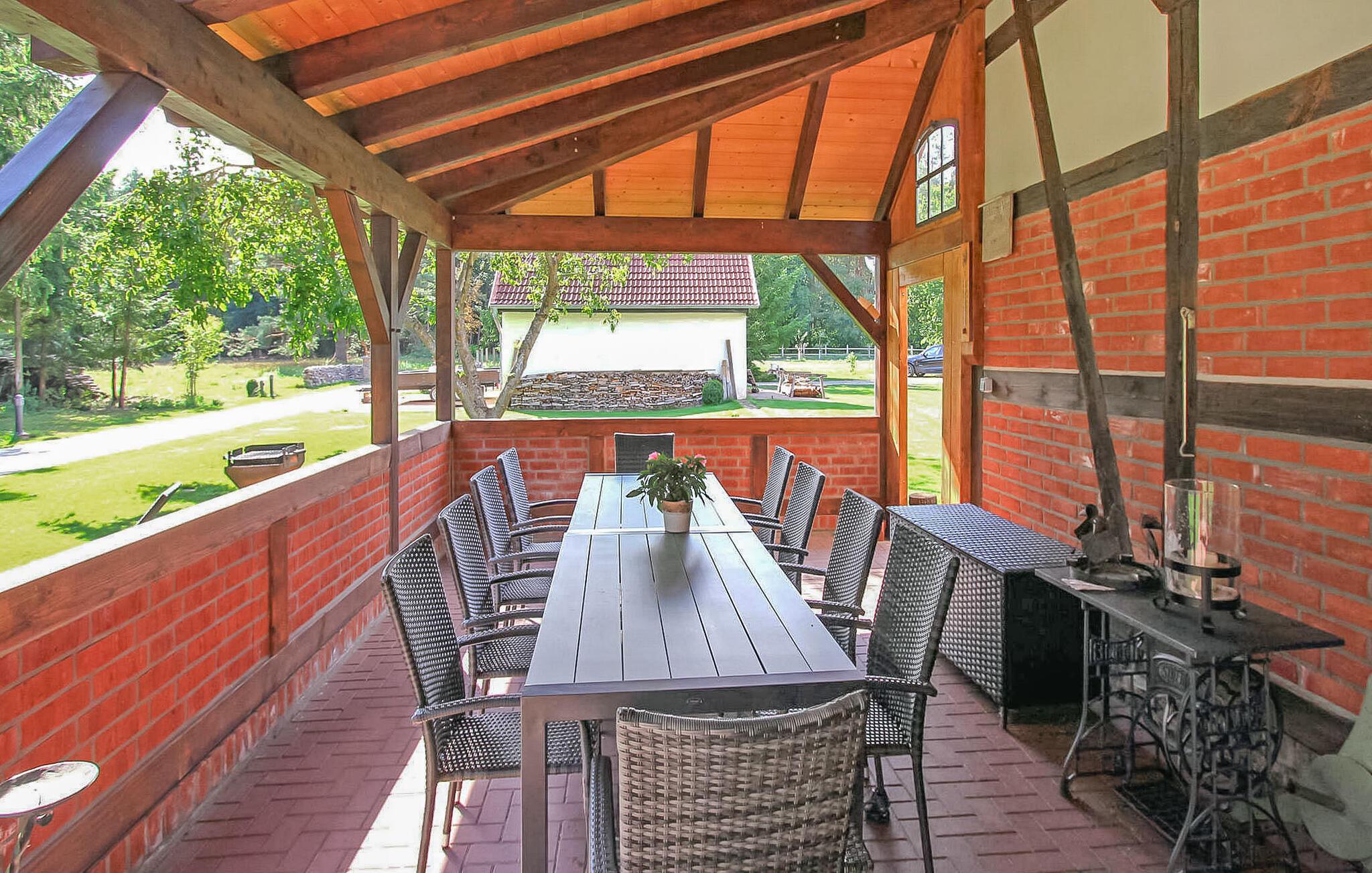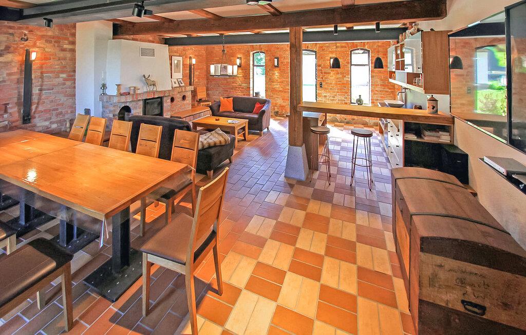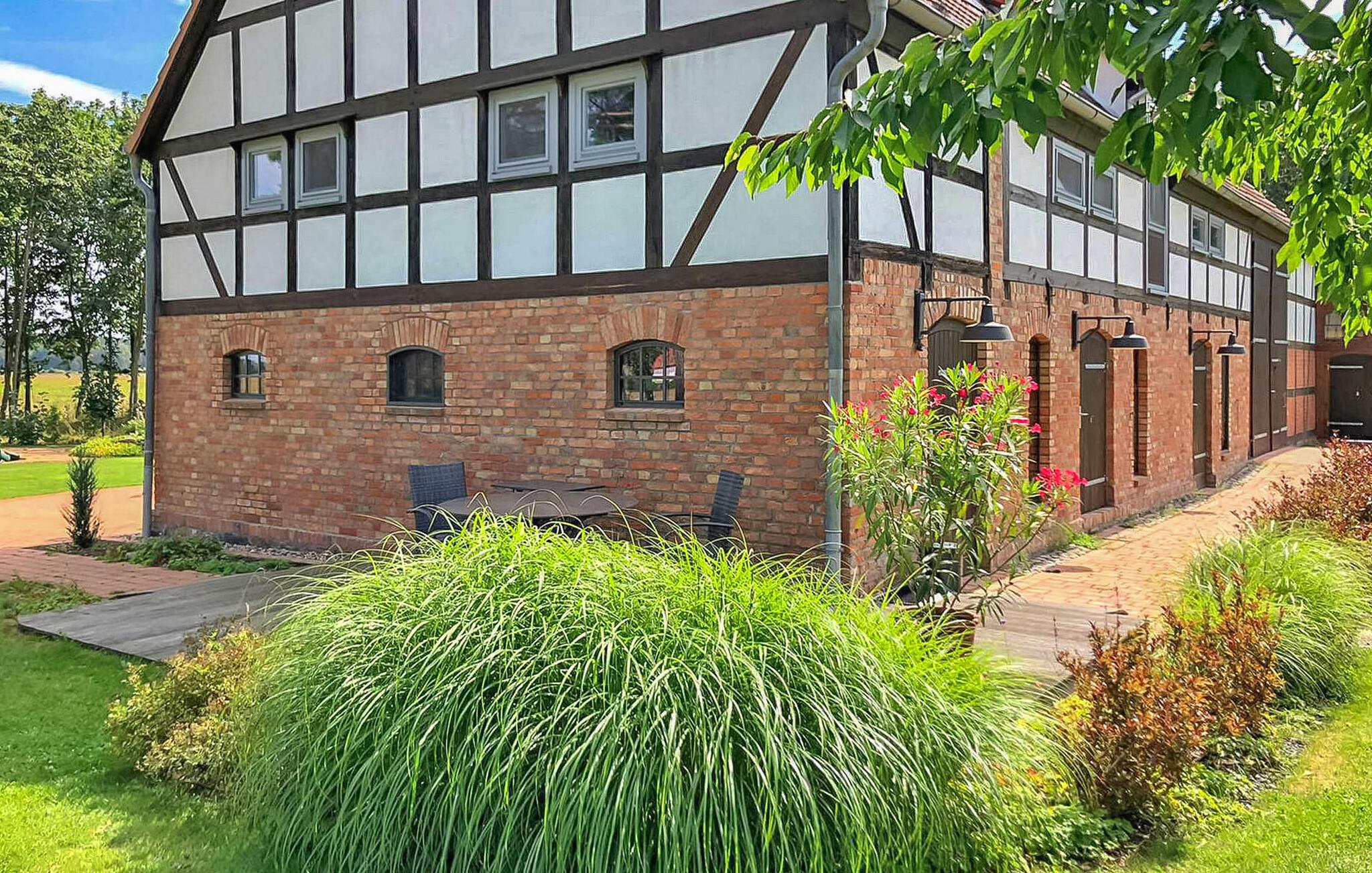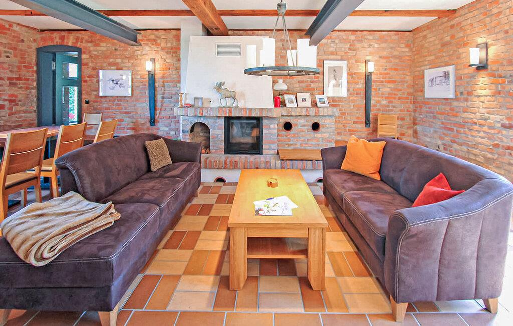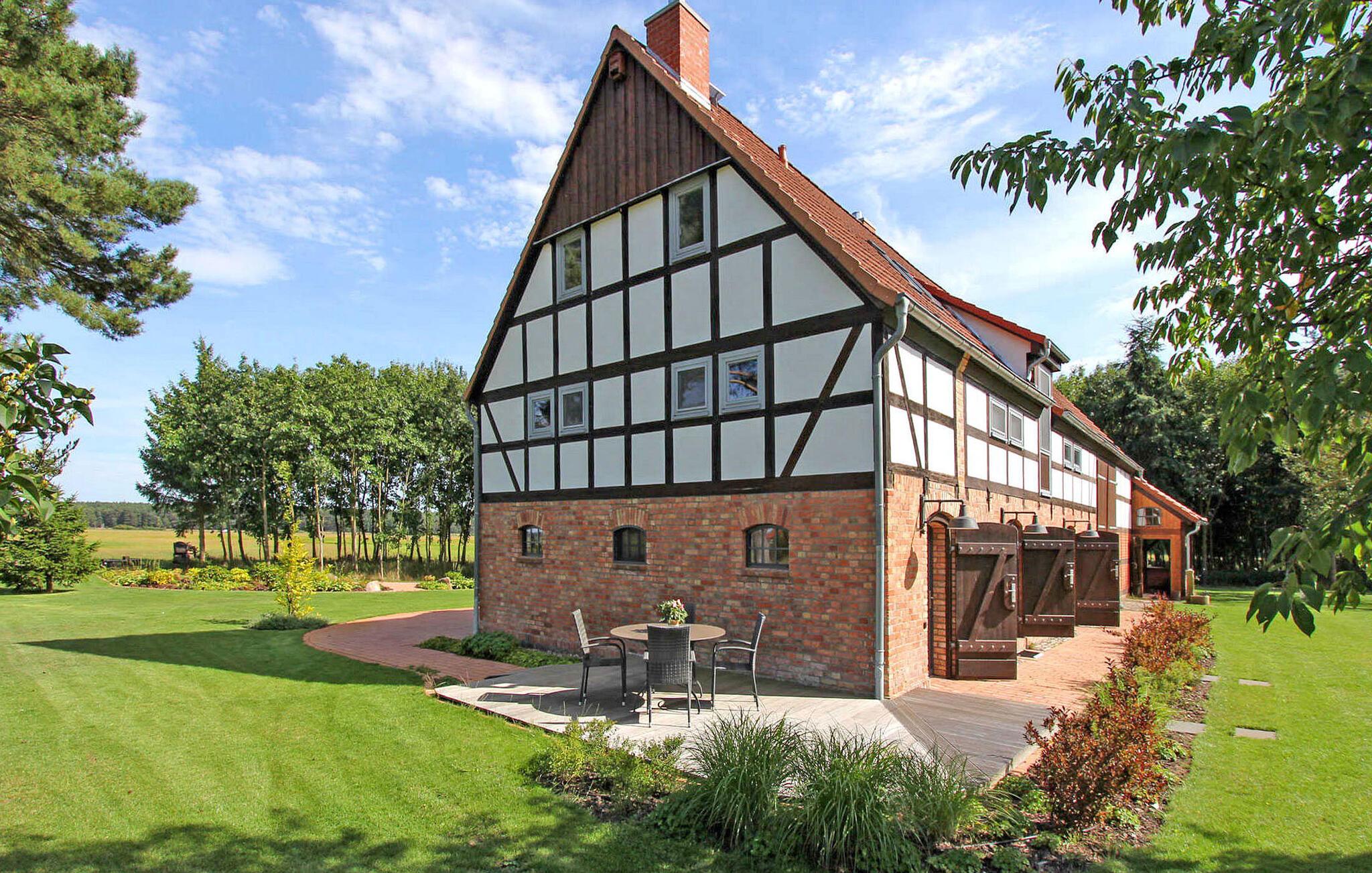 Wald, Wiesen, weites Land und ein Baudenkmal Das Komfort-Ferienhaus, eine ehemalige Scheune, befindet sich separat auf einem 5000 qm großen Naturgrundstück in absolut ruhiger Waldrandlage im Ortsteil Riesenbrück. Das Geburtshaus des überregional bedeutsamen vorpommerschen Malers und Zeichners Paul Holz befindet sich auf dem alten Hof. Das Ferienhaus wurde im Jahre 2016 sehr aufwendig komplettsaniert und hochwertig eingerichtet. Die Ausstattung genügt gehobenen Ansprüchen. Konzipiert wurde das Gebäude für einen komfortablen Aufenthalt kleinerer Gruppen oder befreundeter Familien. So gibt es im Erdgeschoss einen großen Gemeinschaftsraum mit Esstisch, Polster-Sitzecke, Kamin (Erstausstattung Kaminholz inkl., danach 3 EUR/Korb), Flachbild-TV und Hifi, eine moderne und komplett ausgestattete Küche, einem kombinierten Wohn-/Schlafraum mit Doppelbett sowie einem Gäste-WC. Im Obergeschoss befinden sich zwei separate Appartments mit je einem Wohnbereich mit 1-2 Schlafcouch(en) und TV, einem Schlafboden mit Doppelbett (Zugang über Raumspartreppe) sowie je einem Bad (1 x DU, 1 x Badewanne). Für Kleinkinder können ein Hochstuhl und ein Kinderreisebett zum Selbstaufbau (einfaches System) bereitgestellt werden. Weiterhin gibt es kostenloses W-LAN sowie Netflix. Das gesamte Ferienhaus ist sowohl im Innen- als auch im Außenbereich sehr großzügig bemessen, sodass sich auch für größere Gruppen genügend Rückzugsmöglichkeiten und Ruhezonen ergeben. Im Außenbereich gibt es mehrere möblierte Sitzecken (teilweise überdacht), Lagerfeuer- und Grillplatz, Sonnenliegen, Fahrradunterstellmöglichkeit und Parkplätze. Nutzung der Außensauna nach Absprache. Einfache Fahrräder können nach Absprache vor Ort gemietet werden. Direkt vom Grundstück sind Wildbeobachtungen von heimischen Schalenwildarten wie Rot-, Dam-, Reh- und Schwarzwild möglich. Hierfür können Fernglas/Spektiv auf Anfrage vor Ort geliehen werden. Ausserhalb der Haupturlaubssaison wird die Unterkunft gerne auch von mobilen Montageteams bzw. Firmen gebucht. Wir bieten großzügige Wohnmöglichkeiten zu günstigen Sonderkonditionen auch für kleinere Gruppen. Haustiere: In diesem Objekt ist die Mitreise ausdrücklich eines Haustieres erlaubt .