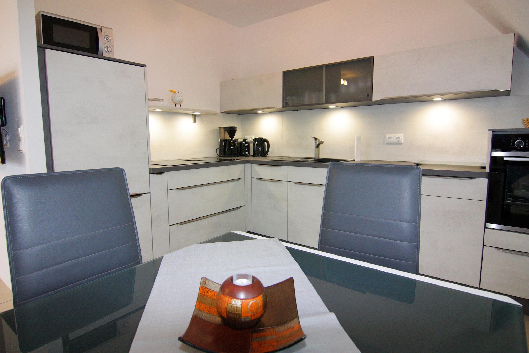 In der 1. Etage: (offene Küche(Esstisch(4 Personen), Wasserkocher, Toaster, Kochherd(Ceranfeld), Dunstabzugshaube, Kaffeemaschine, Backofen, Spülmaschine, Kühlschrank(+ Gefrierfach)), Wohn/Esszimmer(Doppelschlafcouch, TV(Satellit), Radio, CD-Spieler, Heizung(Fußbodenheizung)), Schlafzimmer(Doppelbett), guest toilet, Flur) In der 2. Etage: (Schlafzimmer(Doppelbett), Badezimmer(Dusche, Waschbecken, Toilette, Waschmaschine), Flur, Sauna(alleinige Nutzung)) Balkon, Gartenmöbel, Parkplatz, Handtücher/Bettwäsche (extra Gebühr)