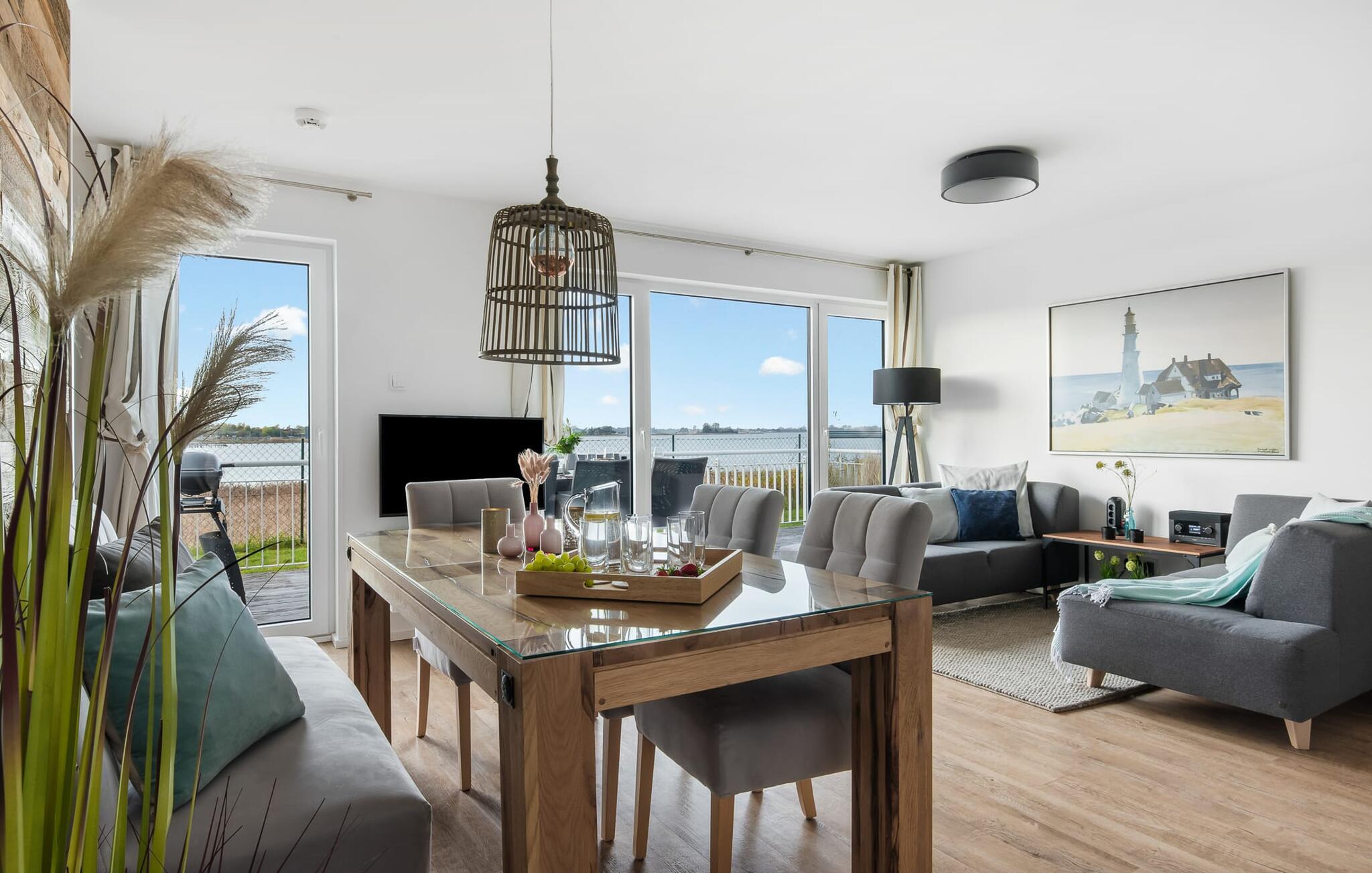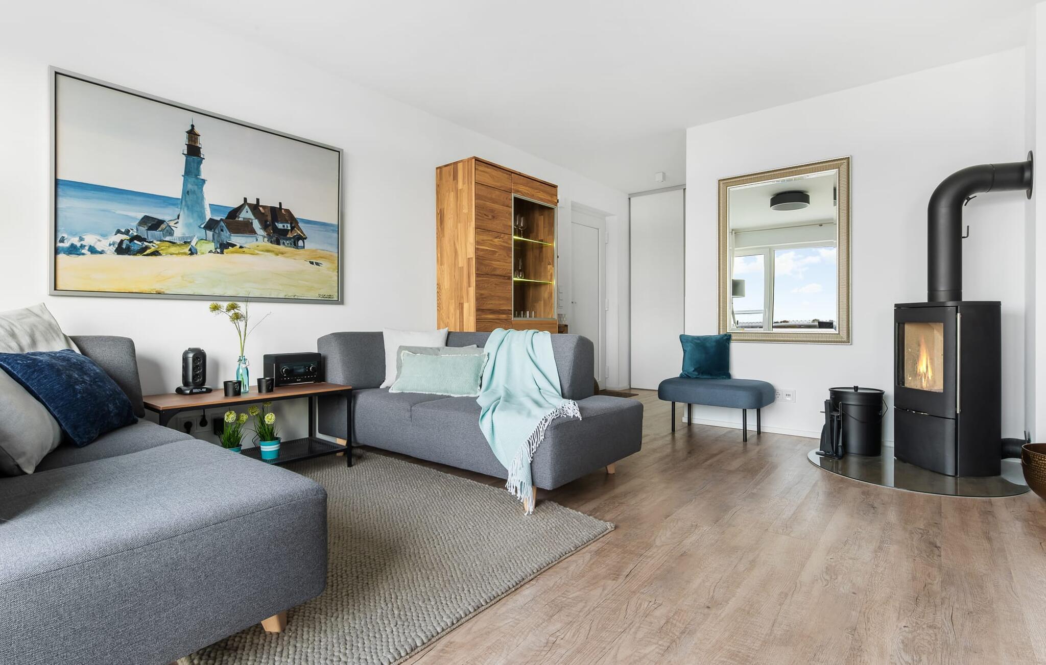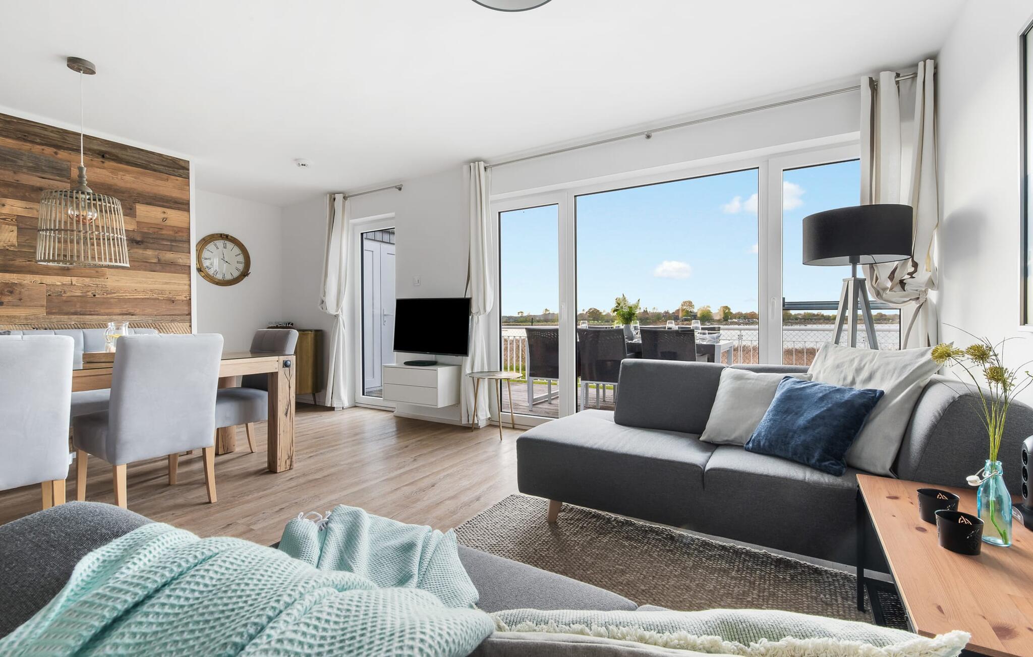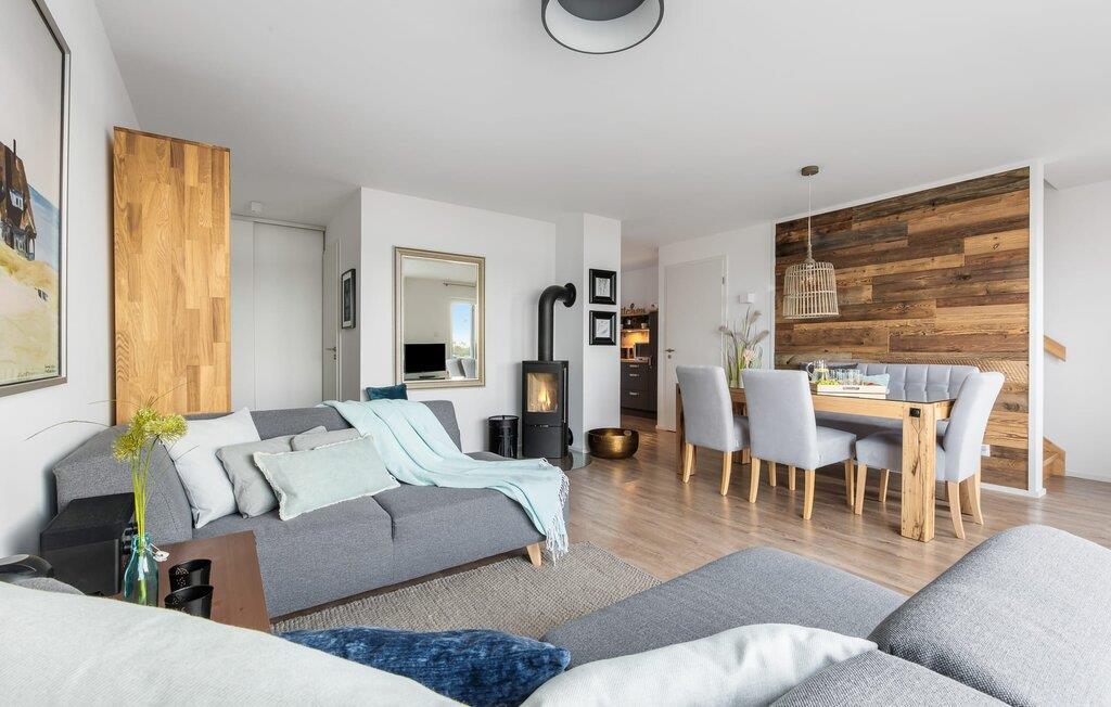 Kaminofen, Fußbodenheizung und ein privater Wellnessbereich sorgen für wohligen Komfort zu jeder Jahreszeit. Der lichtdurchflutete Wohn- und Essbereich des Ferienhauses befindet sich im Erdgeschoss. Bodentiefe Fenster erlauben einen freien Blick auf das Schleitreiben und vorbeifahrende Segelschiffe. Für Wohlbehagen sorgt in der dunklen Jahreszeit ein Kaminofen und das Home Entertainment Programm inkl. Zugang zu TV Now und Disney+.