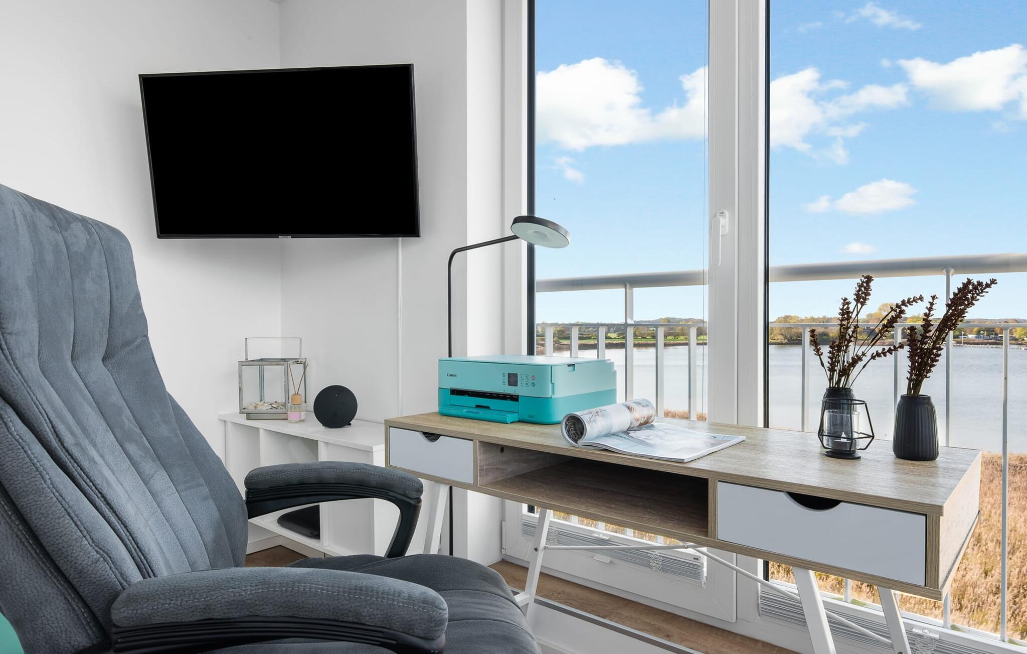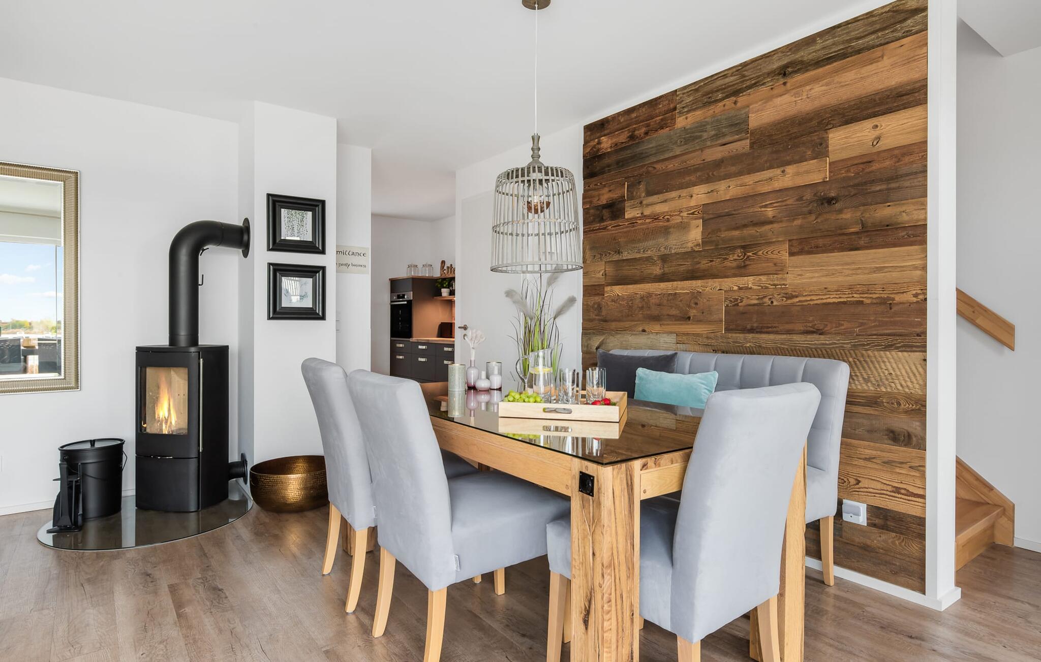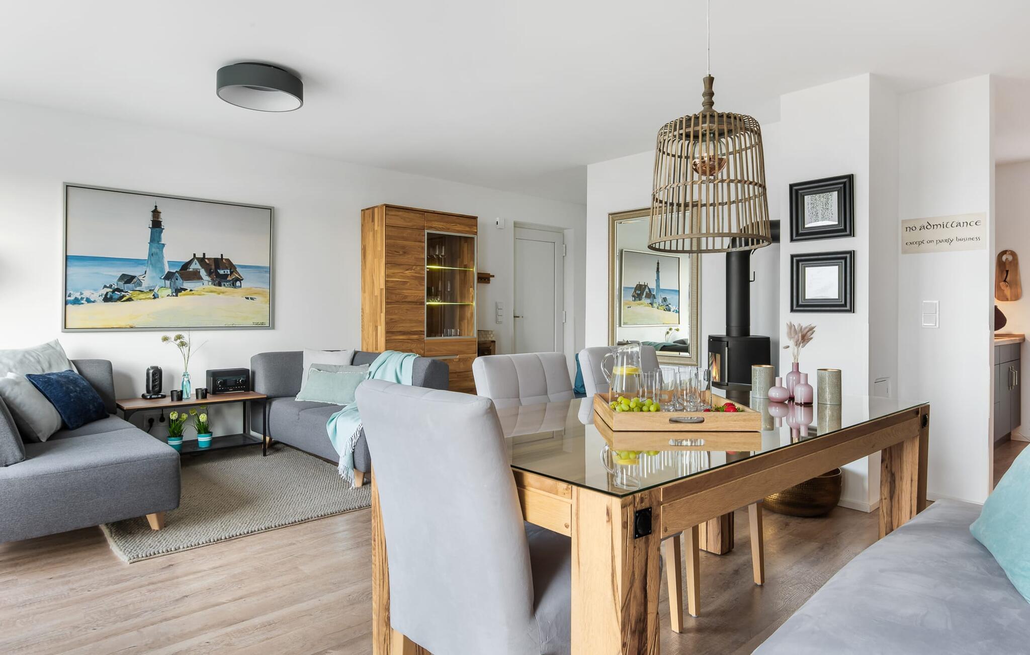 Kaminofen, Fußbodenheizung und ein privater Wellnessbereich sorgen für wohligen Komfort zu jeder Jahreszeit. Der lichtdurchflutete Wohn- und Essbereich des Ferienhauses befindet sich im Erdgeschoss. Bodentiefe Fenster erlauben einen freien Blick auf das Schleitreiben und vorbeifahrende Segelschiffe. Für Wohlbehagen sorgt in der dunklen Jahreszeit ein Kaminofen und das Home Entertainment Programm inkl. Zugang zu TV Now und Disney+.