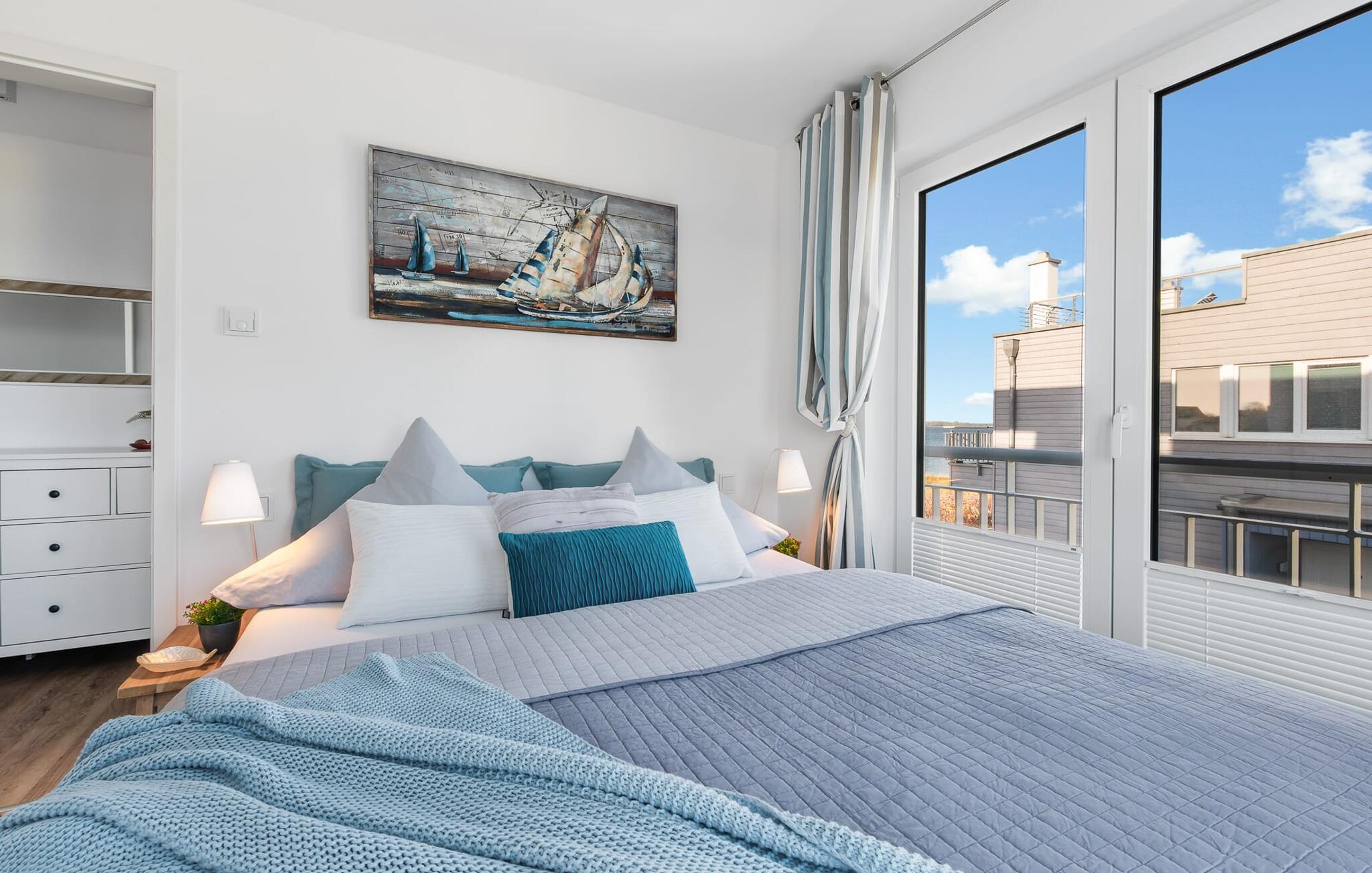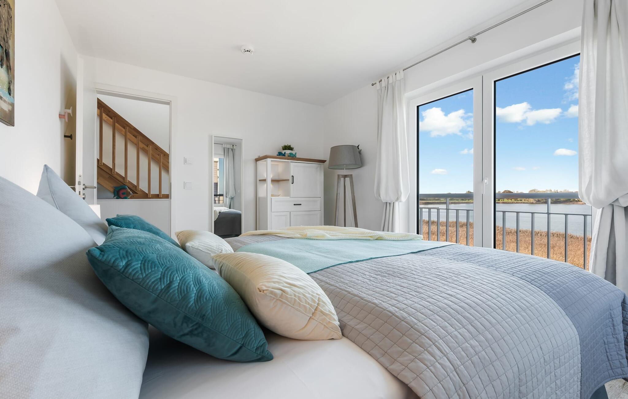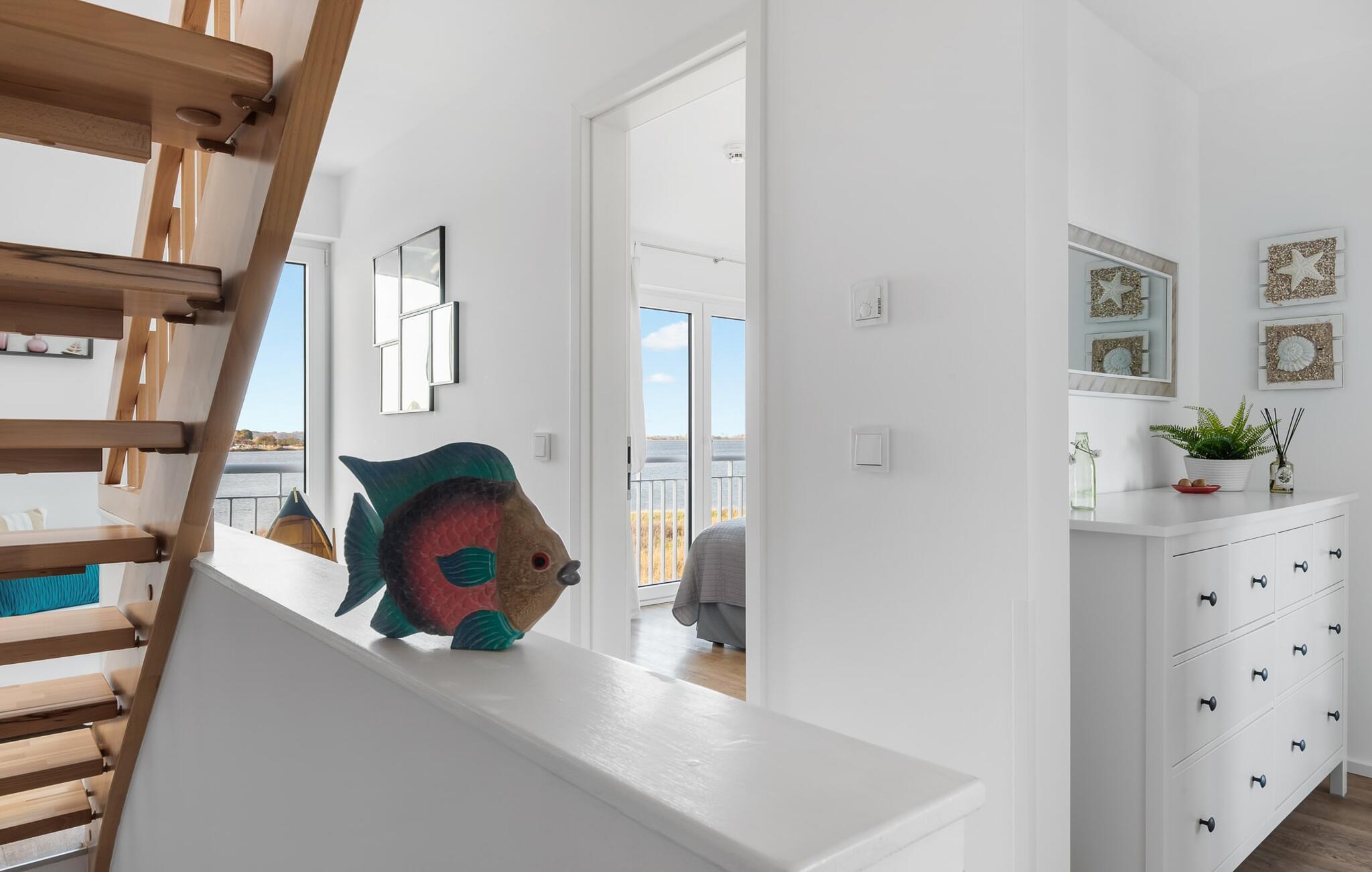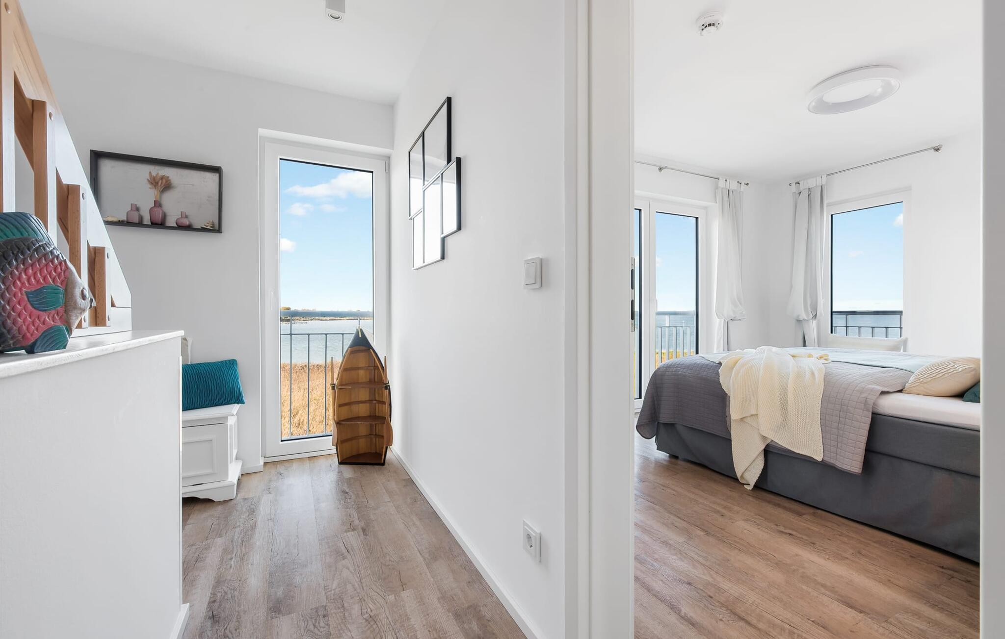 Im ersten Obergeschoss befinden sich zwei helle Schlafzimmer mit direktem Wasserblick beim Einschlafen und Aufwachen. Das Hauptschlafzimmer ist zur Schlei ausgerichtet und mit einem Doppelbett ausgestattet. Das zweite Schlafzimmer erlaubt einen Blick auf die Marina und verfügt ebenfalls über ein komfortables Doppelbett. Beide Schlafzimmer sind verdunkelbar. Eine Schlafcouch im Studio bietet einen komfortablen Schlafplatz bei traumhaften Aussichten.