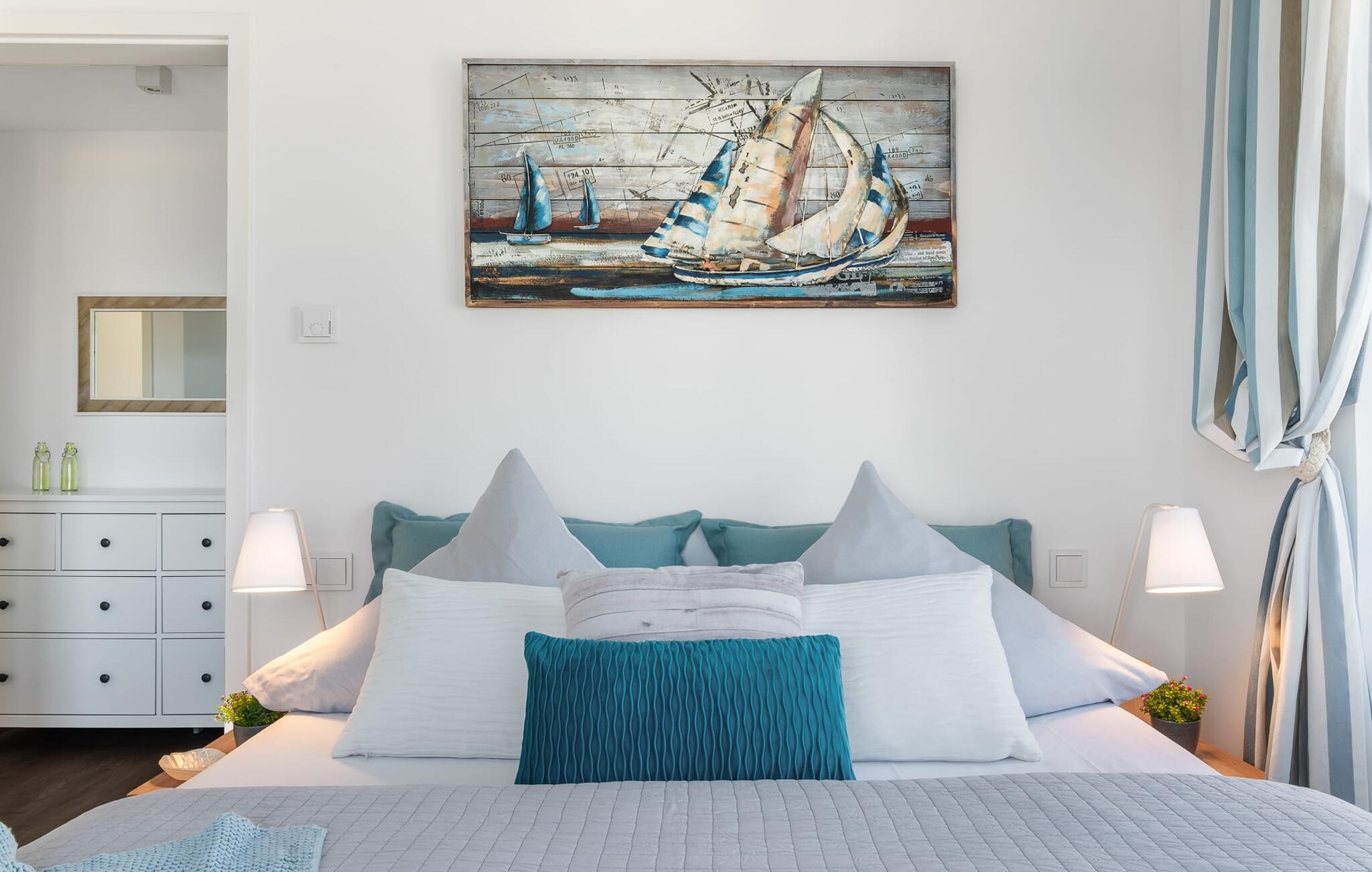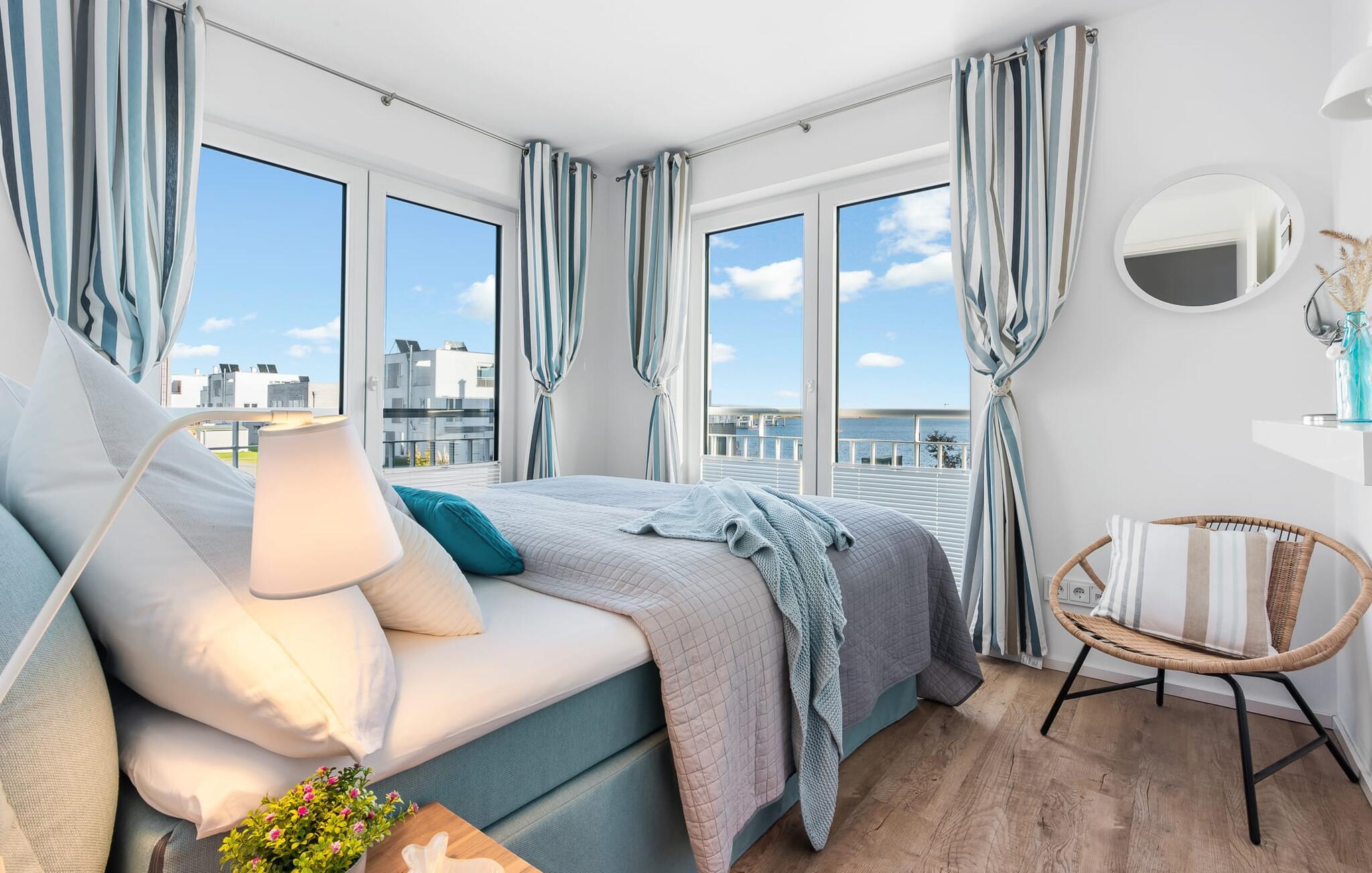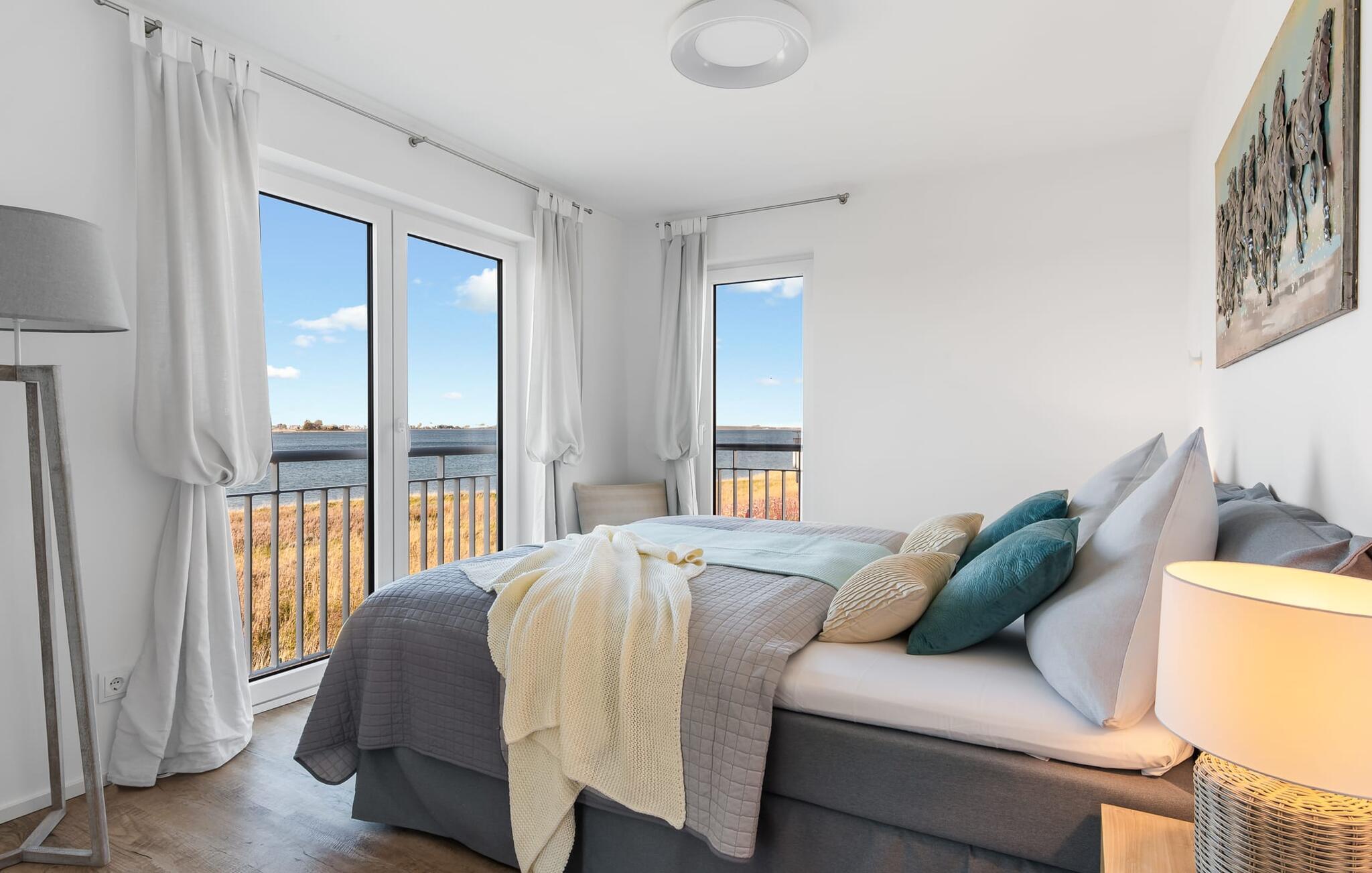 Im ersten Obergeschoss befinden sich zwei helle Schlafzimmer mit direktem Wasserblick beim Einschlafen und Aufwachen. Das Hauptschlafzimmer ist zur Schlei ausgerichtet und mit einem Doppelbett ausgestattet. Das zweite Schlafzimmer erlaubt einen Blick auf die Marina und verfügt ebenfalls über ein komfortables Doppelbett. Beide Schlafzimmer sind verdunkelbar. Eine Schlafcouch im Studio bietet einen komfortablen Schlafplatz bei traumhaften Aussichten.