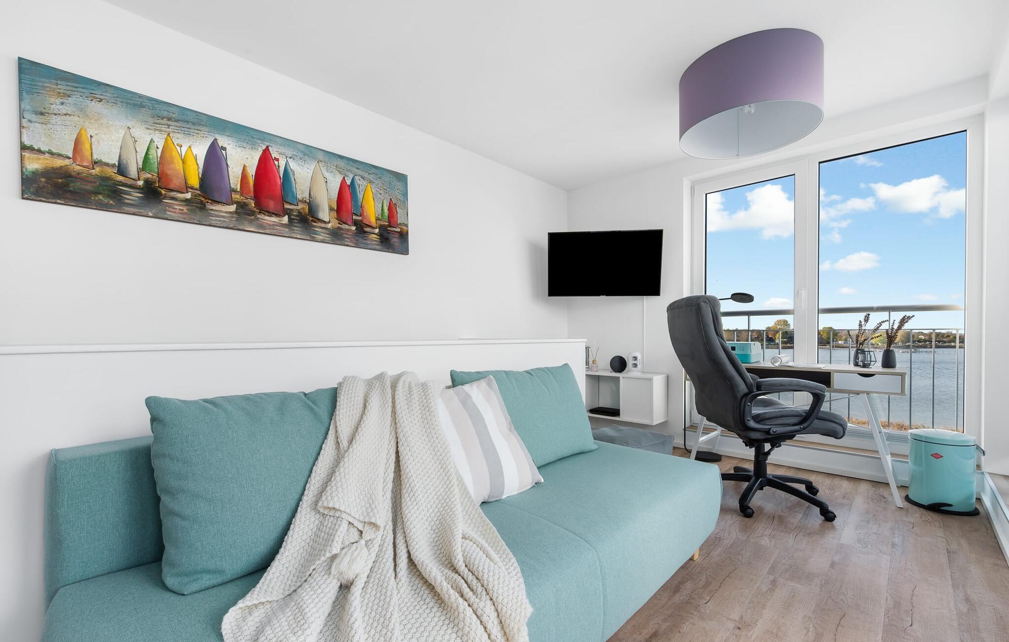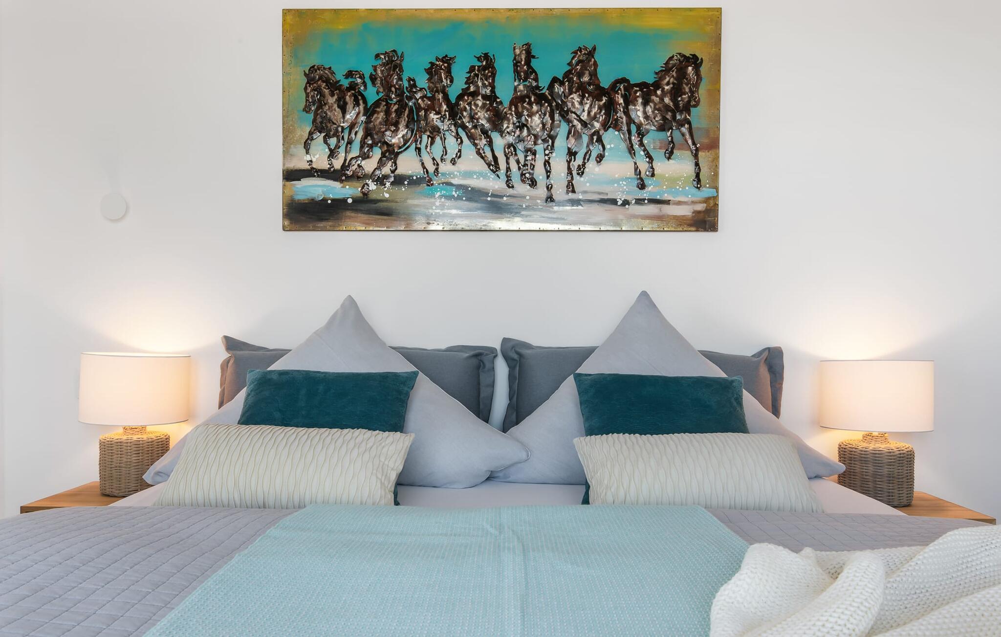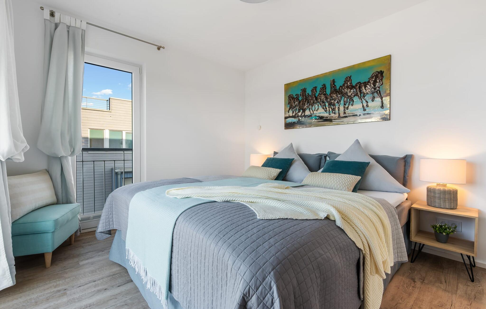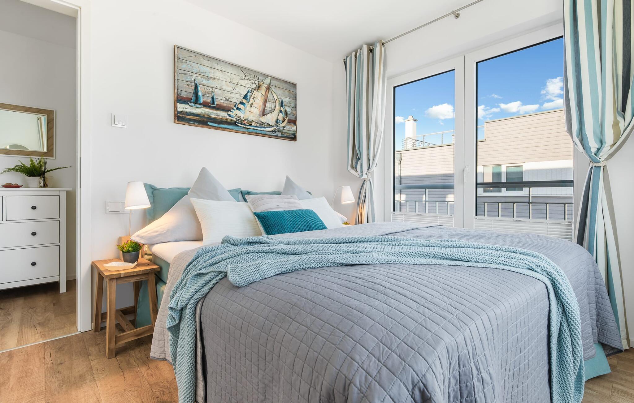 Im ersten Obergeschoss befinden sich zwei helle Schlafzimmer mit direktem Wasserblick beim Einschlafen und Aufwachen. Das Hauptschlafzimmer ist zur Schlei ausgerichtet und mit einem Doppelbett ausgestattet. Das zweite Schlafzimmer erlaubt einen Blick auf die Marina und verfügt ebenfalls über ein komfortables Doppelbett. Beide Schlafzimmer sind verdunkelbar. Eine Schlafcouch im Studio bietet einen komfortablen Schlafplatz bei traumhaften Aussichten.