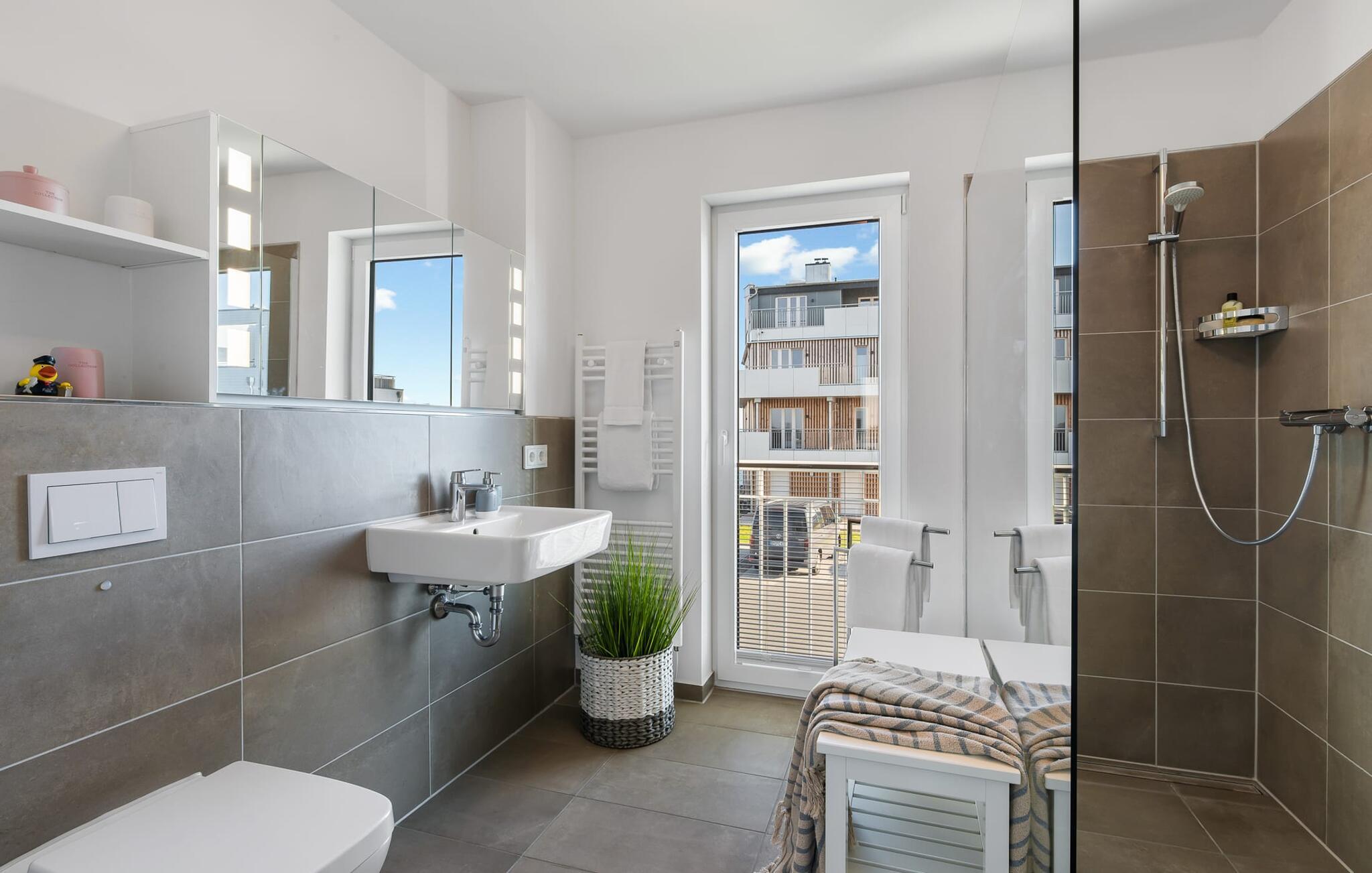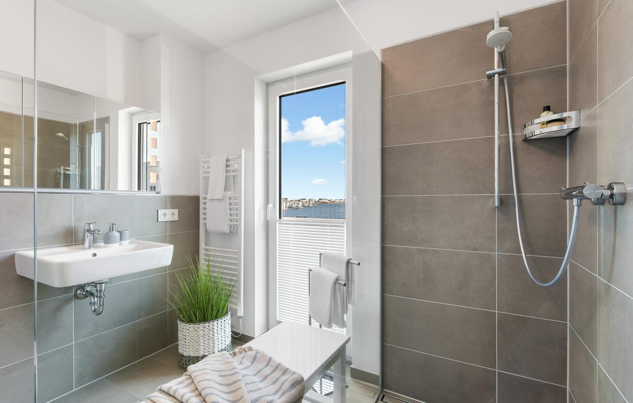 Im ersten Obergeschoss befindet sich ebenfalls das große Badezimmer mit Hafenblick und großer bodengleicher Dusche.