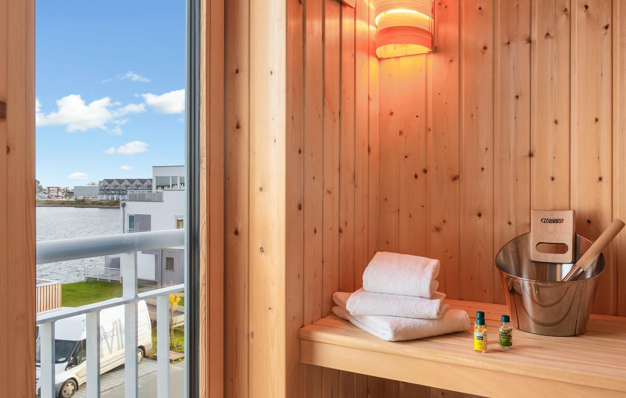 Unser Lieblingsplatz: In der finnischen Sauna entspannen und das bunte Treiben auf dem Hafen beobachten