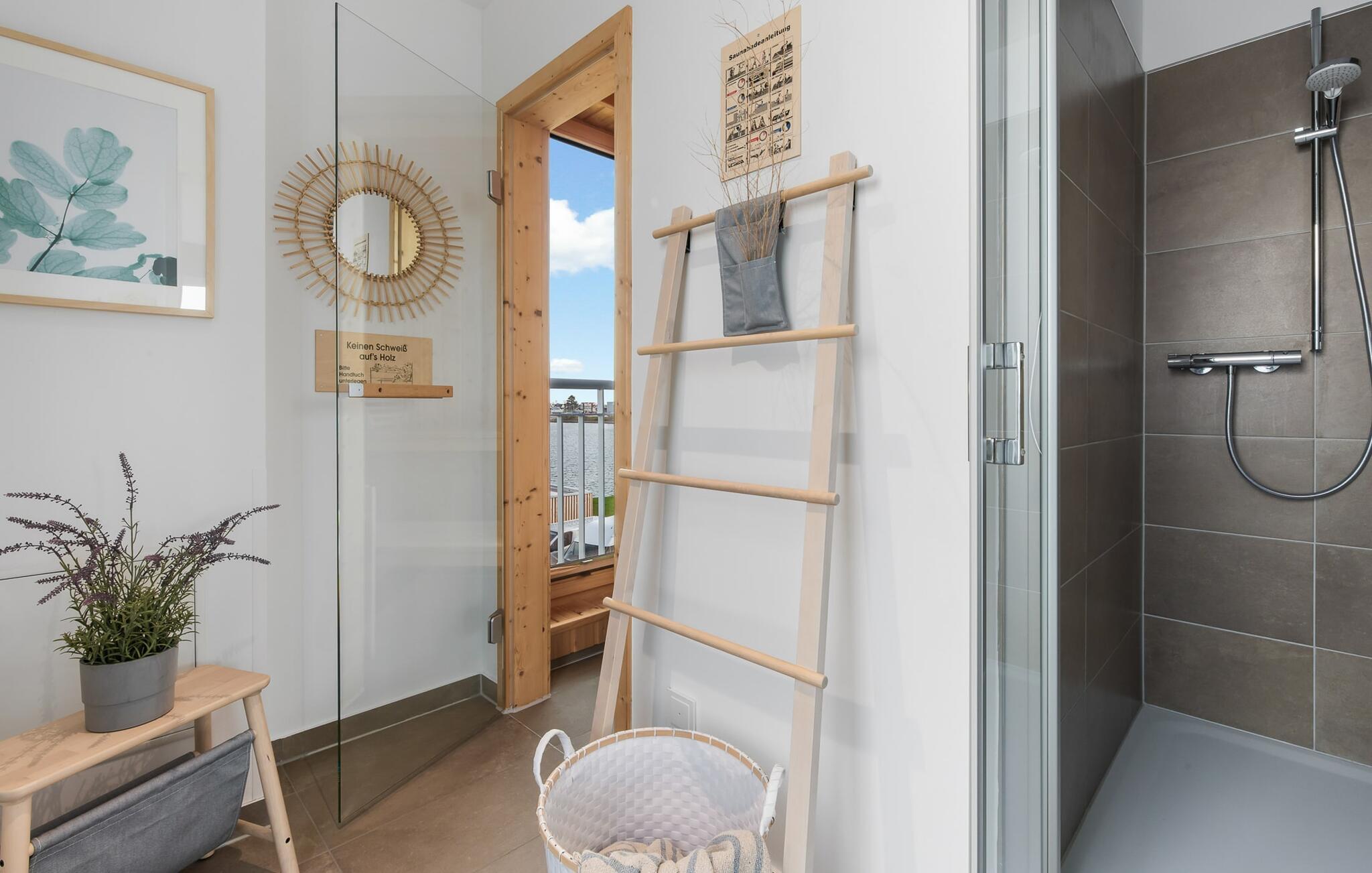 Die finnische Sauna mit einer weiteren angrenzenden Dusche befindet sich im Studio im 2. OG und lässt Wellness-Herzen höher schlagen.