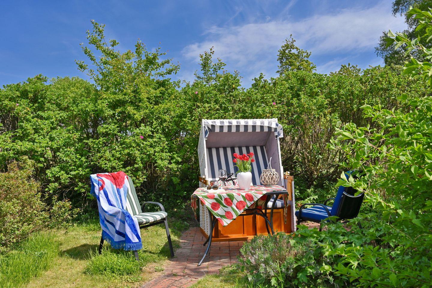 Zu jeder der Wohnungen gehört eine separate Terrasse in der wunderschönen großen Gartenanlage incl. Strandkorb und Gartenmöbeln.