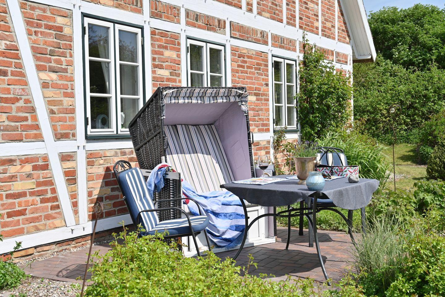 Im eigenen Strandkorb auf der gemütlichen Terrasse mit herrlichem Blick in den Garten und auf die umliegende ruhige Landschaft können Sie die Seele baumeln lassen und vom Alltag ausspannen. In der Nähe des Hauses können Sie wunderschön wandern, Rad fahren und die traumhafte Natur genießen.