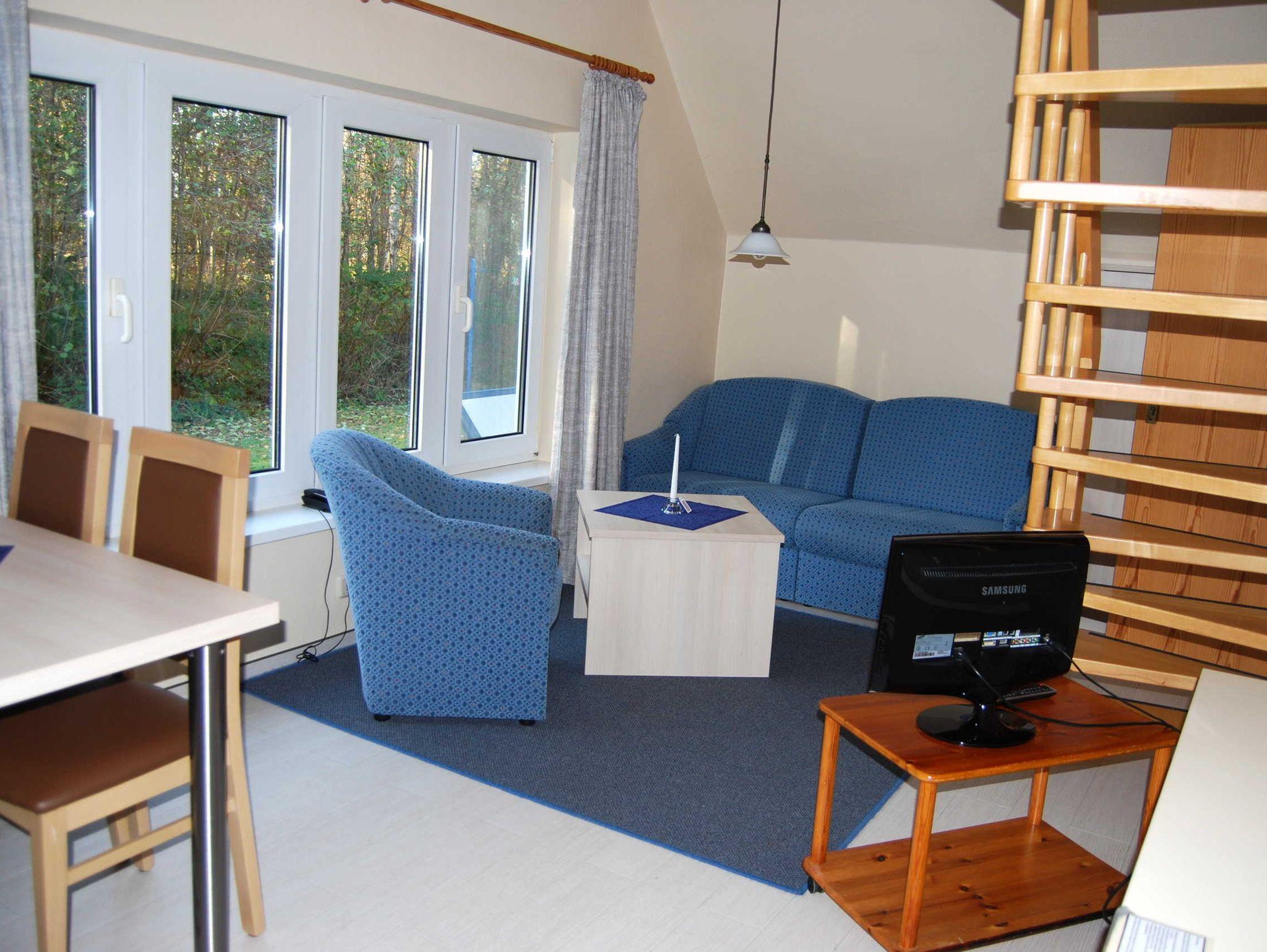 Die Ferienhaushälfte südlich von Vitte ist in Erdgeschoss und Spitzboden aufgeteilt. Der Wohnbereich ist mit einer ausziehbaren Schlafcouch, Sessel, Esstisch, Pantryküche und Farb-TV ausgestattet. Das Bad besitzt Dusche und WC. Eine Raumspartreppe führt zum offenen Schlafraum mit zwei Betten unter dem Spitzdach.