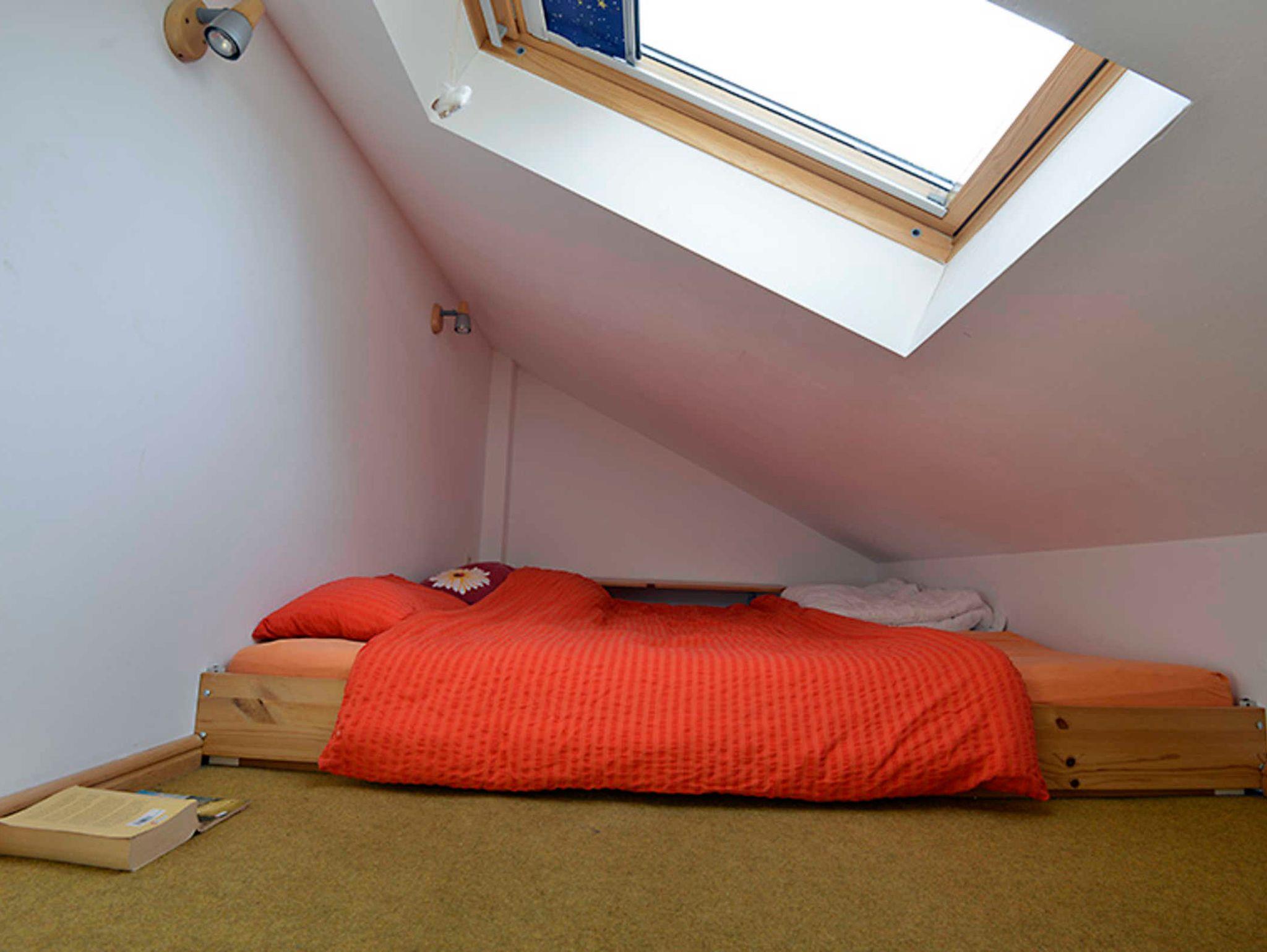 Vom Eingangsbereich nach rechts geht es durch eine Schiebetür ins Wohnzimmer. Das Fenster des Wohnzimmers liegt nach Süden. Der Raum kann auch als Schlafraum genutzt werden, das Sofa ist ausziehbar. Hier steht der Kleiderschrank, ein Fernseher und das Bücherregal. Über eine steile Stiege erreicht man den Schlafboden mit dem Doppelbett. Die Luke ist immer offen, so dass sich die Räume nicht trennen lassen. Oben gibt es ein Dachfenster mit Verdunkelungsrollo und Insektenschutzgitter. Diese beiden Zimmer sind mit Teppichboden ausgelegt.