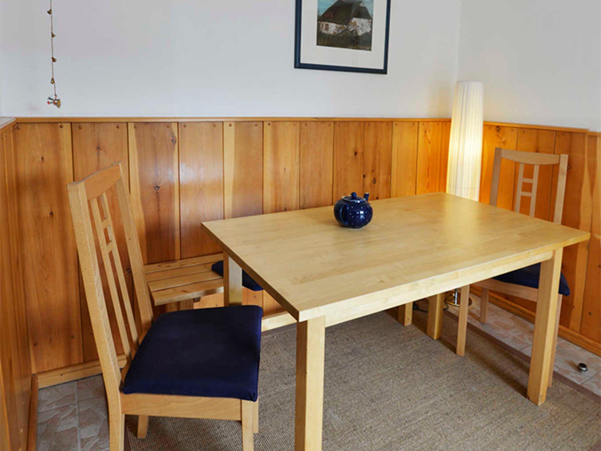 Im Eingangsbereich steht ein Esstisch mit 2 Stühlen und einer Bank. Im Schrank gibt es einige Gesellschaftsspiele.