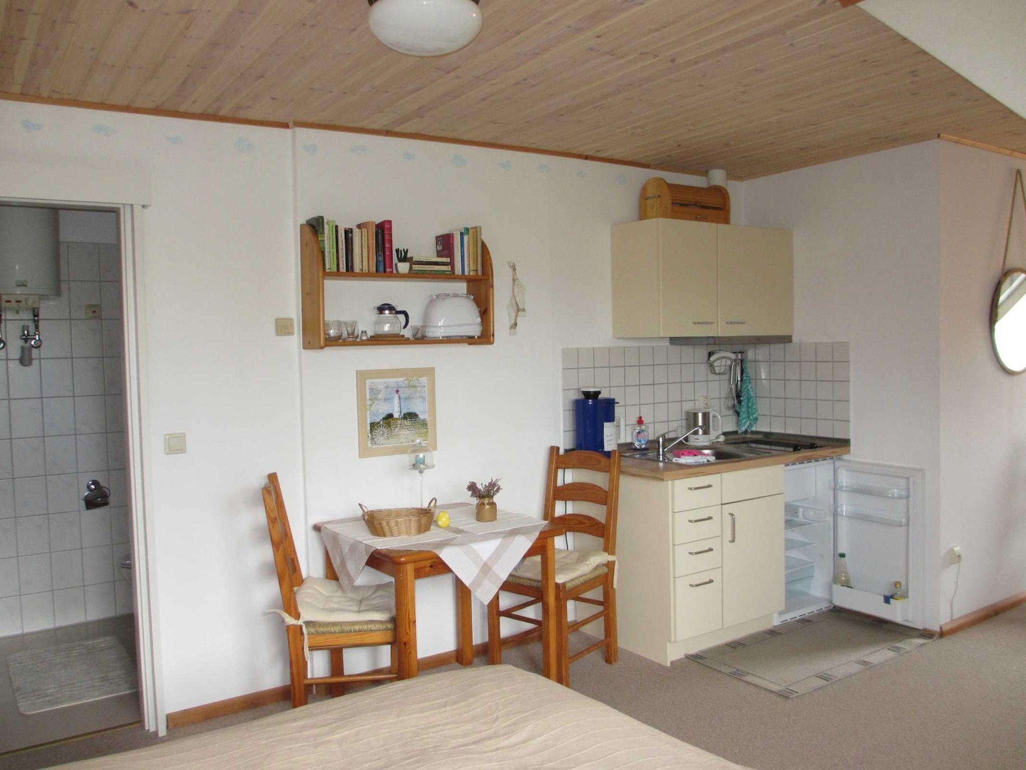 Diese Ferienwohnung befindet sich in der oberen Etage auf der Nordseite des Hauses und hat eine Größe von ca. 25 m² inkl. Dachschrägen. Am Tage können Sie von dort den Leuchtturm sehen und Nachts scheint dieser in Ihr Fenster, wenn Sie mögen! Da auch die Hafeneinfahrt von Kloster mit den davor liegenden Salzwiesen zu sehen ist, können Sie beobachten wie die Schiffen „über die Wiese fahren“. Die Aufteilung der Ferienwohnung beinhaltet einen kombinierten Wohn-Schlafraum mit Küchenzeile und Bad mit Dusche und WC. Zur Ausstattung gehören ein Doppelbett mit einer Gesamtgröße von 1,60m x 2,00 m. Weiterhin stehen W-LAN, ein Fernseher und Radio mit CD-Player zur Verfügung. Die Küche hat folgende Ausstattung, Miniküche mit Kühlschrank inkl. kleinem Gefrierfach, Kaffeeautomat, Wasserkocher, Toaster sowie div. Geschirr und Küchenutensilien.
