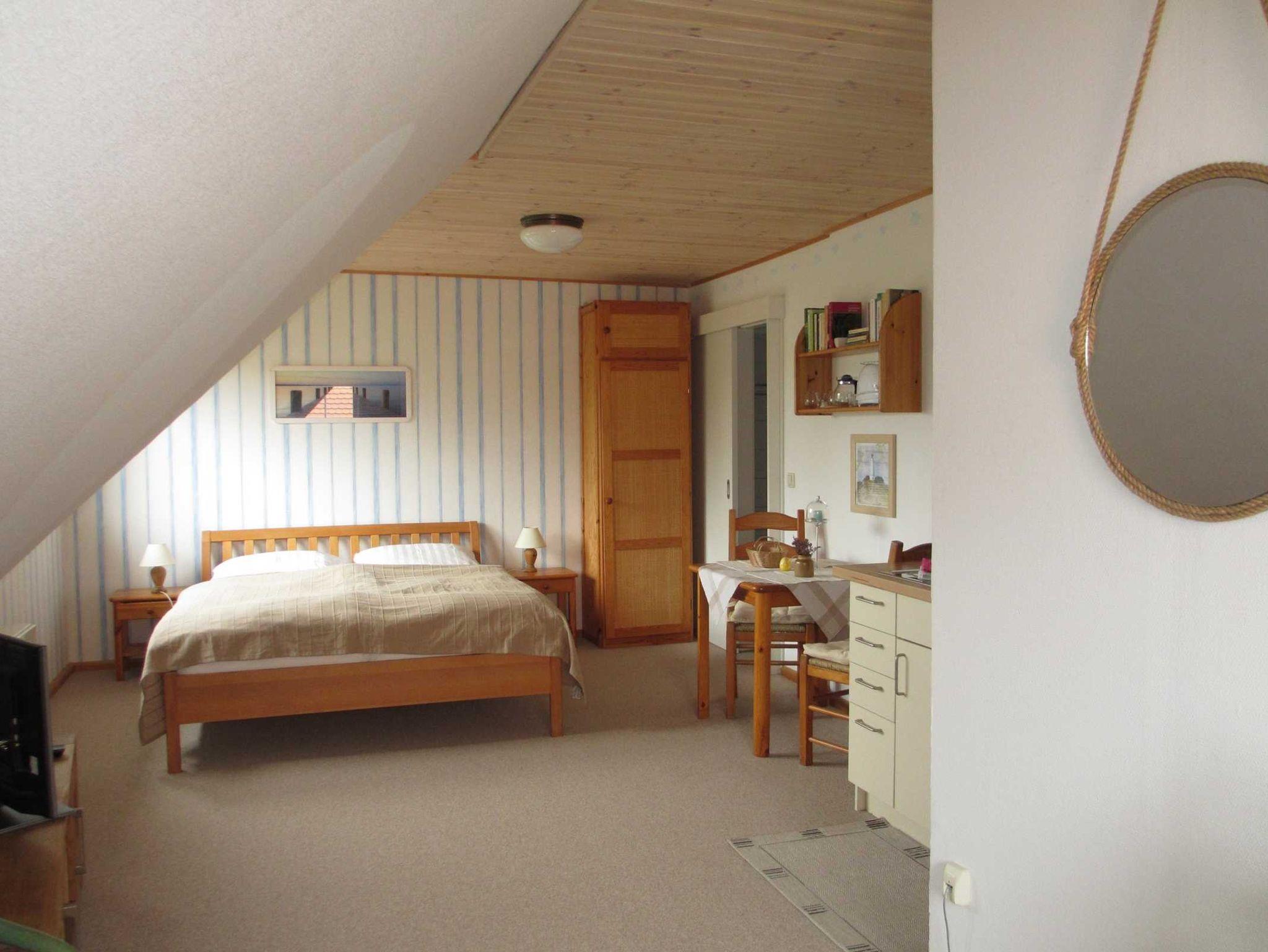 Diese Ferienwohnung befindet sich in der oberen Etage auf der Nordseite des Hauses und hat eine Größe von ca. 25 m² inkl. Dachschrägen. Am Tage können Sie von dort den Leuchtturm sehen und Nachts scheint dieser in Ihr Fenster, wenn Sie mögen! Da auch die Hafeneinfahrt von Kloster mit den davor liegenden Salzwiesen zu sehen ist, können Sie beobachten wie die Schiffen „über die Wiese fahren“. Die Aufteilung der Ferienwohnung beinhaltet einen kombinierten Wohn-Schlafraum mit Küchenzeile und Bad mit Dusche und WC. Zur Ausstattung gehören ein Doppelbett mit einer Gesamtgröße von 1,60m x 2,00m. Im Wohnbereich steht, falls eine Aufbettung gewünscht wird, eine Doppelbettcouch. Weiterhin stehen W-LAN, ein Fernseher, Radio mit CD-Player. Die Küche hat folgende Ausstattung, Miniküche mit Kühlschrank inkl. kleinem Gefrierfach, Kaffeeautomat, Wasserkocher, Toaster sowie div. Geschirr und Küchenutensilien.