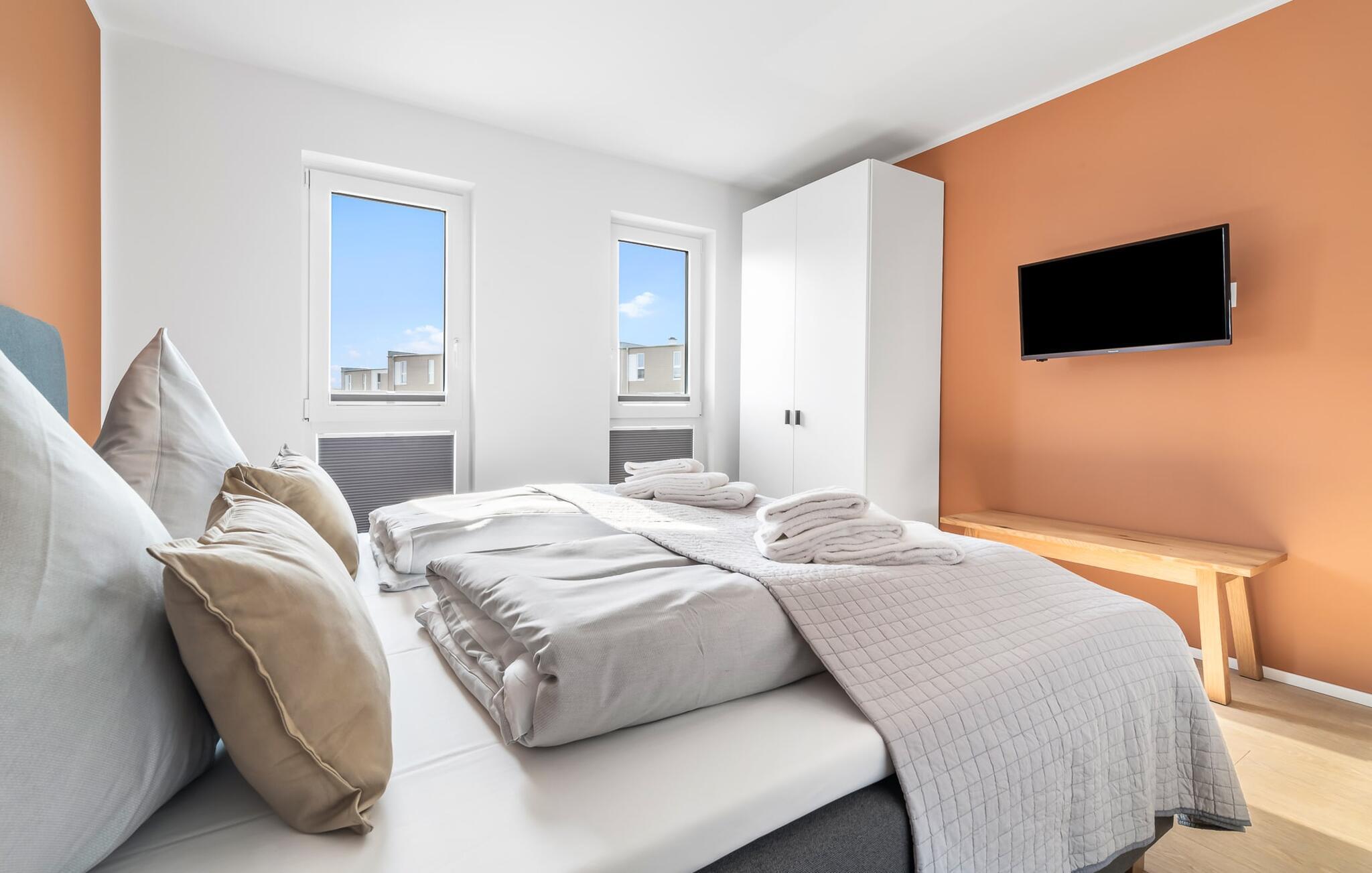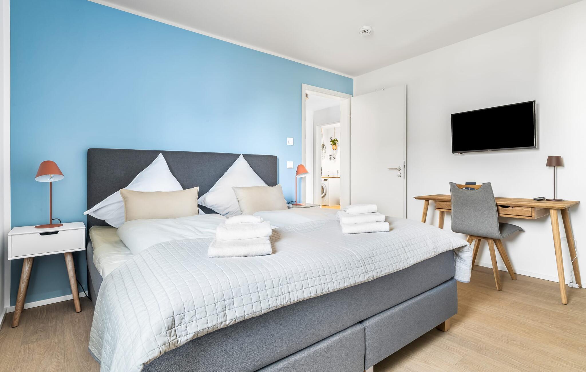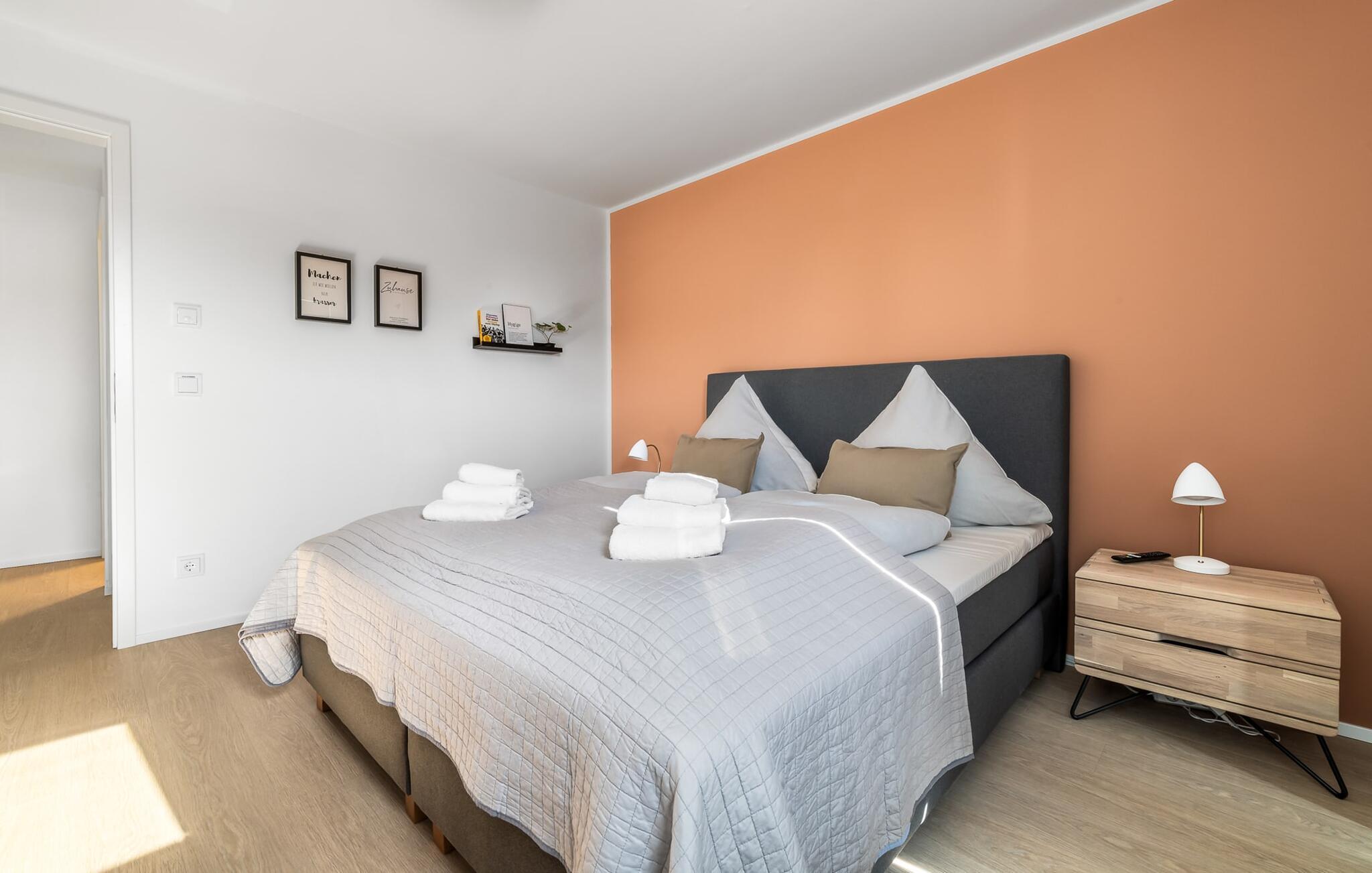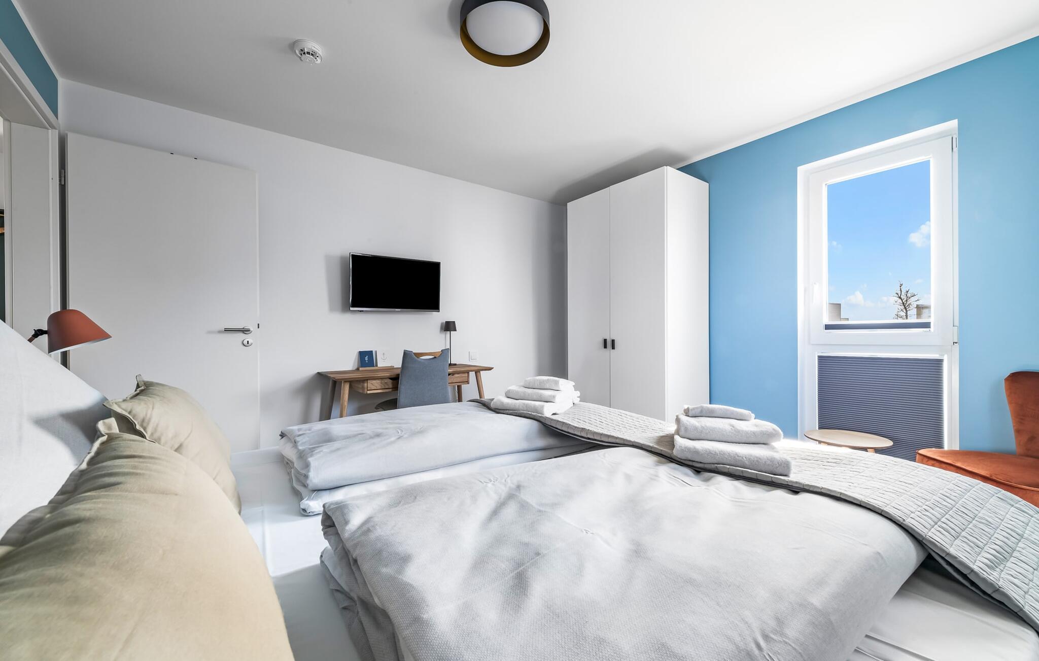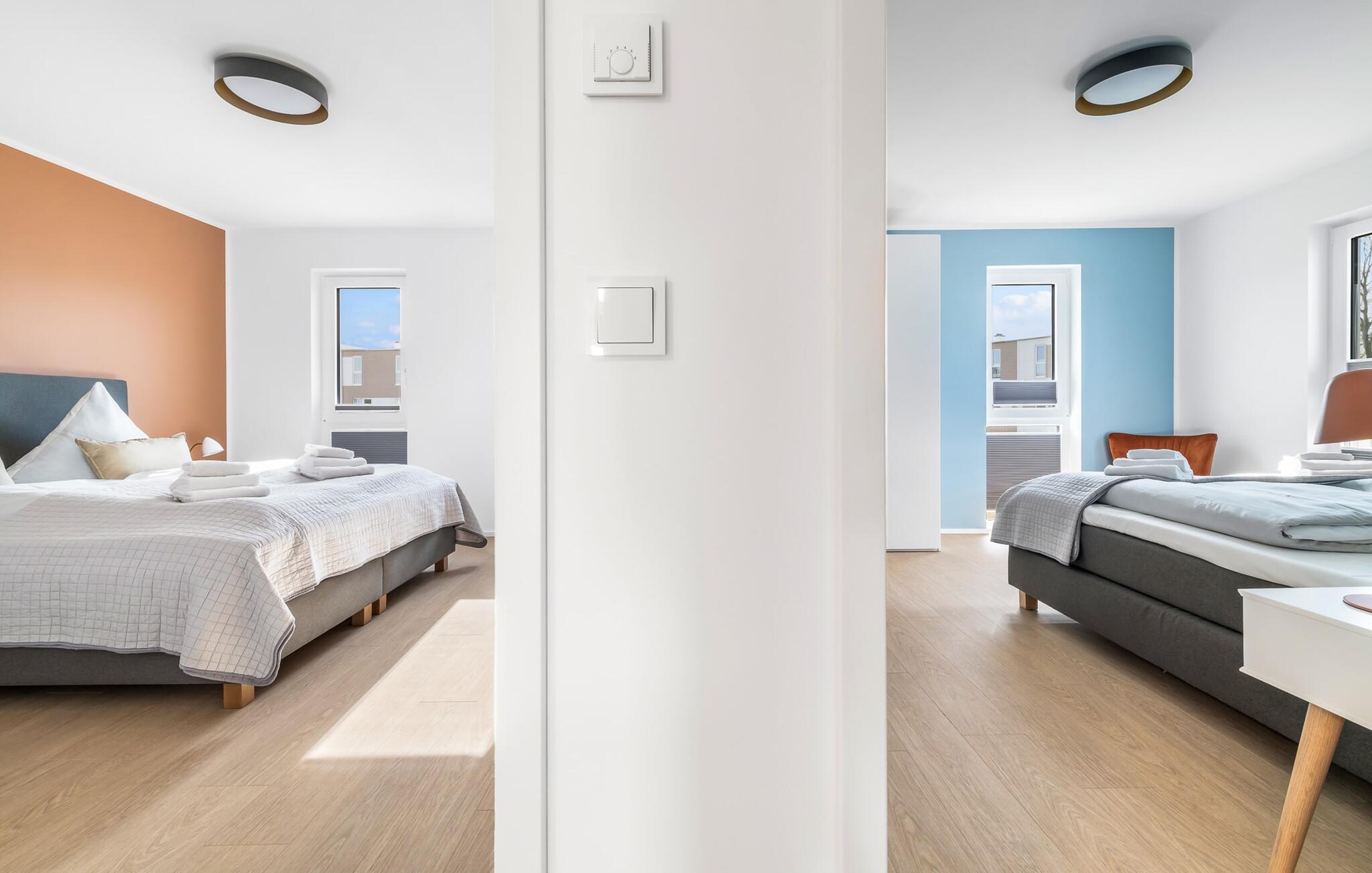 Beim Betreten der Ferienwohnung im ersten Obergeschoss beginnt vom ersten Moment an der Urlaub. Ihr befindet euch im Ruhebereich der Wohnung. In dieser Etage stehen euch drei Schlafzimmer zur Verfügung. Egal für welches ihr euch entscheidet, erholsame Nächte sind euch sicher. Zwei Schlafzimmer sind mit großzügigen Doppelbetten ausgestattet, während das dritte Schlafzimmer über zwei Einzelbetten verfügt, welche sich jeweils zu einem vollwertigen Doppelbett umwandeln lassen. In allen Schlafzimmern findet ihr einen Flatscreen-TV.