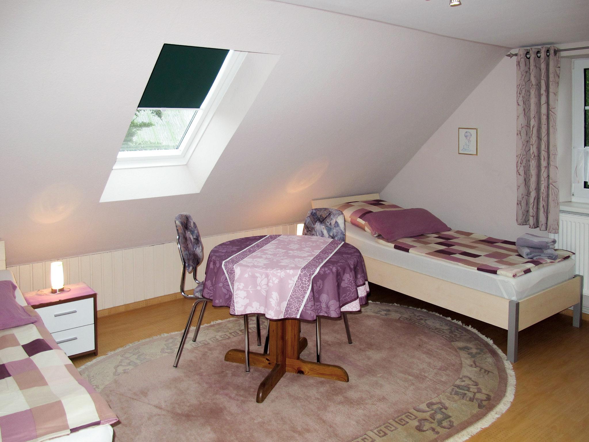 3-Zimmer-Doppelhaushälfte 110 m2 auf 2 Stockwerken. Gemütlich eingerichtet: Wohnzimmer mit Sat-TV, Radio und CD. Ausgang zur Terrasse. Offene Küche (Backofen, Geschirrspüler, 4 Glaskeramikplatten, Toaster, Wasserkocher, Mikrowelle, Tiefkühler, elektrische Kaffeemaschine) mit Esstisch. Ausgang zur Terrasse. Dusche/WC. Obergeschoss: 1 abgeschrägtes Zimmer mit 1 Doppelbett. 1 abgeschrägtes Zimmer mit 2 Betten. G-Heizung. Teppichboden. Terrasse, Ostlage, Gartensitzplatz, Südlage. Terrassenmöbel, Gartengrill (mobil), Liegestühle (4). Zur Verfügung: Kinderhochstuhl, Babybett. Internet (Wireless LAN, gratis). Parkplatz (1 Auto) beim Haus. Bitte beachten: Nichtraucher-Haus. Rauchmelder, Feuerlöscher.