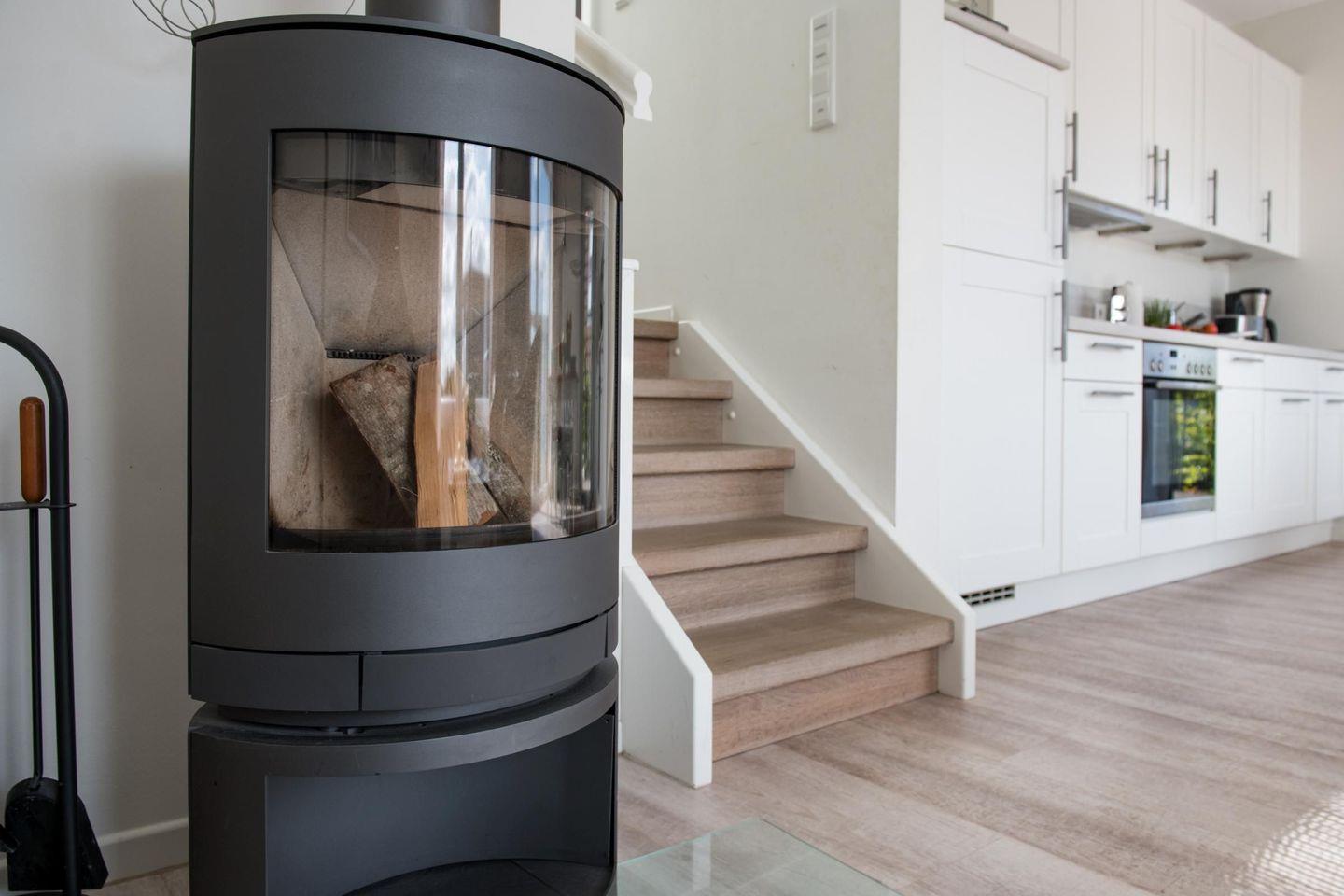 Erste Ebene: Wohnküche und Essbereich mit Kaminofen