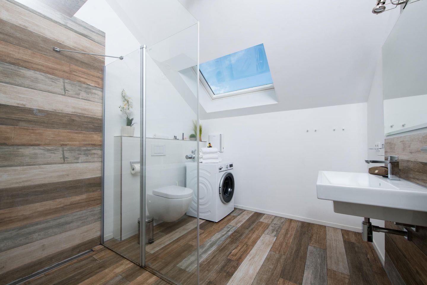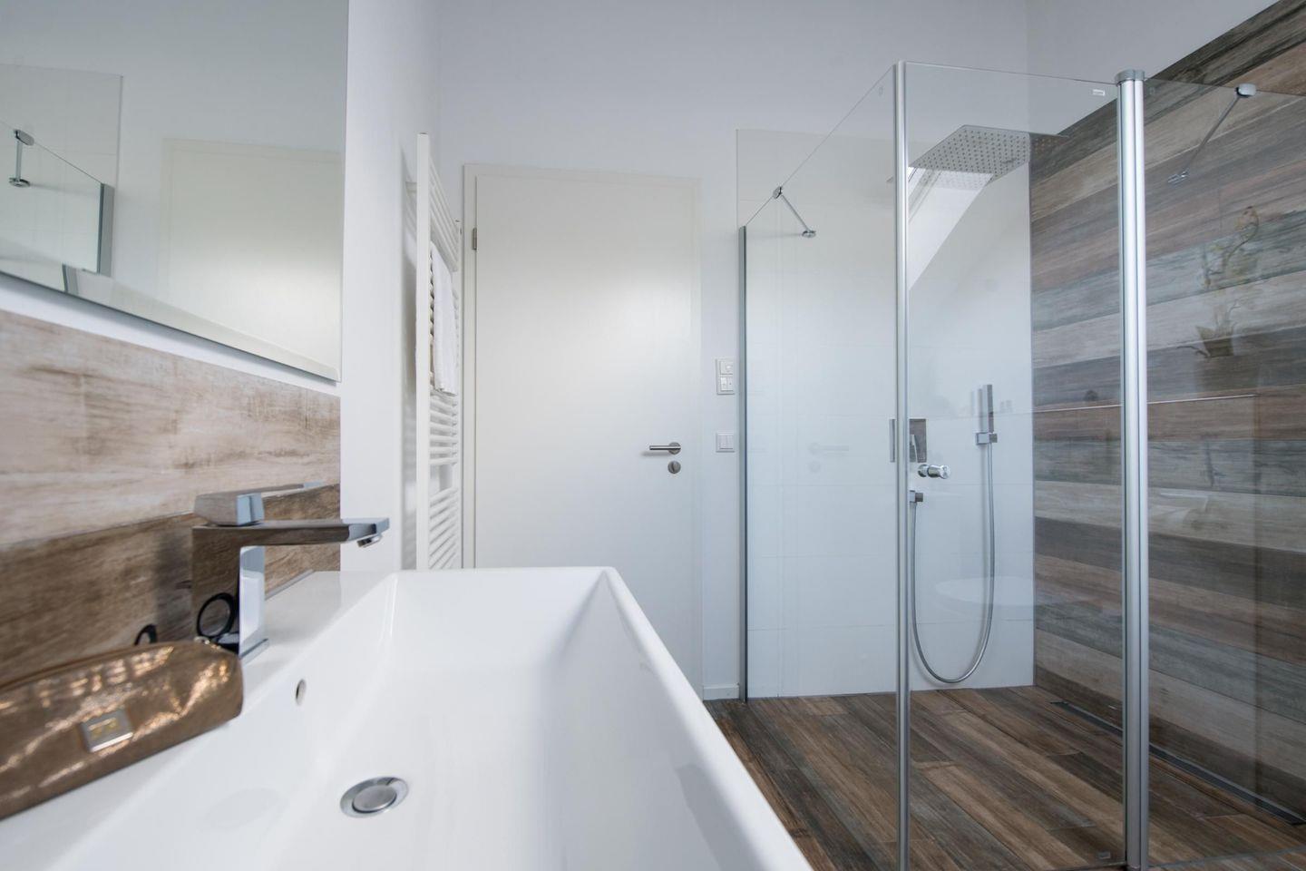 Zweite Ebene: Helles Badezimmer mit gläserner Regenwalddusche