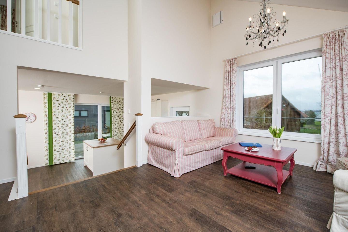 Das offene Wohnzimmer bietet Panoramablick auf Yachthafen und Ostsee.