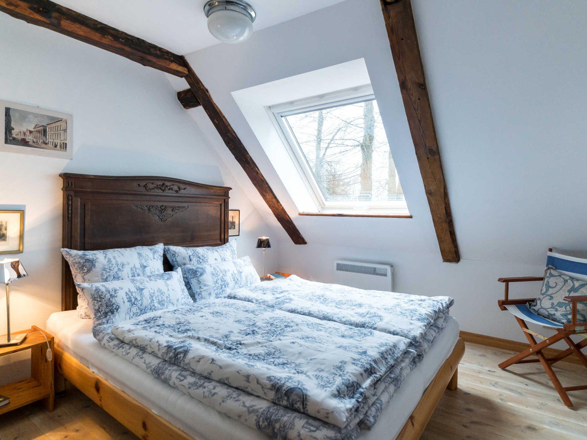 Die Zofenkammer ist eine kleine süße Wohnung (48 qm) im 2. OG des Kavliershauses mit gemütlichem Kaminofen. Der Blick geht in die östliche Lindenallee (Schlafen) und nach Westen über den Ehrenhof.