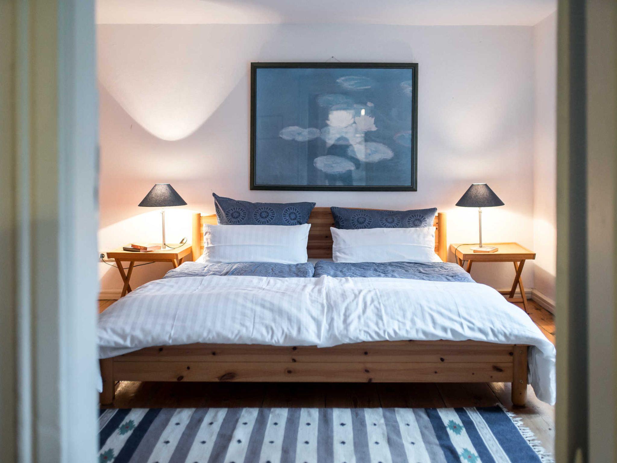 • Schlafzimmer mit Doppelbett (180 cm, fußfrei, Bettdecken in Übergröße)