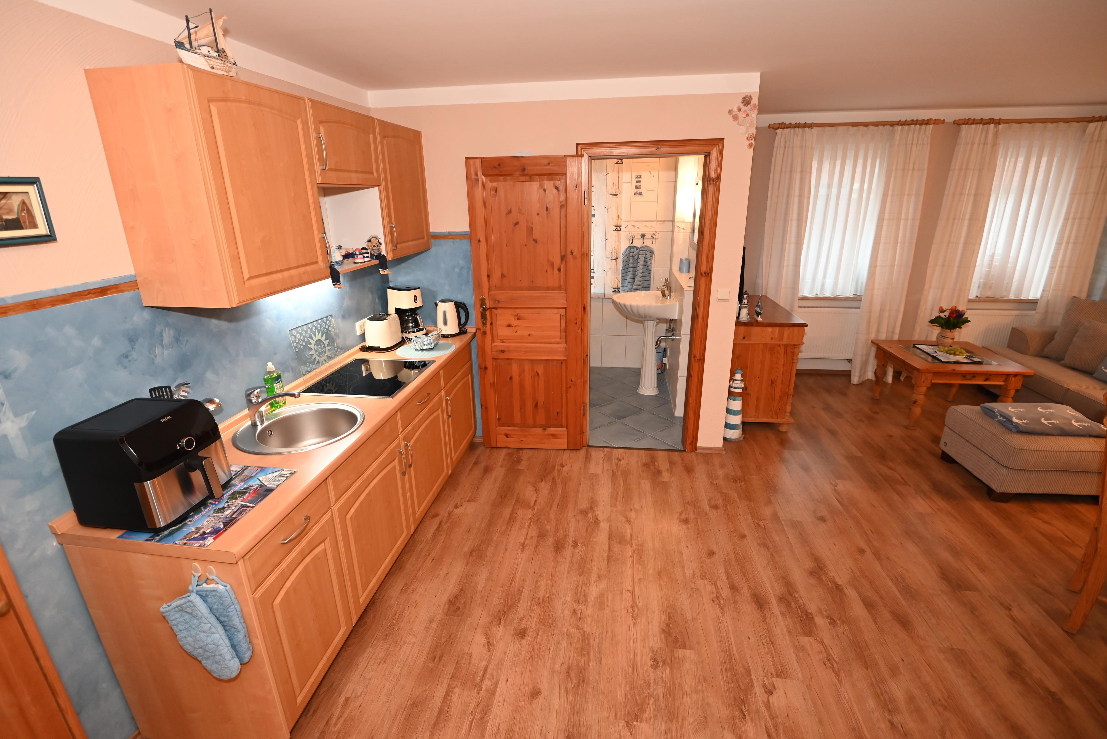 KÜCHENZEILE mit Spülmaschine, Kühlschrank mit Gefriermöglichkeit, 4er-Cerankochfeld, Heißluftfriteuse, Kaffeemaschine, Wasserkocher, Toaster und vielen weiteren Kochutensilien