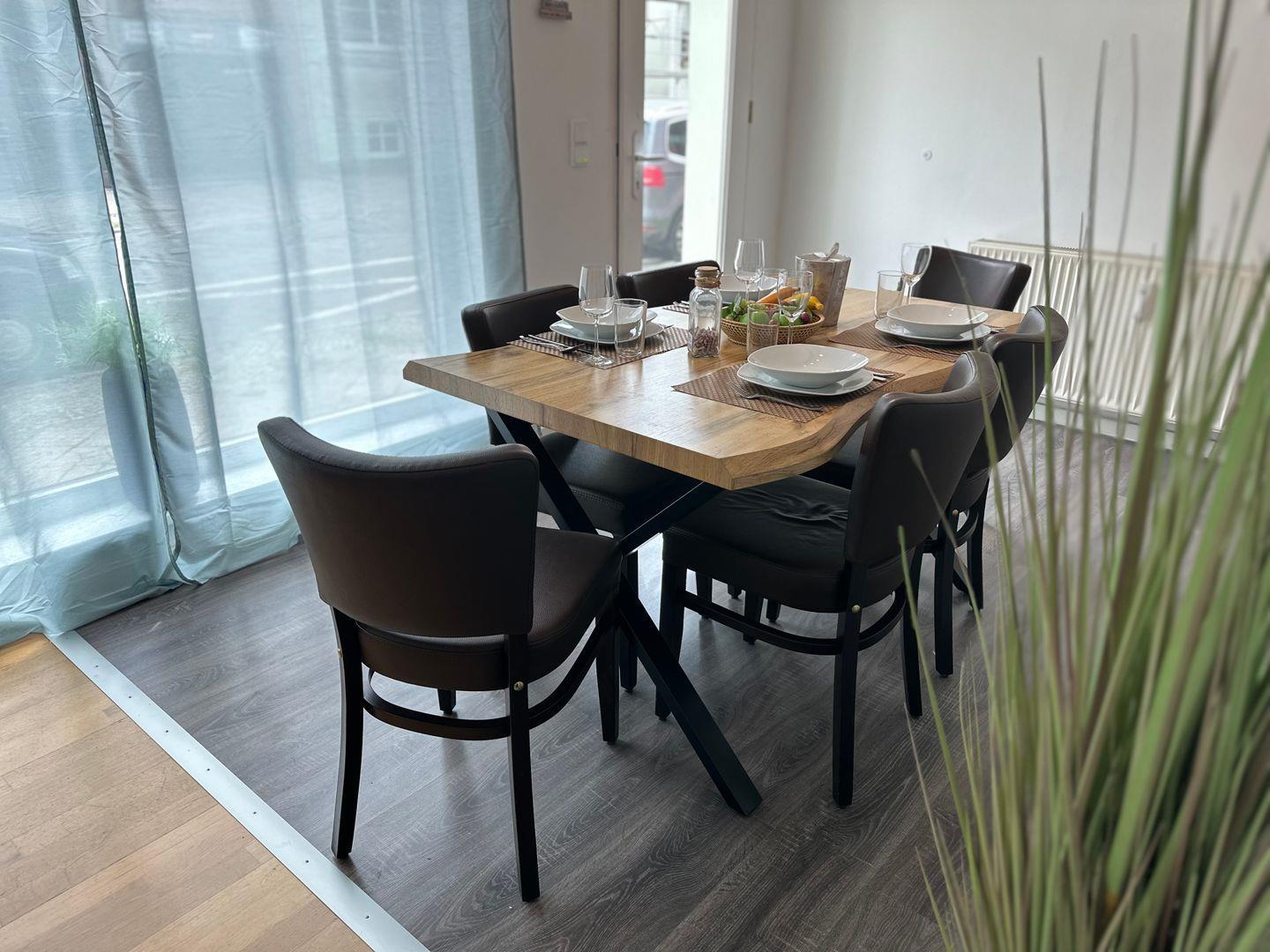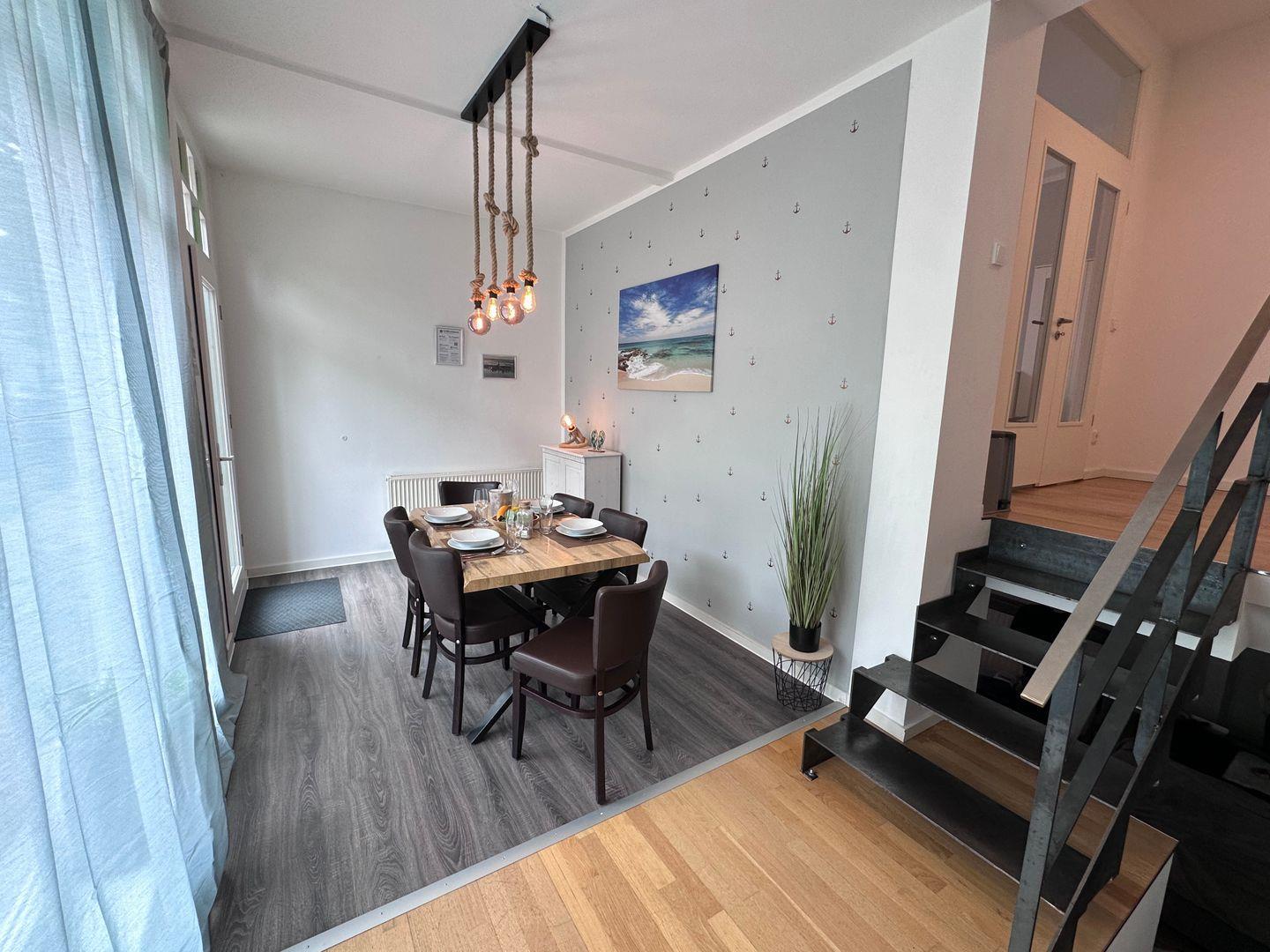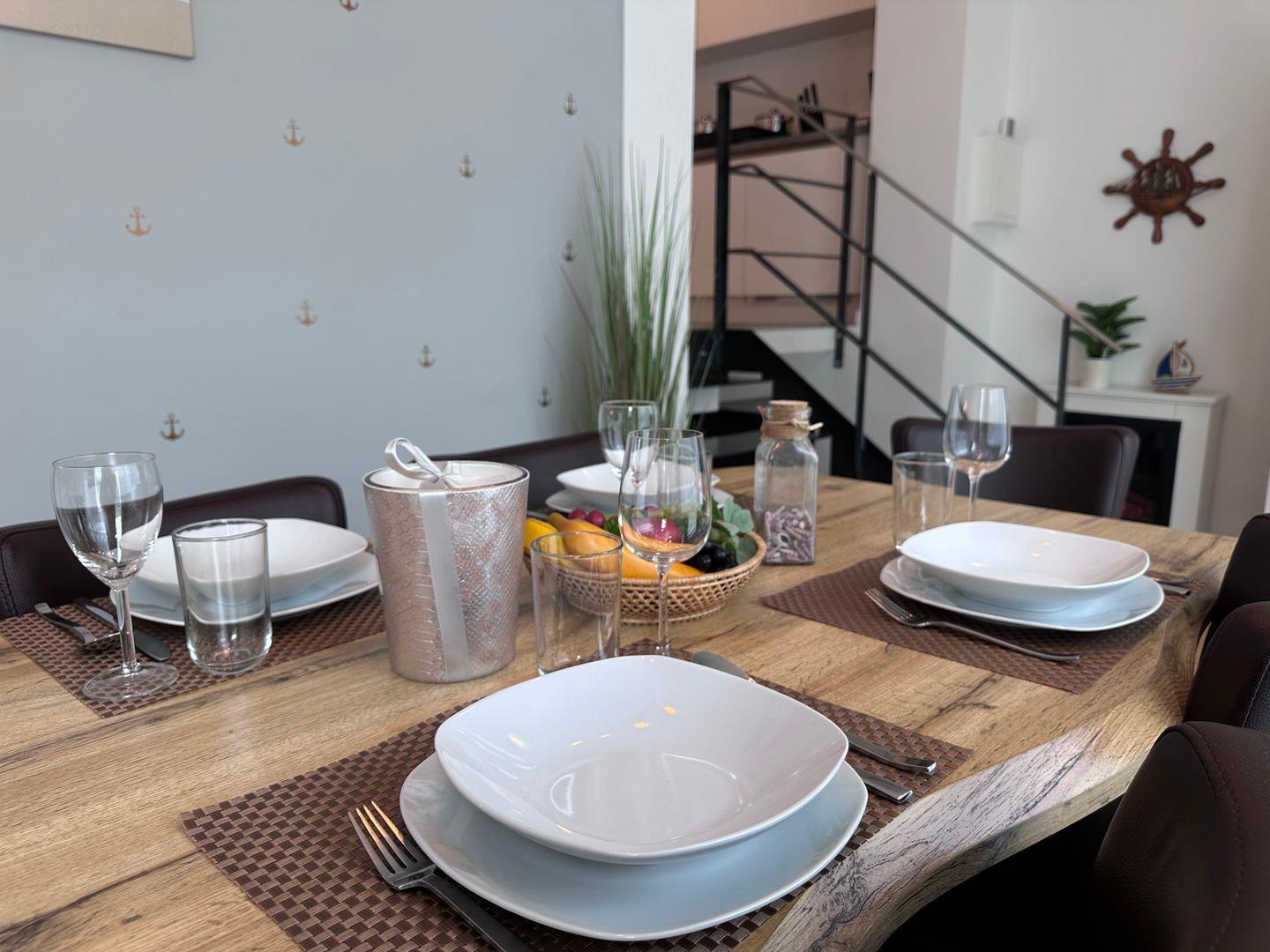 Durch die Eingangstür kommend stehen Sie in dem wunderschönen, maritim gestalteten Essraum. Hier finden sechs Personen am zeitgenössischen Esstisch platz. Auch ein Kleiderschrank für Ihre persönlichen Sachen steht hier bereit.