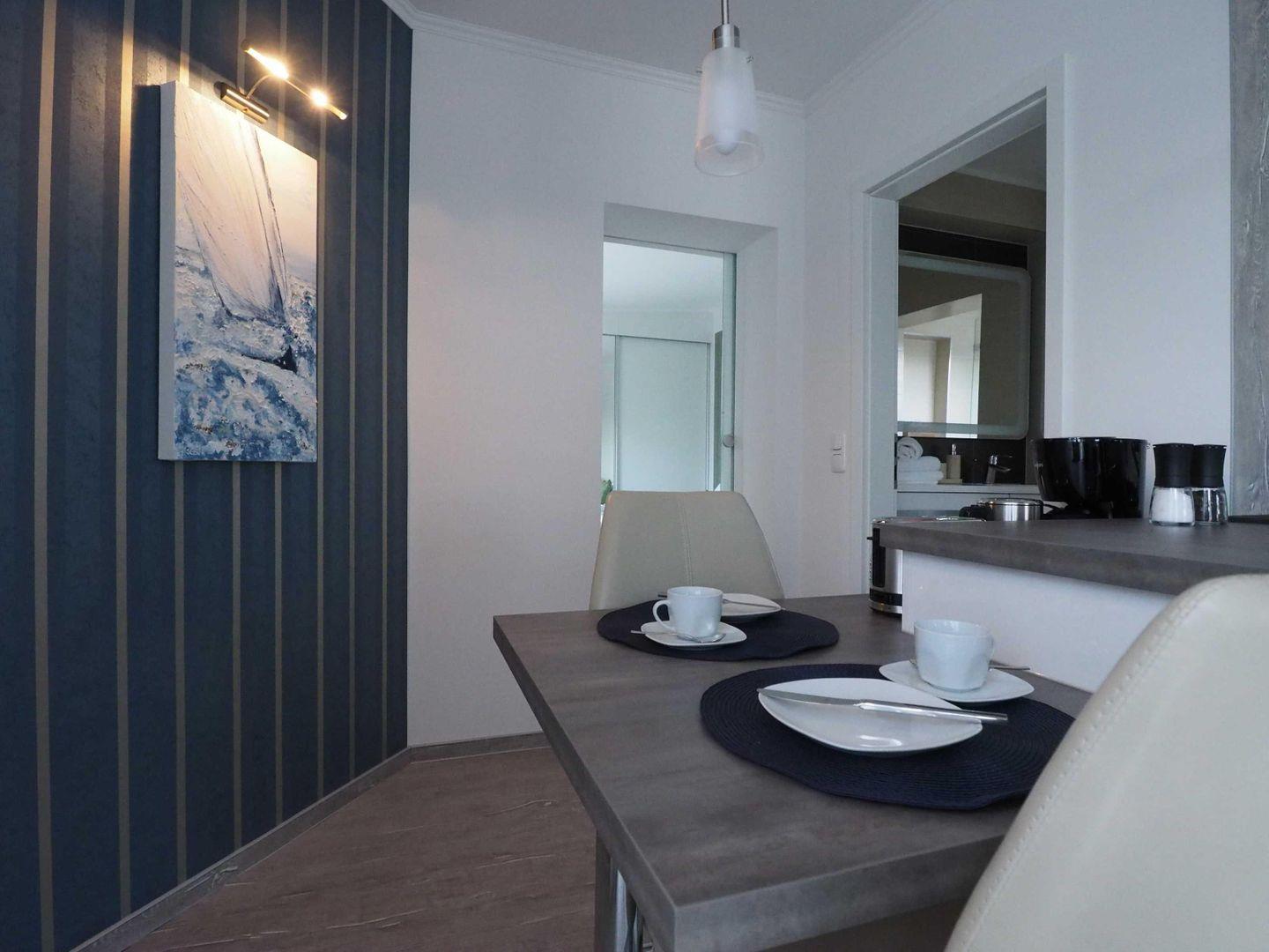 Das helle und freundlich gestaltete Wohnzimmer lädt mit einer großzügigen Wohnlandschaft und einer bequemen Schlafcouch zum Entspannen ein. Ob gemütliche Fernsehabende oder ein gutes Glas Wein nach einem erlebnisreichen Tag – hier können Sie die Seele baumeln lassen. Die integrierte Küchenzeile ist hervorragend ausgestattet und bietet alles, was Sie für Ihren Aufenthalt benötigen: ein Kühlschrank mit Gefrierfach, ein Herd mit 4-Platten-Ceranfeld, ein Geschirrspüler, ein Wasserkocher, eine Kaffeemaschine und ein Toaster. Der angrenzende Essbereich fügt sich harmonisch in den Wohnraum ein und ist der perfekte Ort für gemeinsame Mahlzeiten.