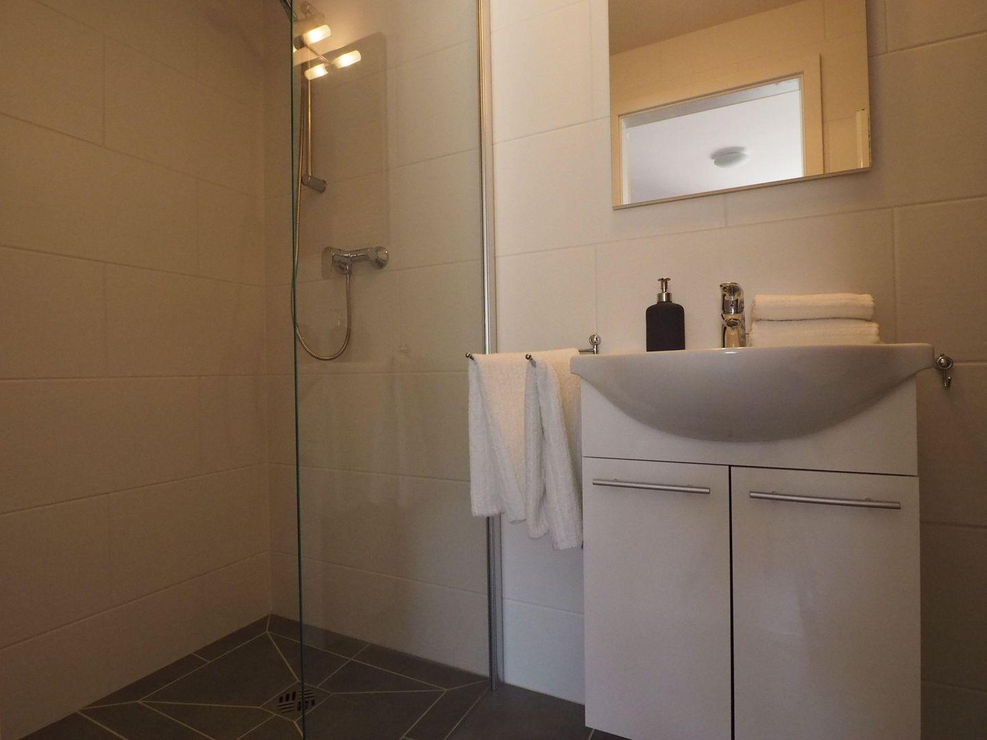 Das separate Schlafzimmer mit komfortablem Doppelbett und großem Kleiderschrank sorgt für erholsamen Schlaf und genügend Stauraum für Ihr Gepäck. Vom Schlafzimmer aus gelangen Sie direkt in das moderne Badezimmer mit Dusche und Waschtisch.