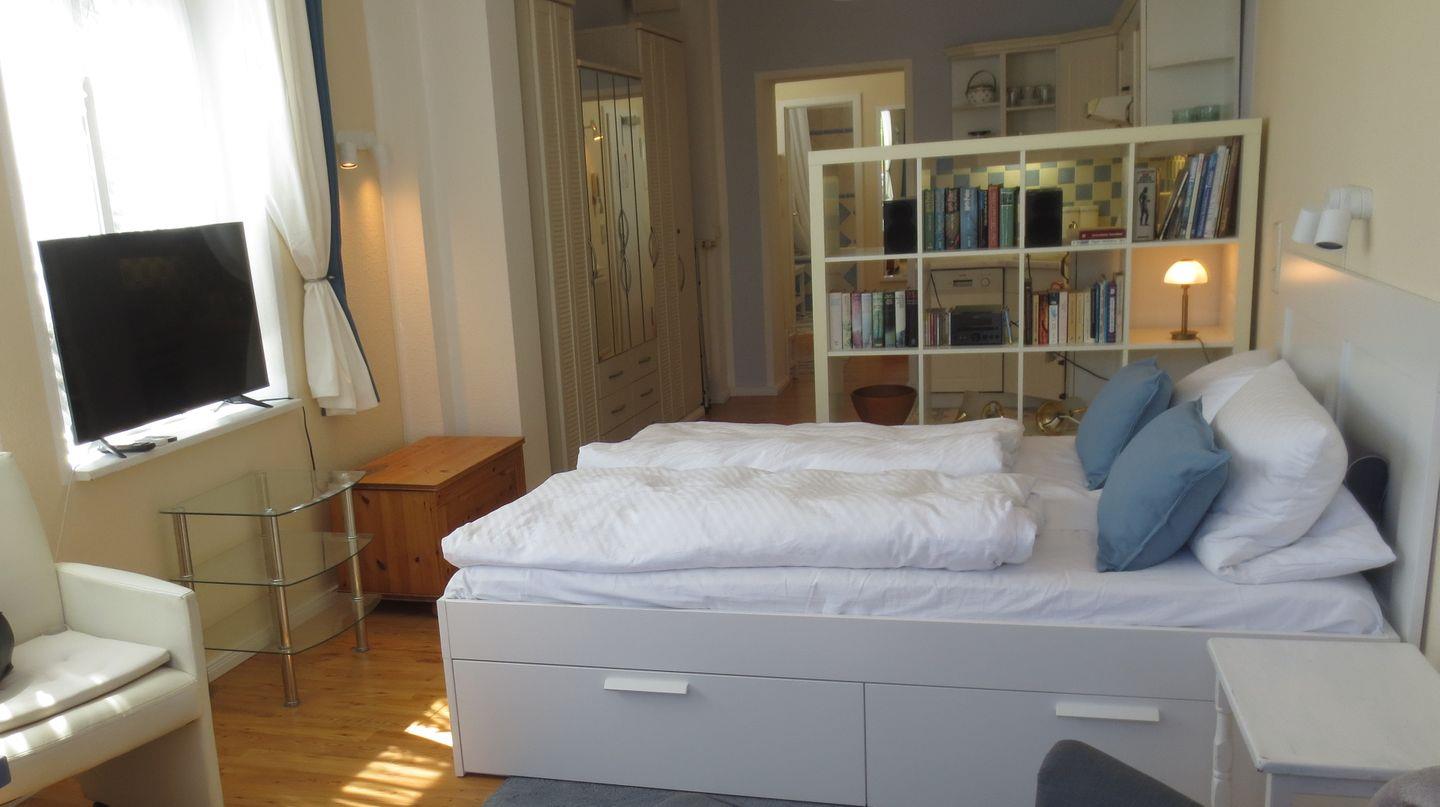 Gemütliche 1-Zimmer-Ferienwohnung mit Balkon und Blick auf den Alten Strom in Warnemünde.