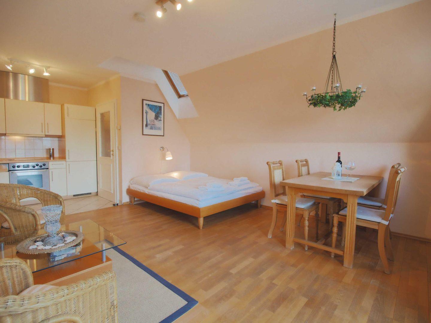 Die geschmackvoll eingerichtete Ferienwohnung bietet einen kombinierten Wohn-Schlafbereich, der mit einer gemütlichen Sitzecke mit TV und einem Essbereich ausgestattet ist. Die offene Küche ist harmonisch in den Raum integriert und voll ausgestattet. Sie finden dort alles, um ein leckeres Essen bequem zu Hause zuzubereiten.