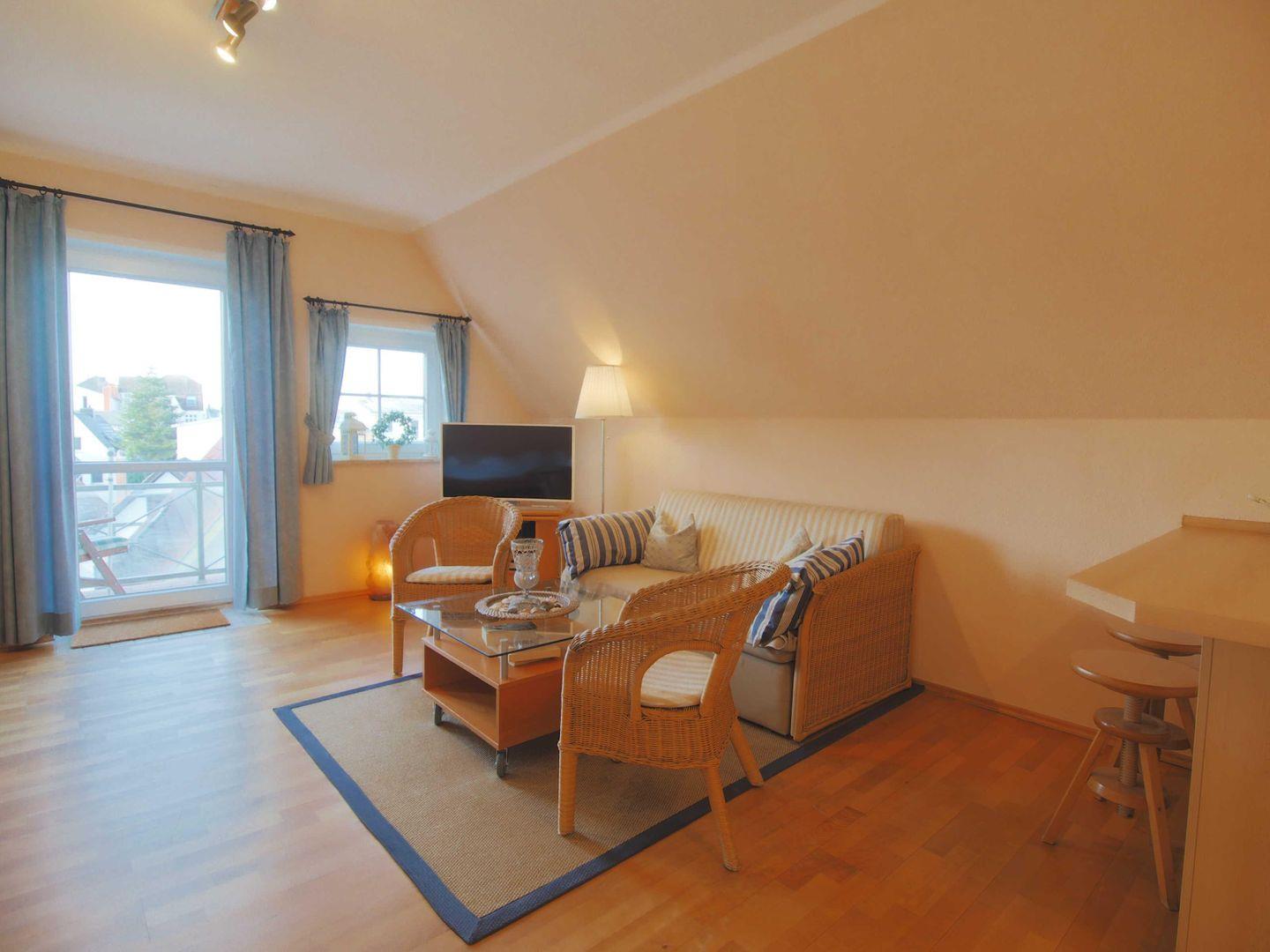 Die charmante 50 qm Ferienwohnung befindet sich im Dachgeschoss, 2.OG, in einer gepflegten, pittoresken Wohnanlage direkt am Alten Strom. Vom Wohnbereich gelangen Sie direkt auf den Balkon. Dieser lädt vor allem in den Sommermonaten dazu ein, den Tag entspannt bei einer Tasse Kaffee oder einem Glas Wein ausklingen zu lassen. Der Blick über die Dächer von Warnemünde ist herrlich.