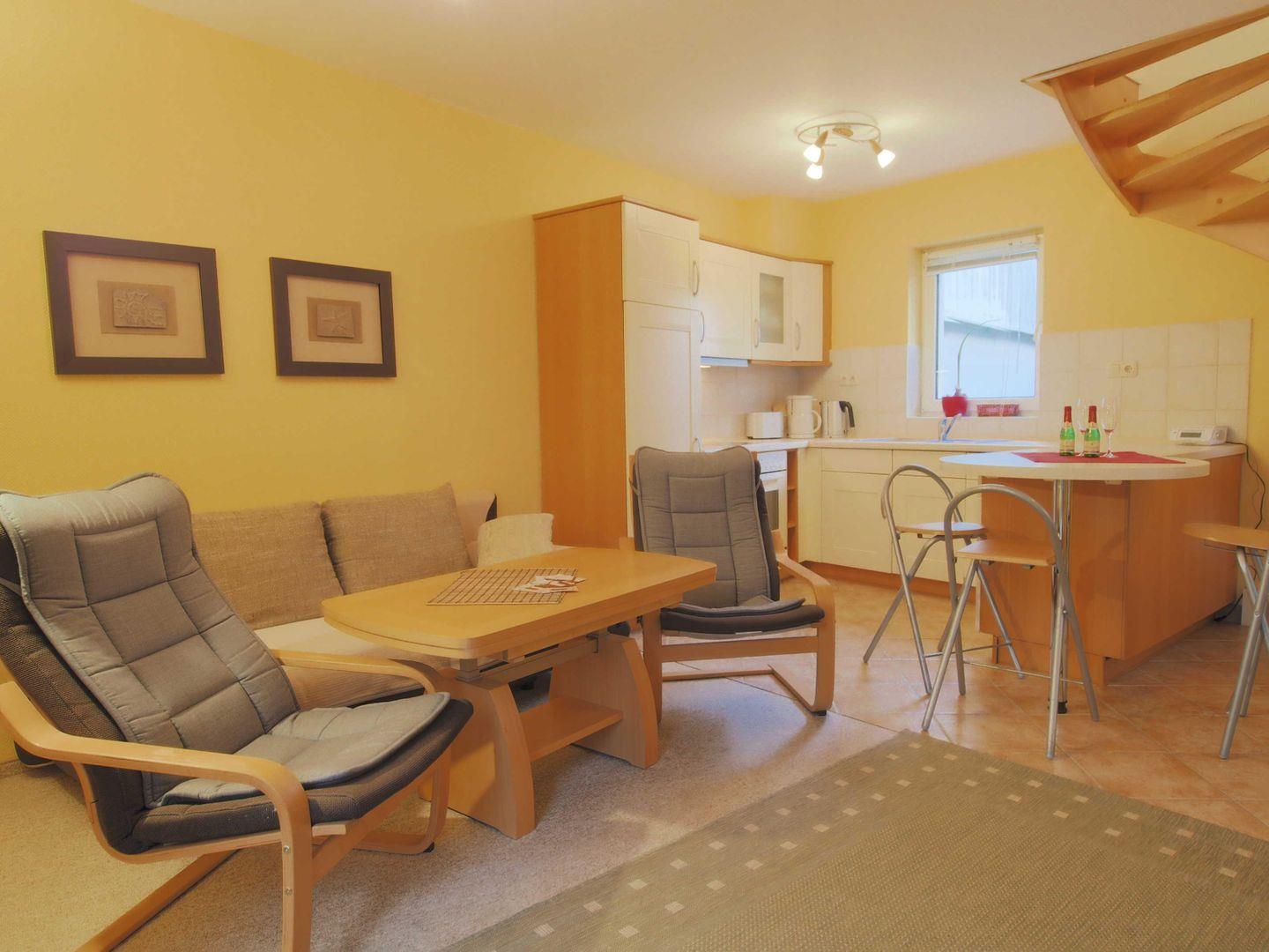 Nach einem sonnigen Strandtag lädt das gemütliche Wohnzimmer mit Schlafcouch zum Entspannen ein. Die offene, voll ausgestattete Wohnküche mit Tresen bietet alles, um gemeinsam zu kochen, zu genießen und den Abend gemütlich ausklingen zu lassen.
