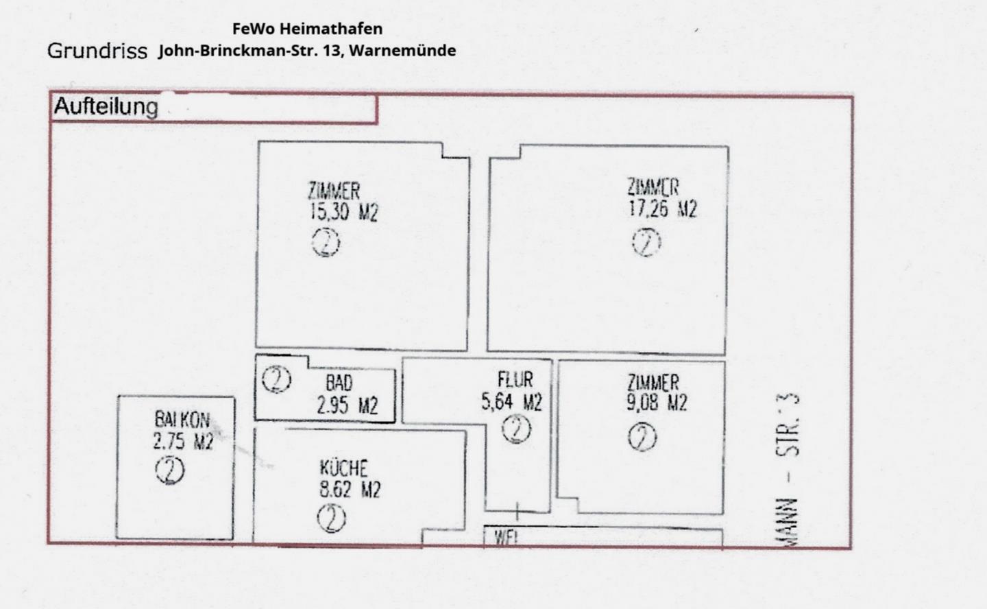 Die Ferienwohnung „Fewo Heimathafen“ bietet auf 62 m² Platz für bis zu 4 Personen. Sie verfügt über 2 Schlafzimmer (ein Doppelbett, zwei Einzelbetten), ein modernes Tageslichtbad, ein Wohnzimmer mit Sofa und TV sowie eine separate, voll ausgestattete Küche mit Zugang zum Balkon. WLAN und ein eigener Parkplatz sind inklusive – ideal für einen entspannten Urlaub an der Küste.