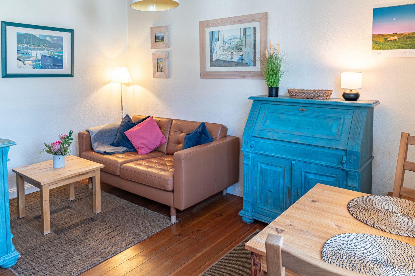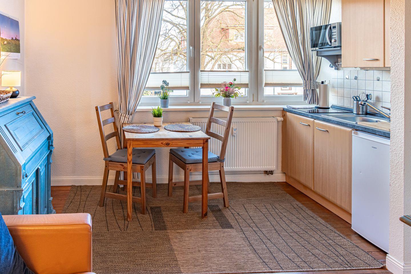 Der helle Wohn- und Essbereich lädt zum Verweilen ein: Eine praktische Küchenzeile mit Zwei-Platten-Herd, Mikrowelle und allem, was Sie zum Kochen brauchen, lässt keine Wünsche offen. Genießen Sie Ihre Mahlzeiten am Esstisch oder entspannen Sie auf dem Sofa bei einem Filmabend mit TV.