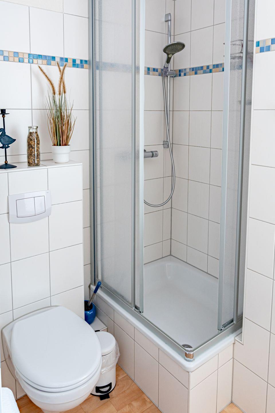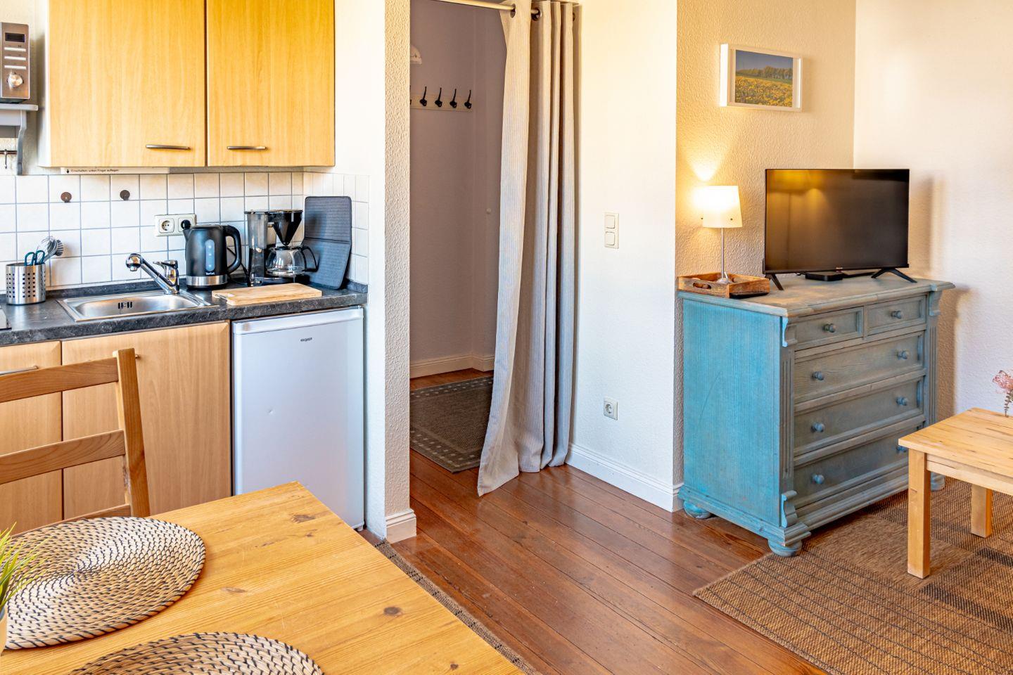 Gemütliche 30 m² Unterkunft für 2 Personen mit separatem Schlafzimmer (Doppelbett), Badezimmer mit WC und Waschbecken sowie hellem Wohn- und Essbereich mit Küchenzeile (2-Platten-Herd, Mikrowelle), Esstisch, Sofa und TV. Highlight: eigener Strandkorb am Strand – perfekt für entspannte Urlaubstage!