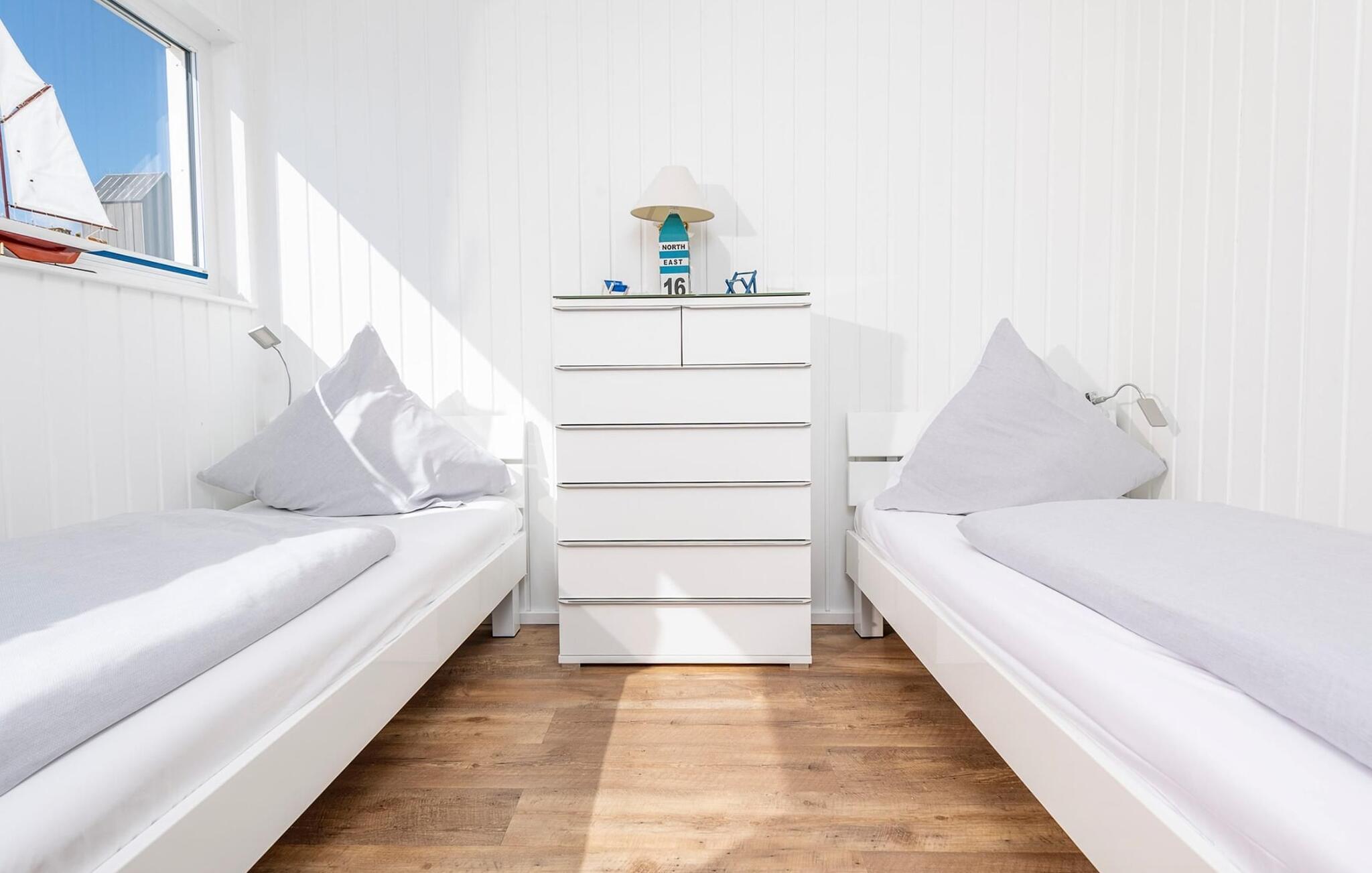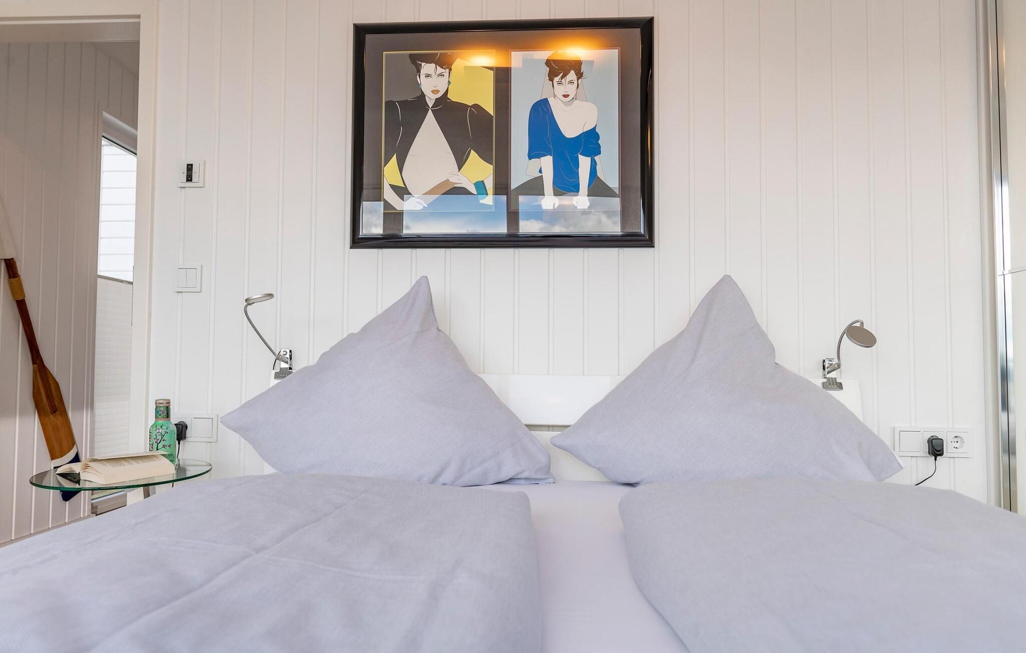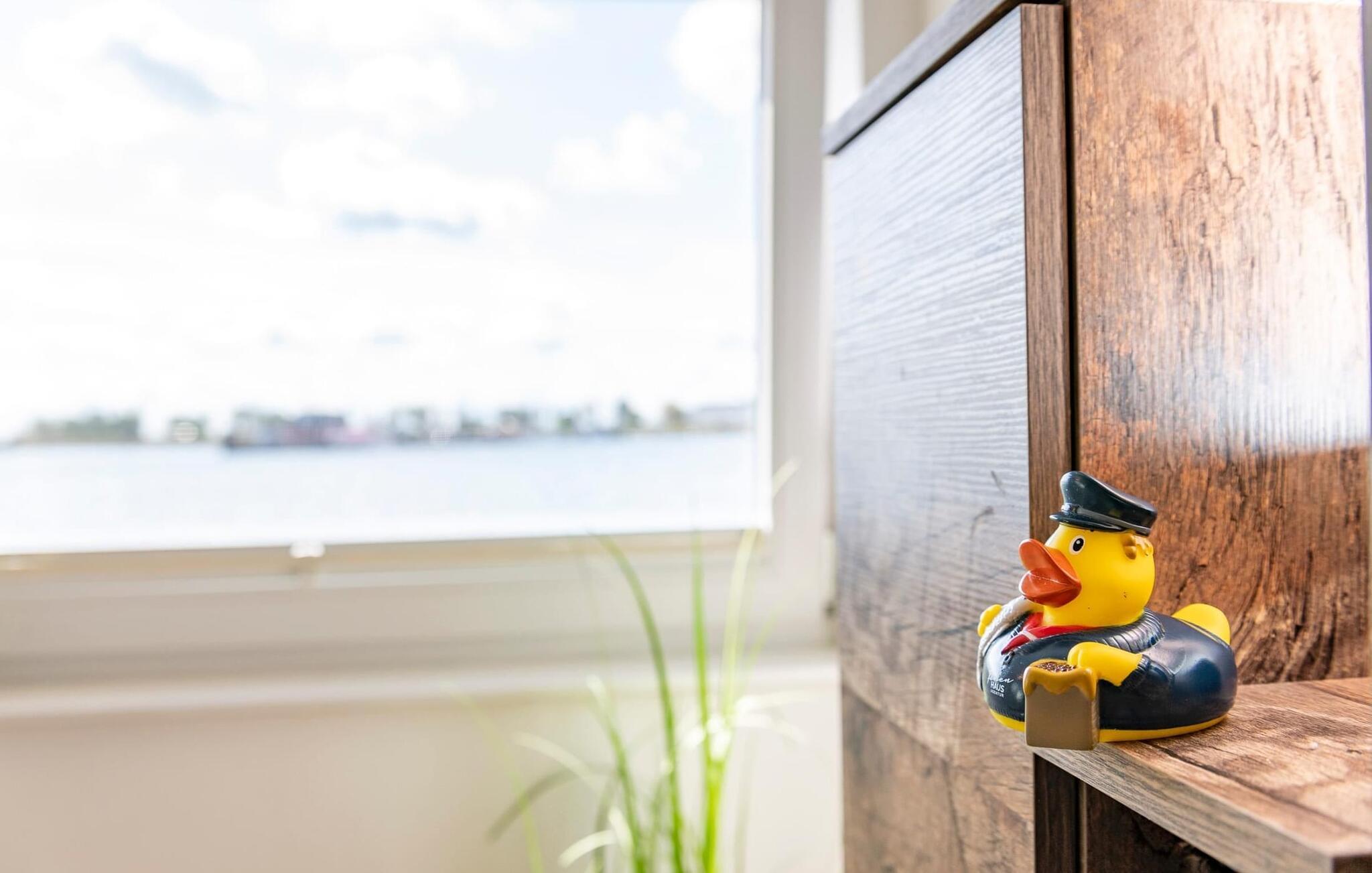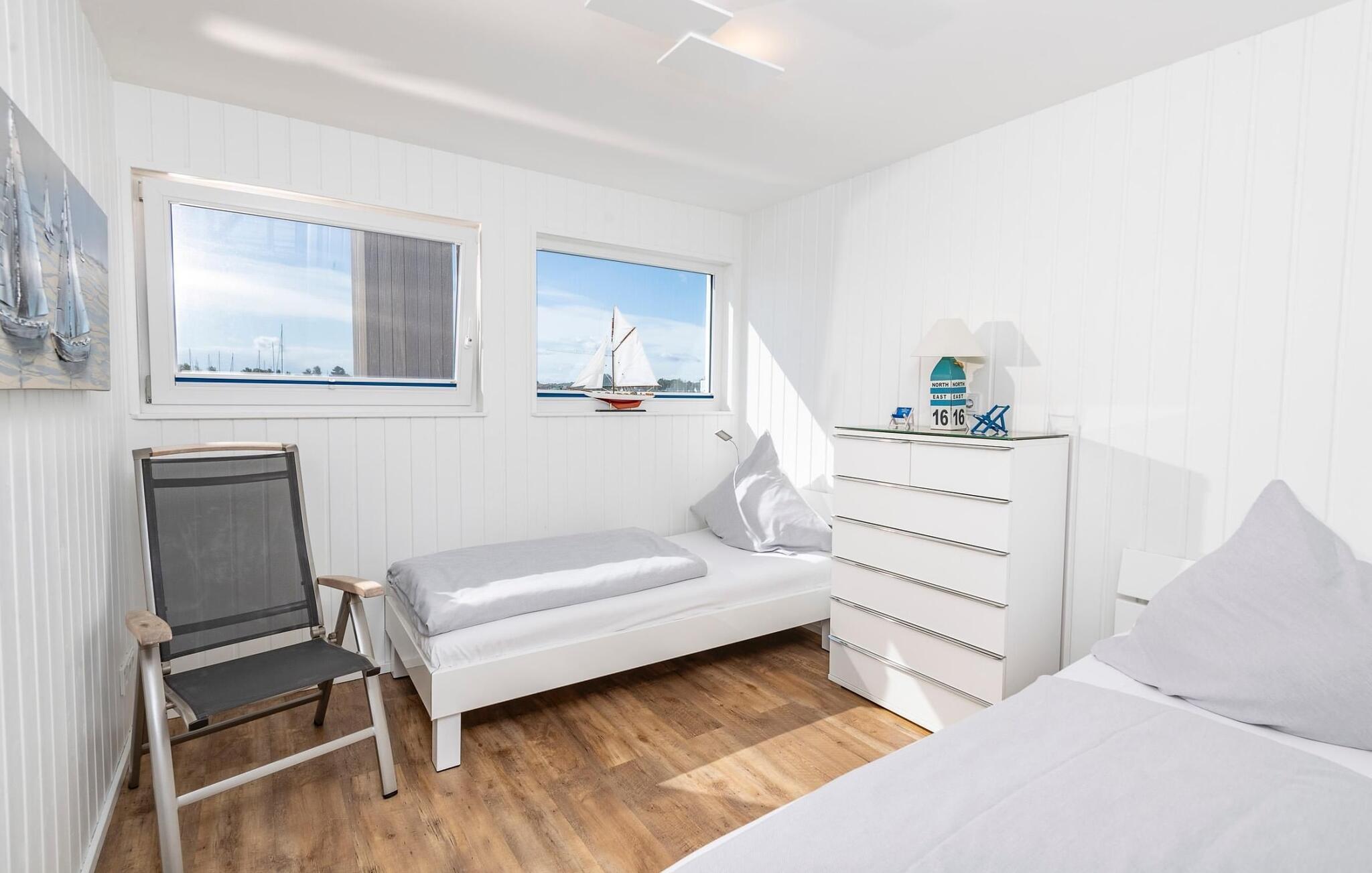 Zwei Schlafzimmer bieten Platz für 4 Erwachsene. Ein besonderes Highlight stellt das Hauptschlafzimmer dar. Dank der bodentiefen Fensterfront vor unmittelbarer Wasserkulisse werden hier Träume wahr. Über eine Terrassentür ist die umläufige Begehung des schwimmenden Hauses möglich.