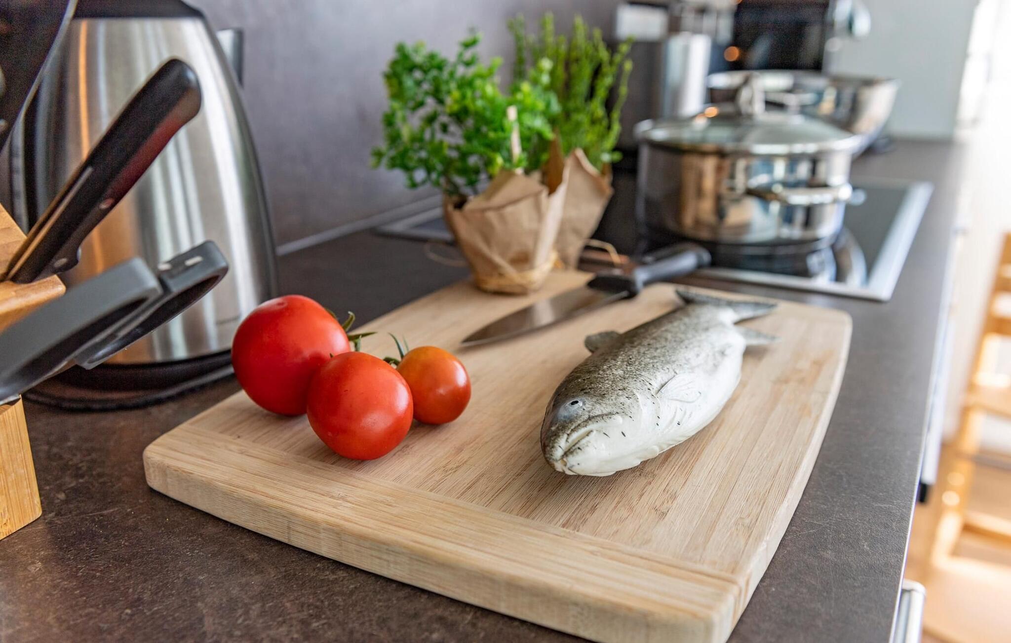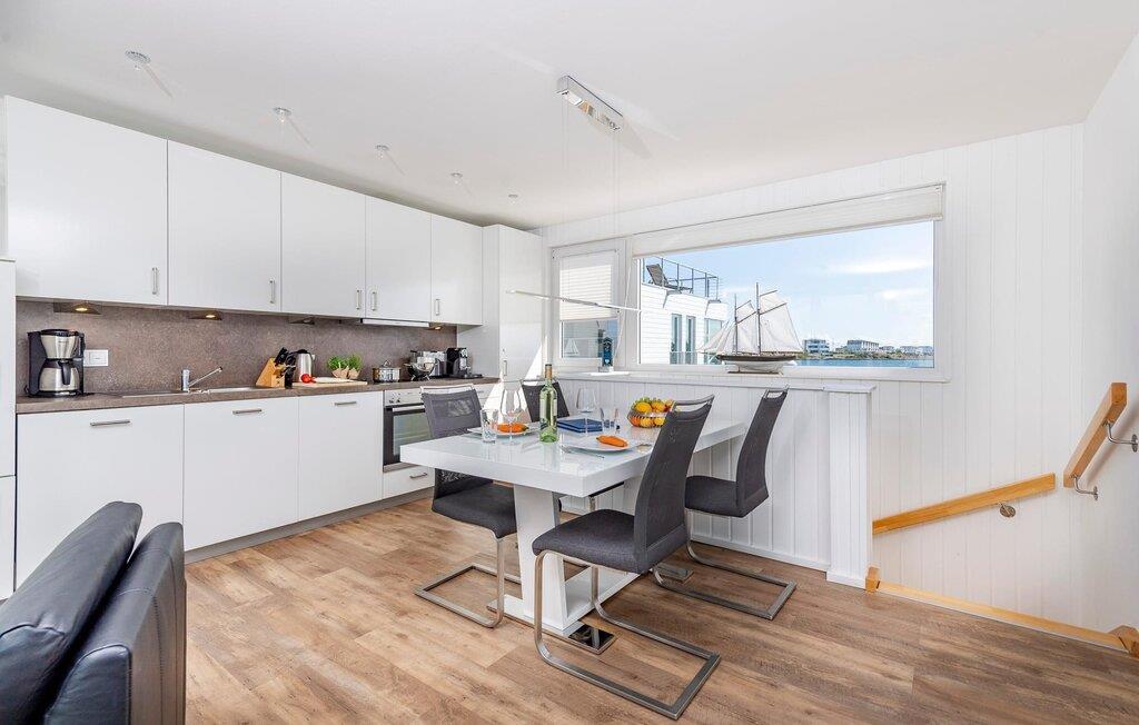 Der offen gestaltete Wohn-und Essbereich erlaubt dank großer Fensterfronten und der einzigartigen Lage dieses Hauses einen freien Blick auf den Segel- und Sportboothafen und zeichnet sich durch eine moderne Einrichtung und außergewöhnliche Lichtlösungen aus. Die Küche lässt mit einer umfangreichen Ausstattung sowie einer Wasch- und Trockenkombination keine Wünsche offen.