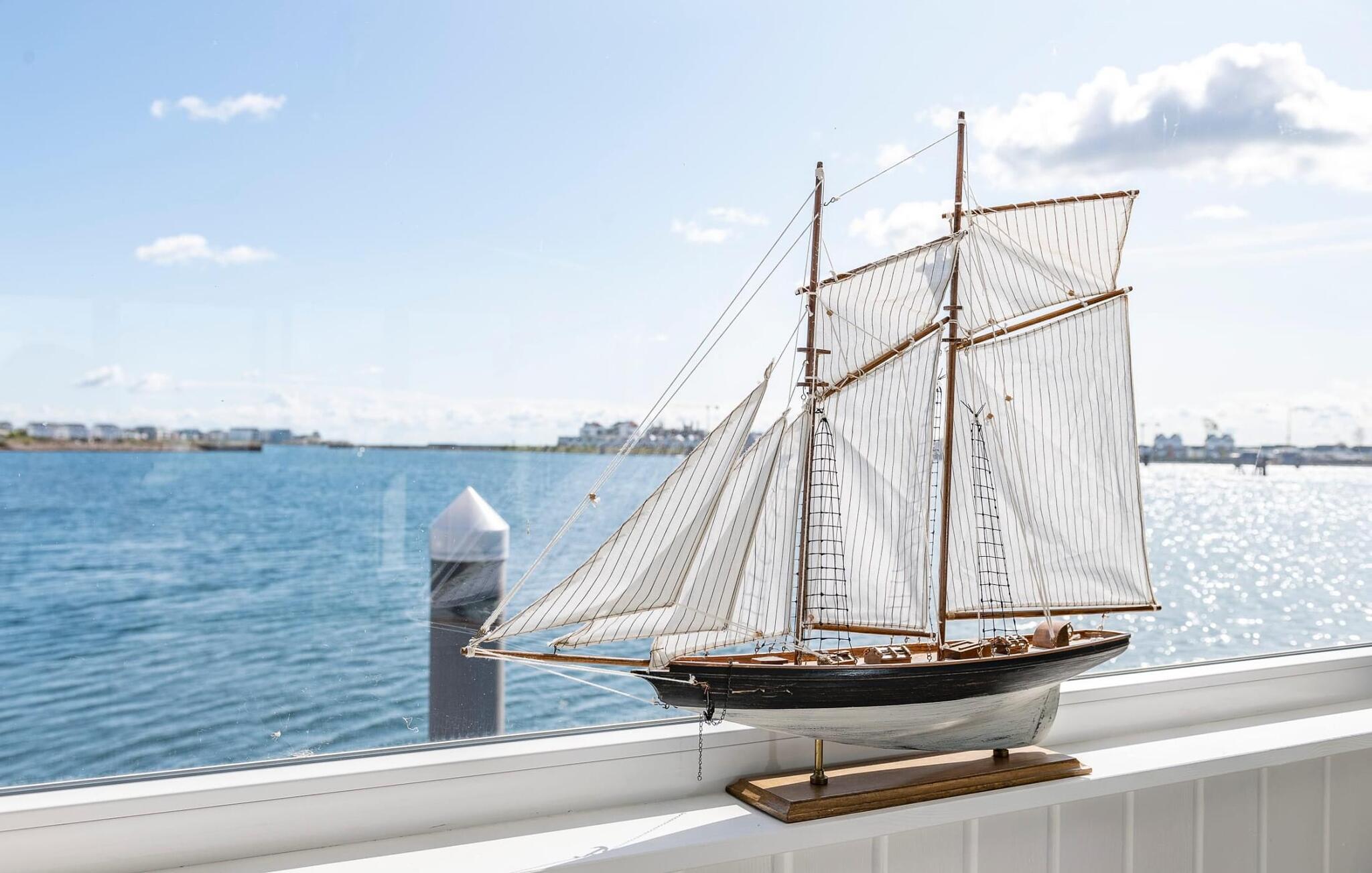 Erleben Sie das schwimmende Ferienhaus Waterfront im OstseeResort Olpenitz mit Sauna und traumhaftem Blick auf den Segel- und Sportboothafen.