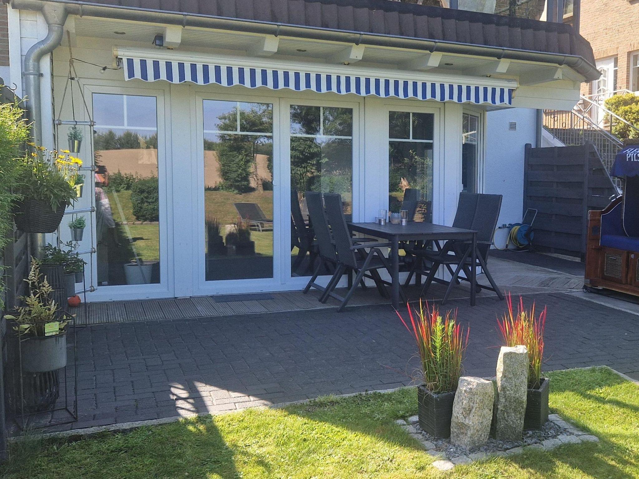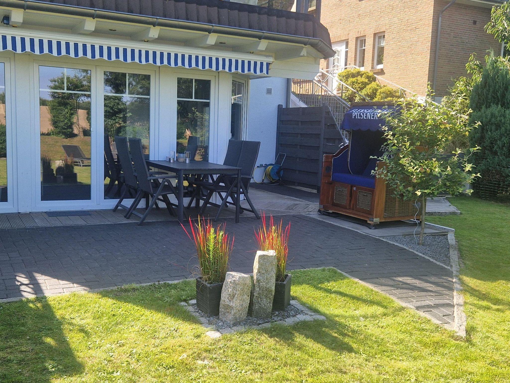 • Terrasse mit Gartenmöbeln und Strandkorb
