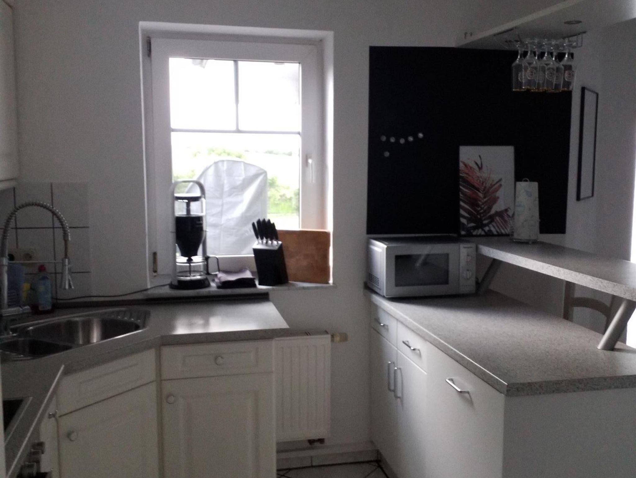 Im hellen und freundlichen Wohnzimmer haben Sie einen unverbauten Blick auf den Garten und in die Landschaft von Angeln. Die angenzende Küche ist voll ausgestattete mit Kühlschrank, Gefrierschrank, Kaffeemaschine und vielem Mehr.