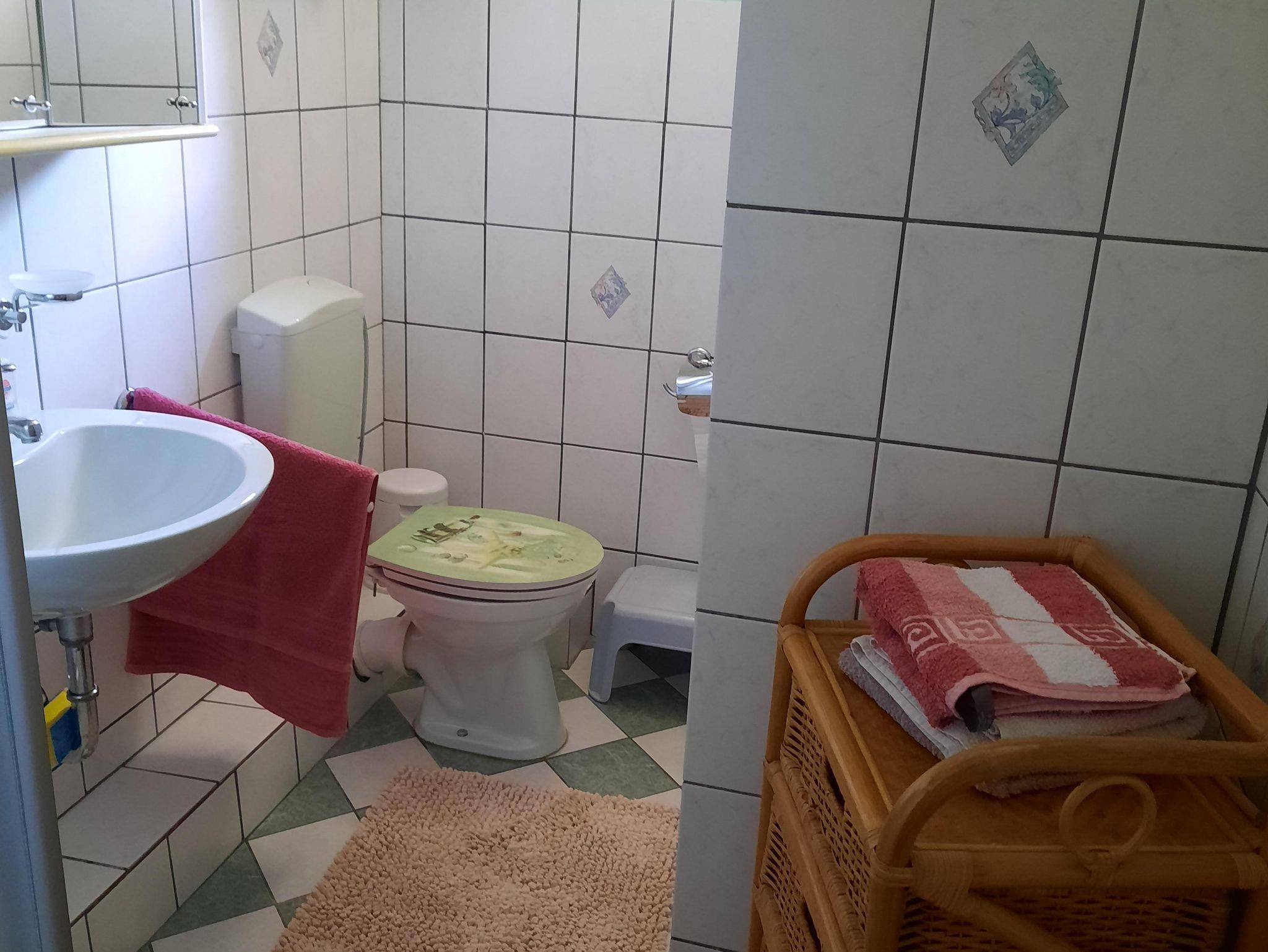• 1 Badezimmer mit Dusche, Waschbecken, Spiegelschrank, Handtuchschrank, WC