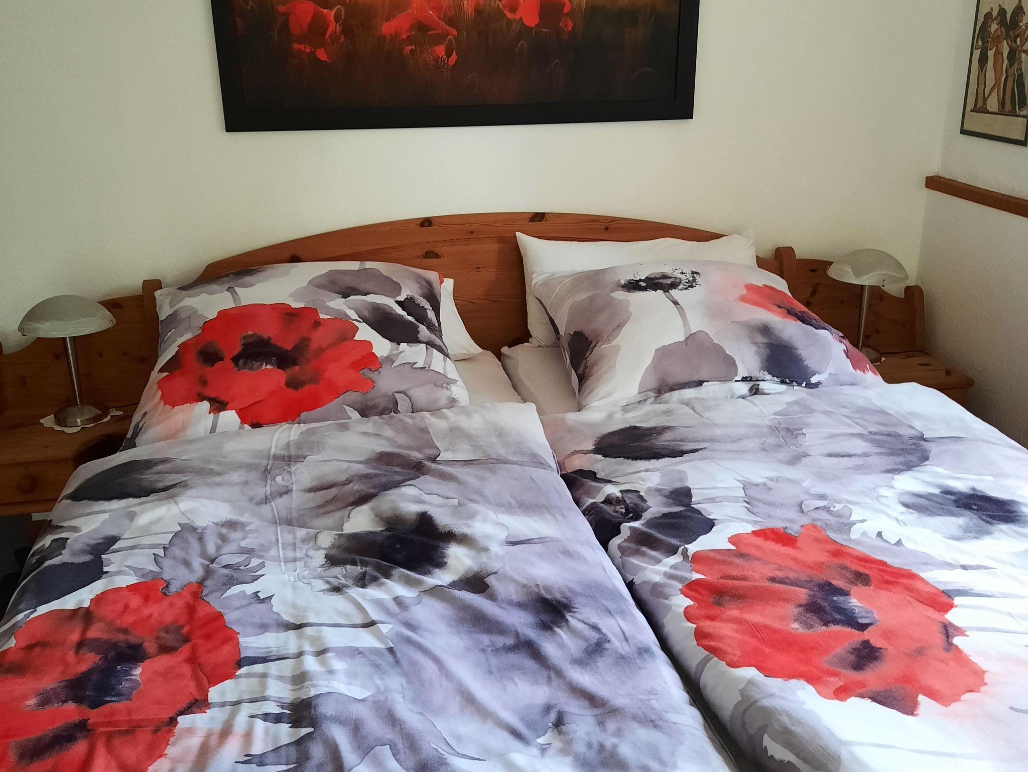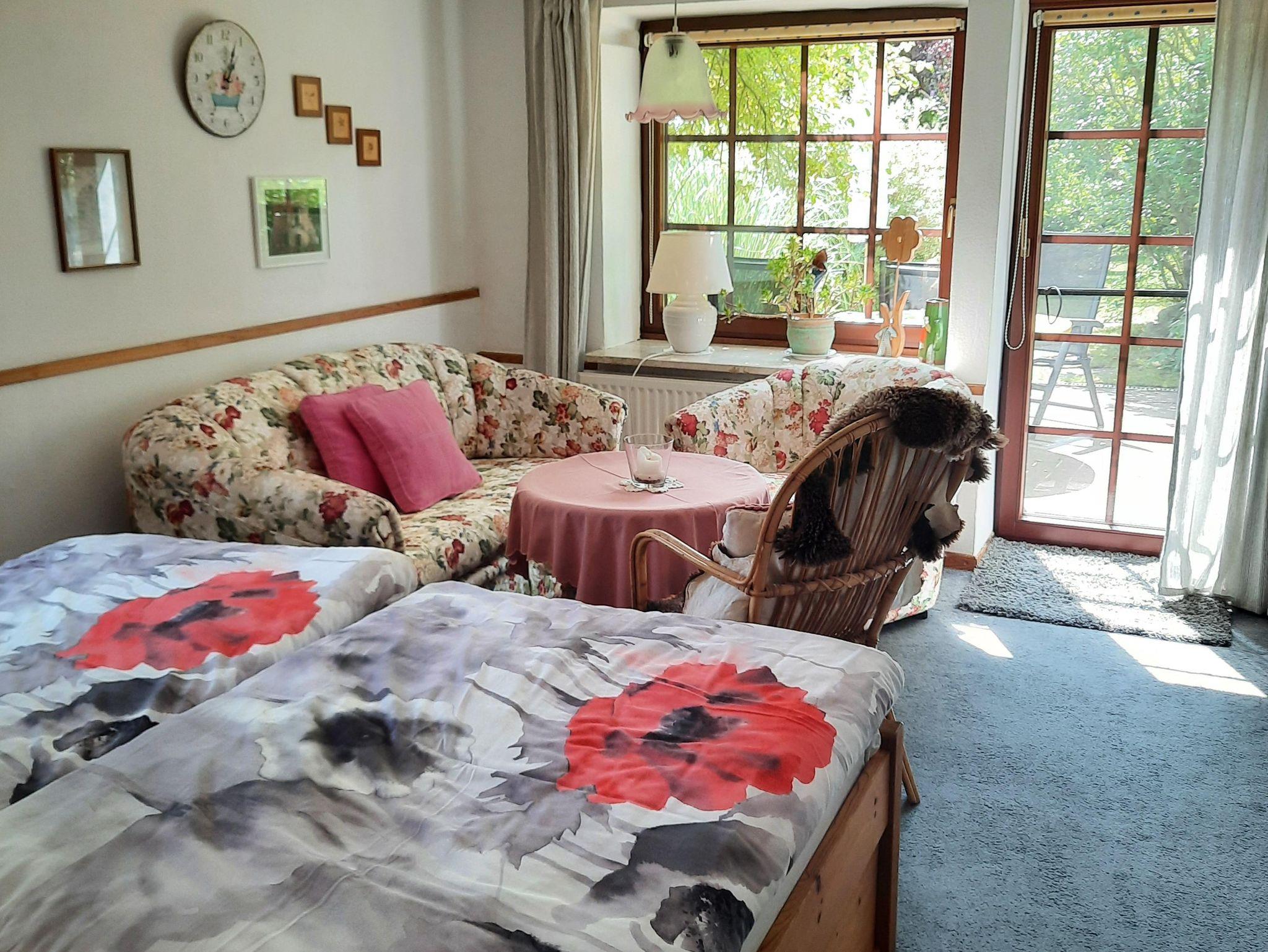 • 1 Wohn-/Schlafraum mit Doppelbett (180 x 200cm), Sofaecke mit Dreisitzer und 2 Korbstühlen, Esstisch mit 2 Stühlen, TV, DVD-Player