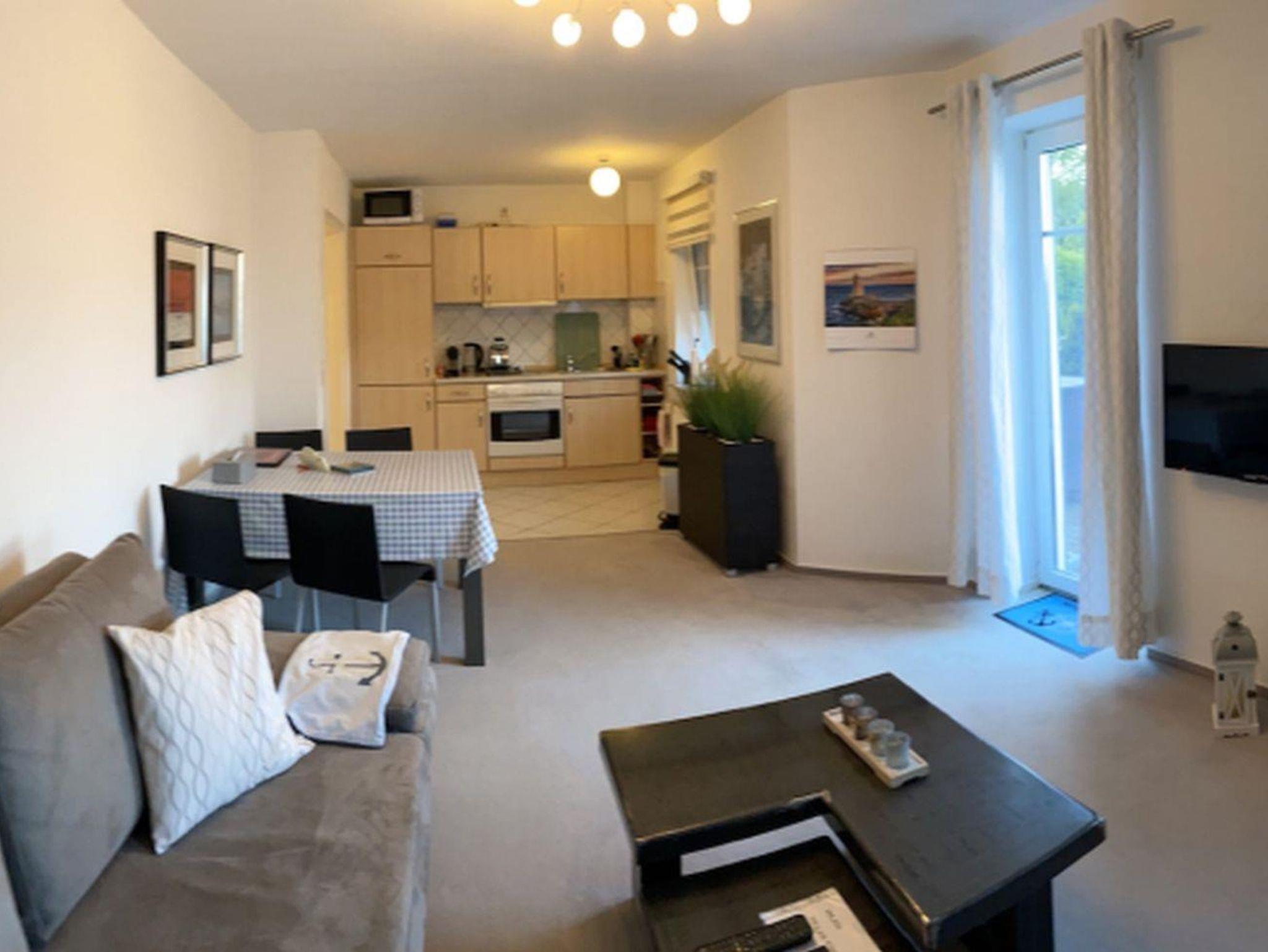 Die kombinierte Wohnküche besteht aus einem Wohnbereich mit einem hochwertigen ausziehbaren Schlafsofa (1,60 x2,00 m Liegefläche) für weitere zwei Personen und einer offenen Küche mit Cerankochfeld, Mikrowelle, Toaster, Kaffemaschine, usw.