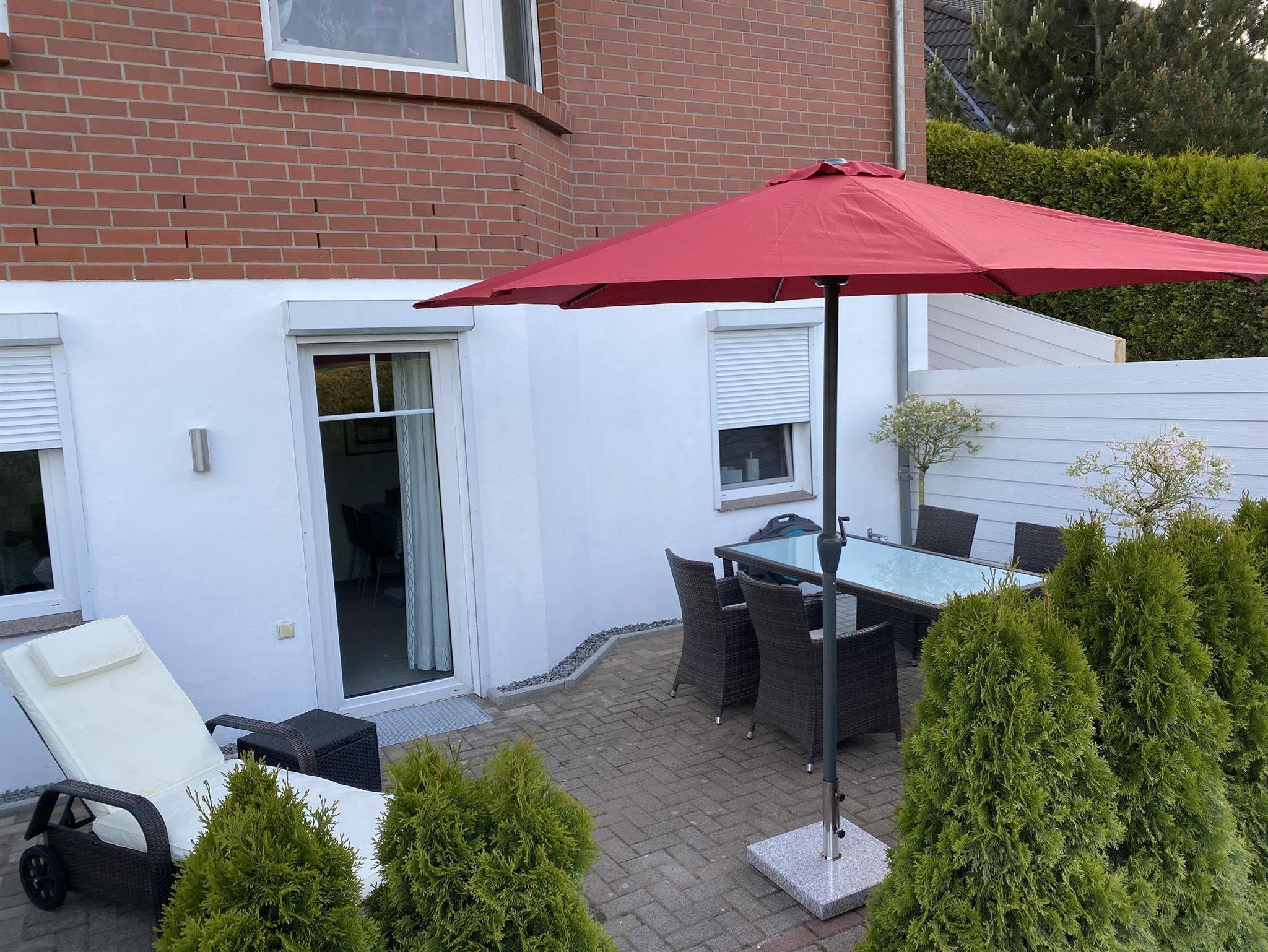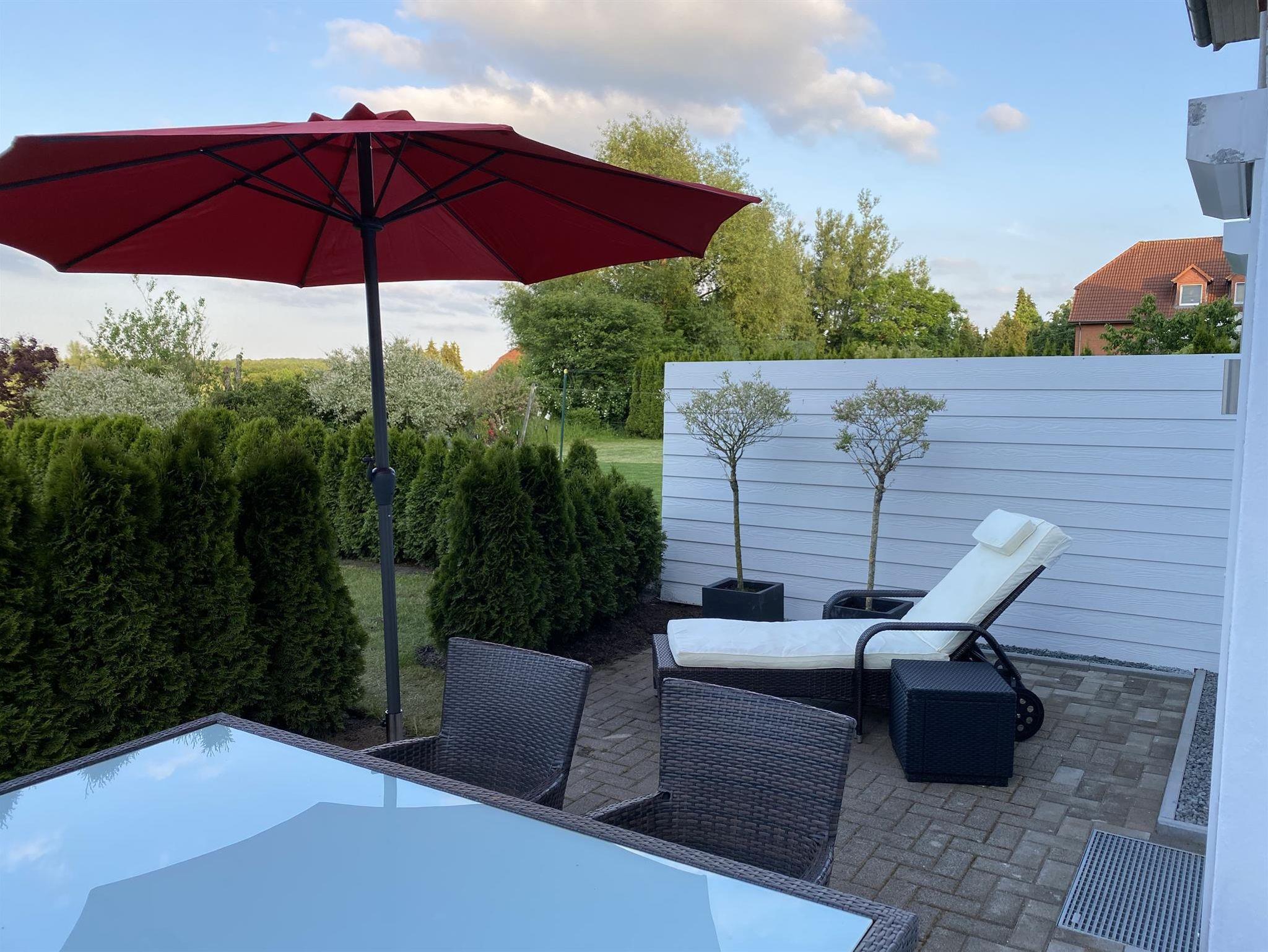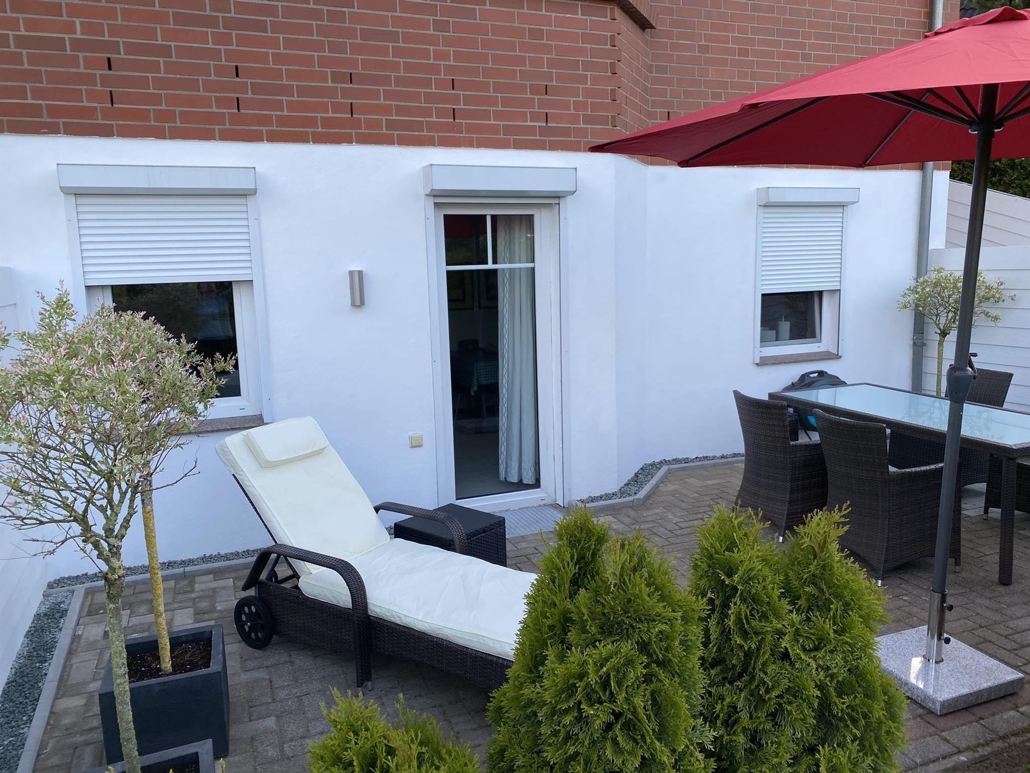 Die eigene zur Ferienwohnung gehörige Terrasse lädt zum Entspannen ein. Der Garten steht Ihnen alleine zur Verfügung und ist mit Liegestuhl und Strandkorb und einer Sitzgruppe ausgestattet.