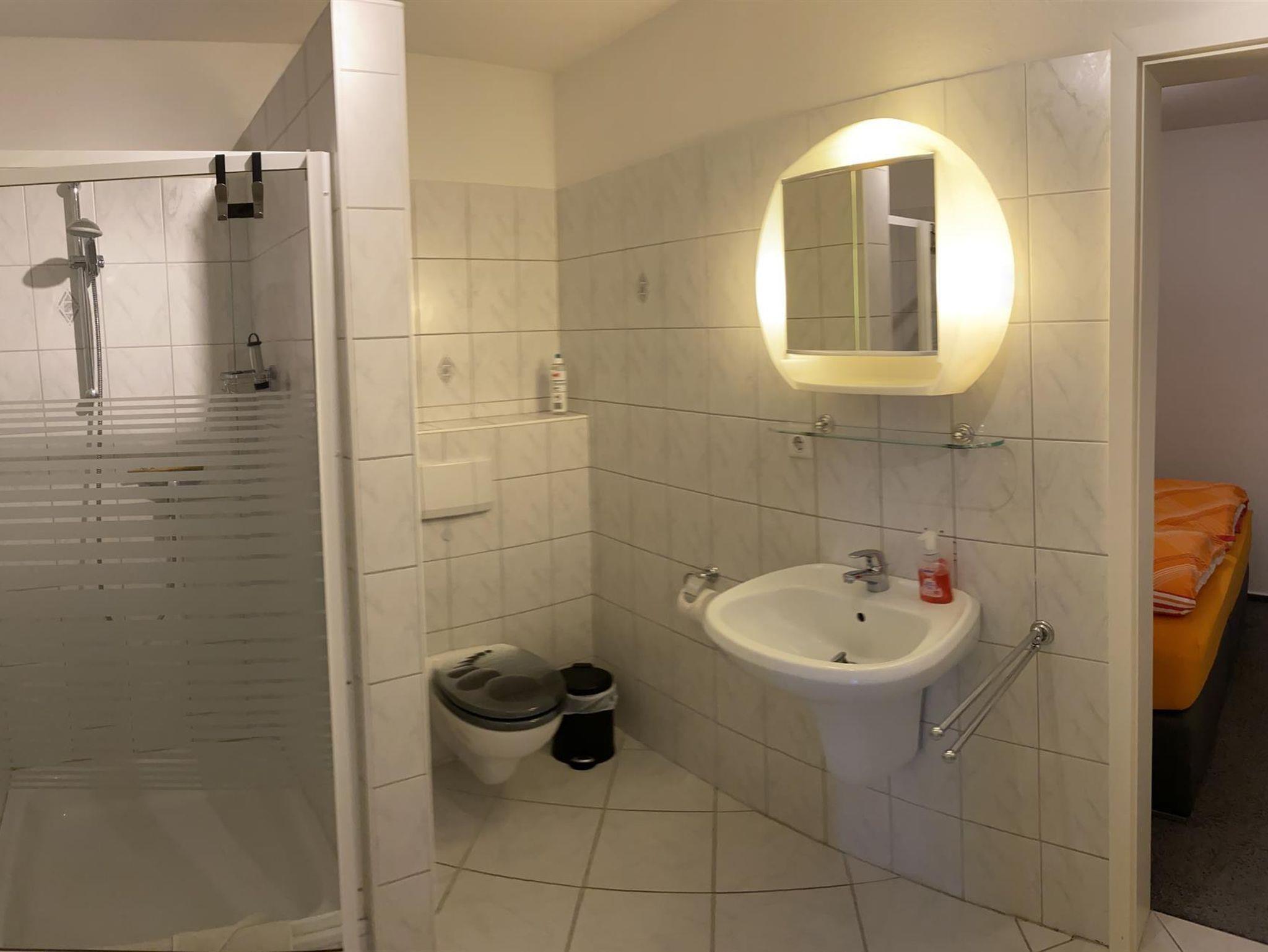 Das Badezimmer ist mit Dusche und WC ausgestattet.