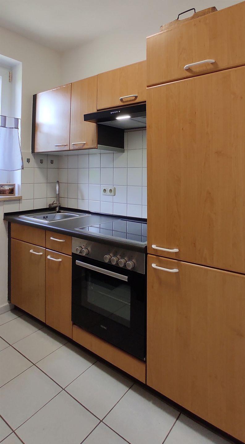 Die separate, kleine Küche ist unter anderem mit Herd mit Backofen, Kühlschrank, Kaffeemaschine, Wasserkocher und einem Toaster ausgestattet.