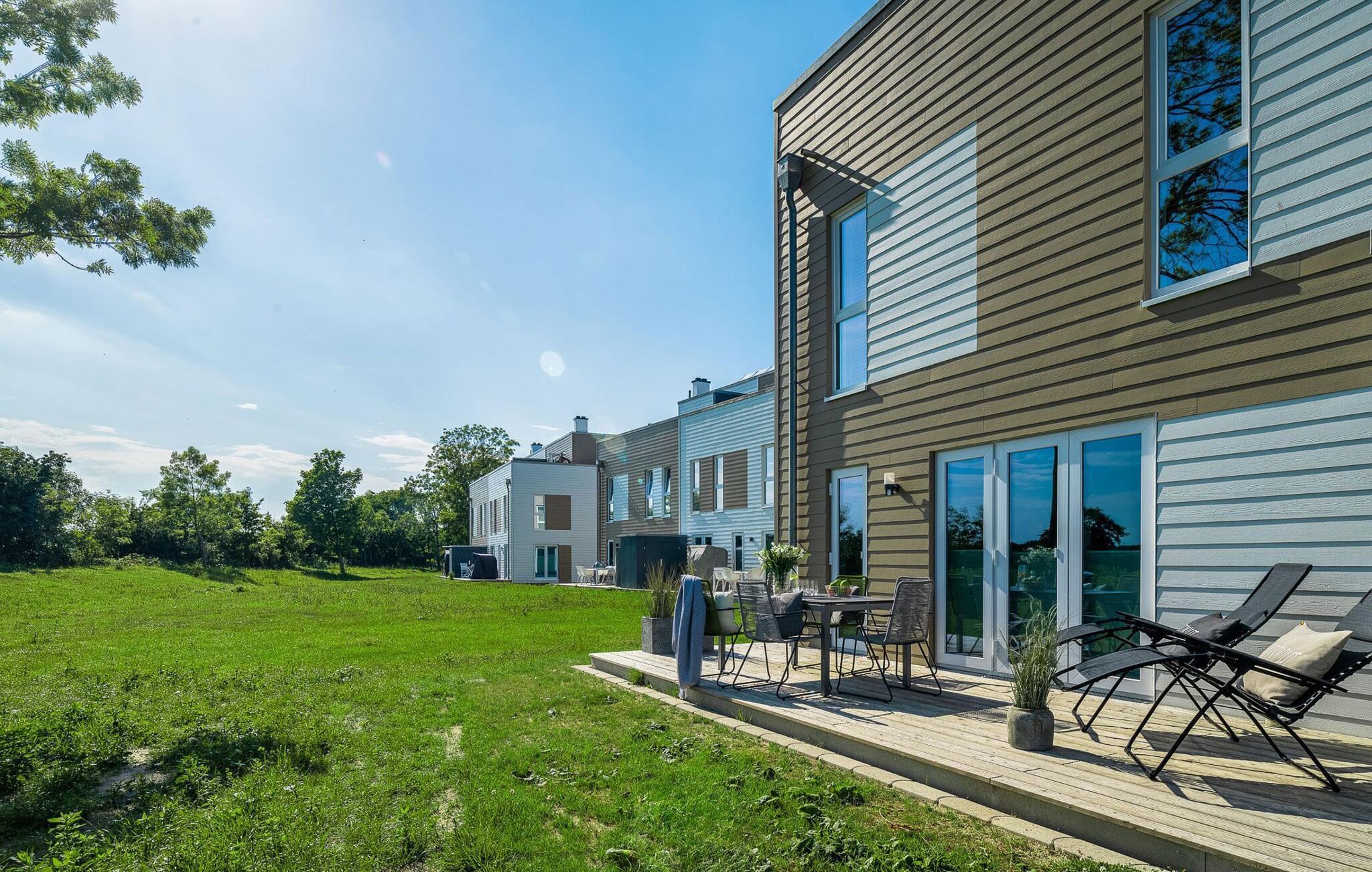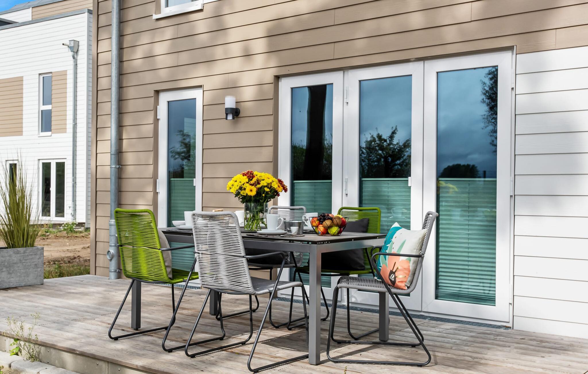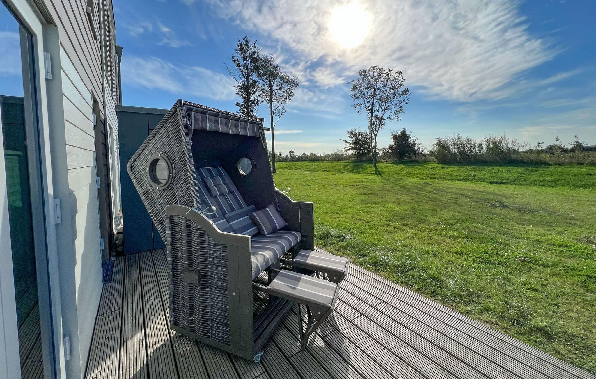 Direkt vom Wohnbereich aus betretet ihr die großzügige Terrasse mit Süd-West-Ausrichtung. Diese bietet erholsame Stunden fernab vom Trubel des restlichen OstseeResorts. Nach hinten ausgerichtet mit Blick auf die Naturschutz-Salzwiesen, Felder und gen Meer genießt ihr die WEITSICHT. Die hochwertigen Möbel der Terrasse laden zum Grillen und Verweilen ein.