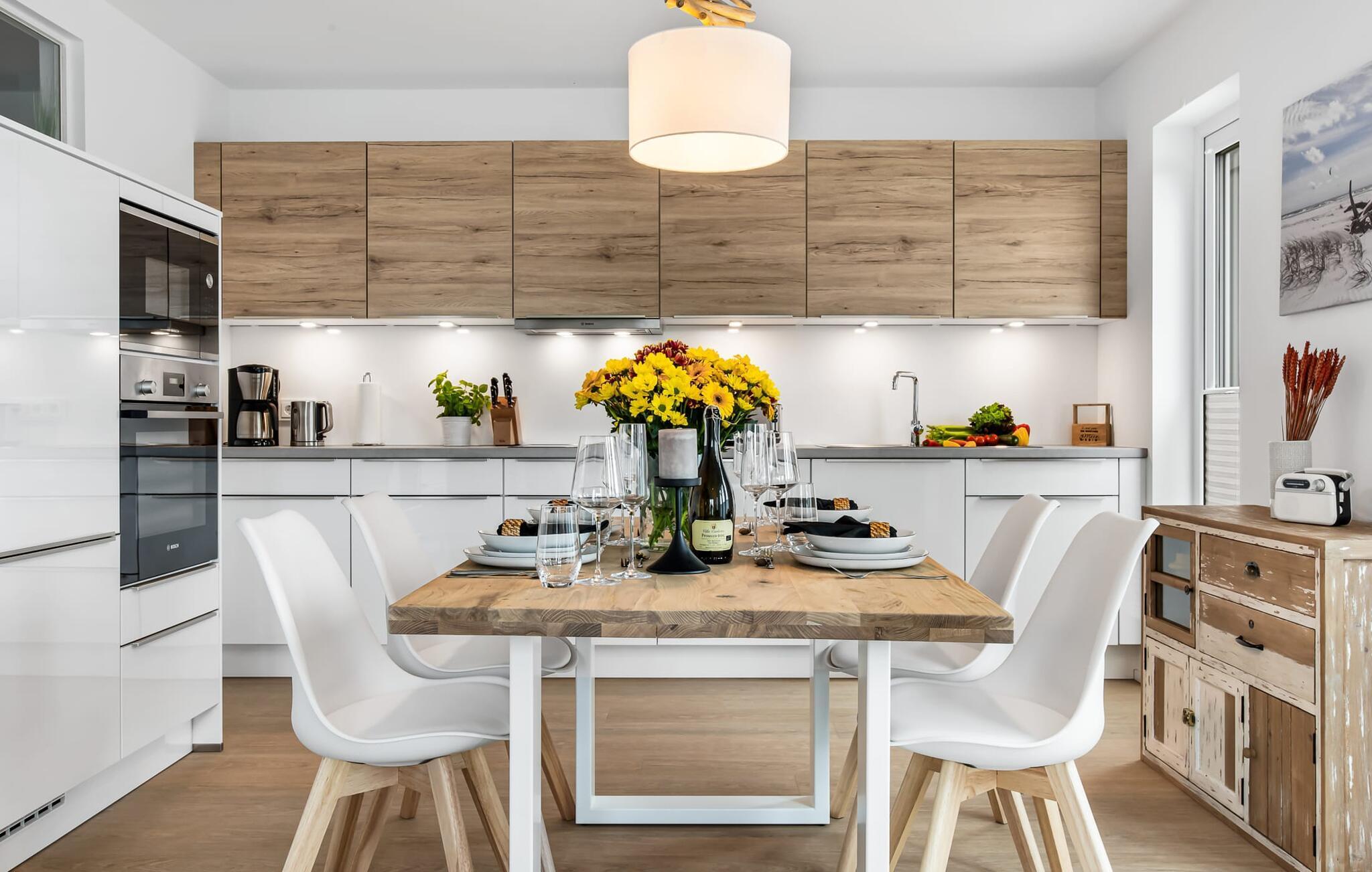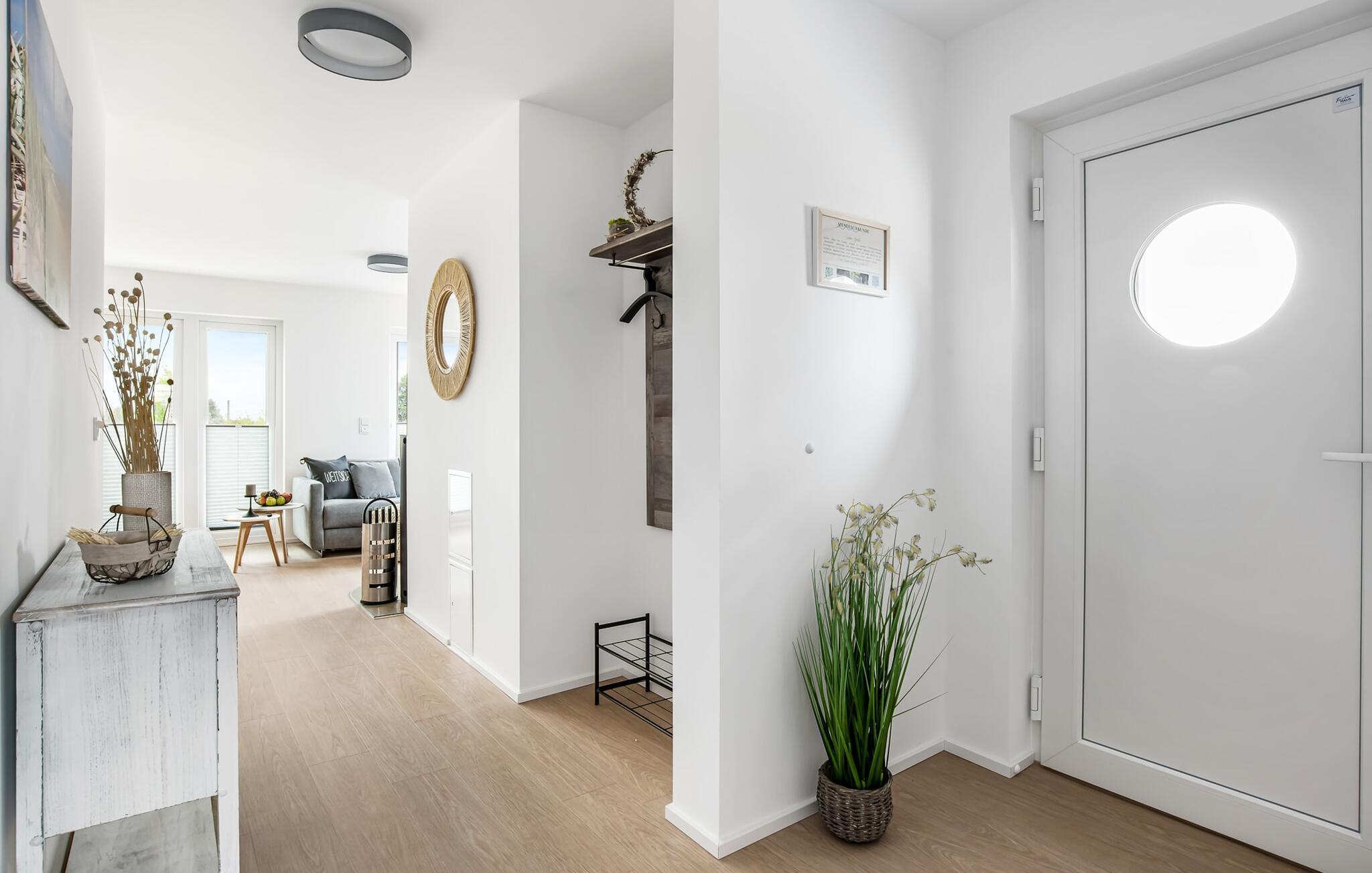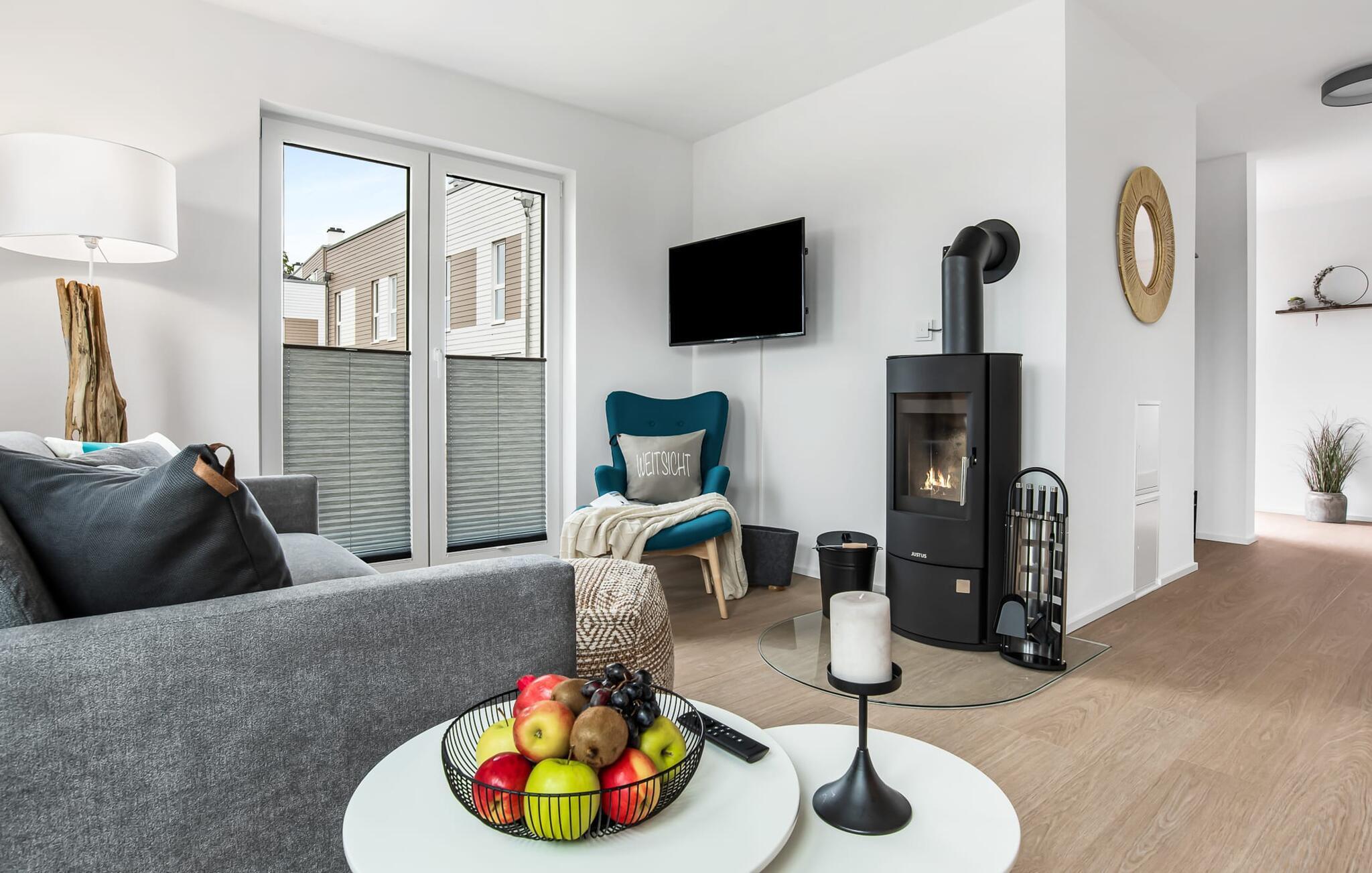 Das Herzstück der mit hochwertigen und ökologisch nachhaltigen Materialien verarbeiteten Wohnung ist der offene, lichtdurchflutete Wohn-/Essbereich. Die bodentiefe Fensterfront sorgt für einen einmaligen Blick in die Natur. Die integrierte Küche ist perfekt ausgestattet. So macht gemeinsames Kochen besonders viel Spaß. Sollte sich das Wetter einmal von der nordischen Seite zeigen, lädt die Wohnlandschaft zur Entspannung ein. Der Kaminofen erzeugt mit seinem knisternden Feuer Gemütlichkeit.