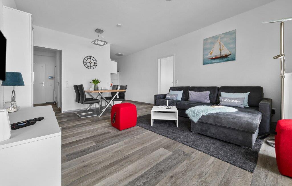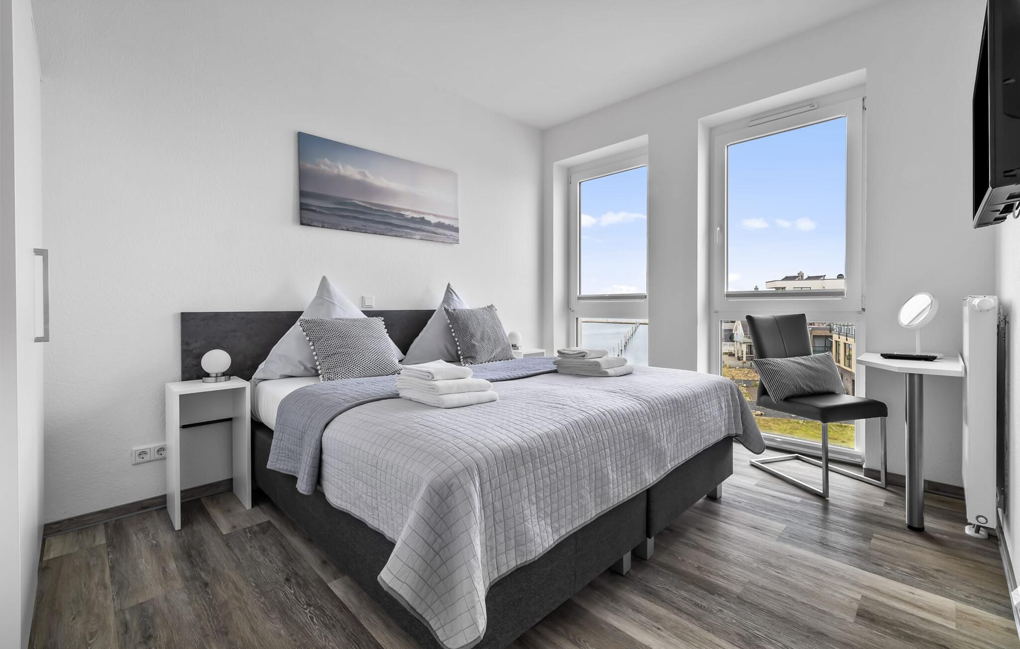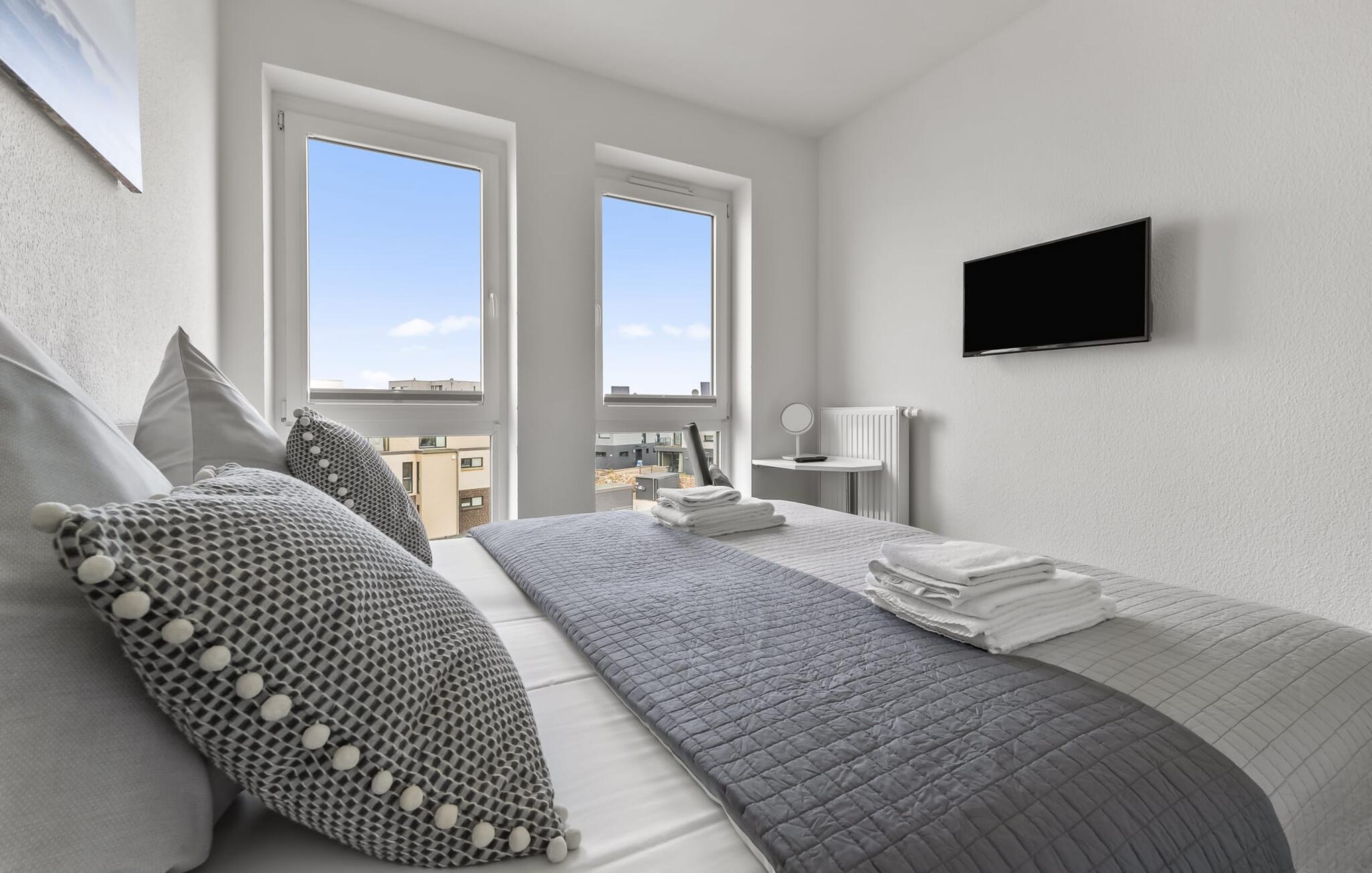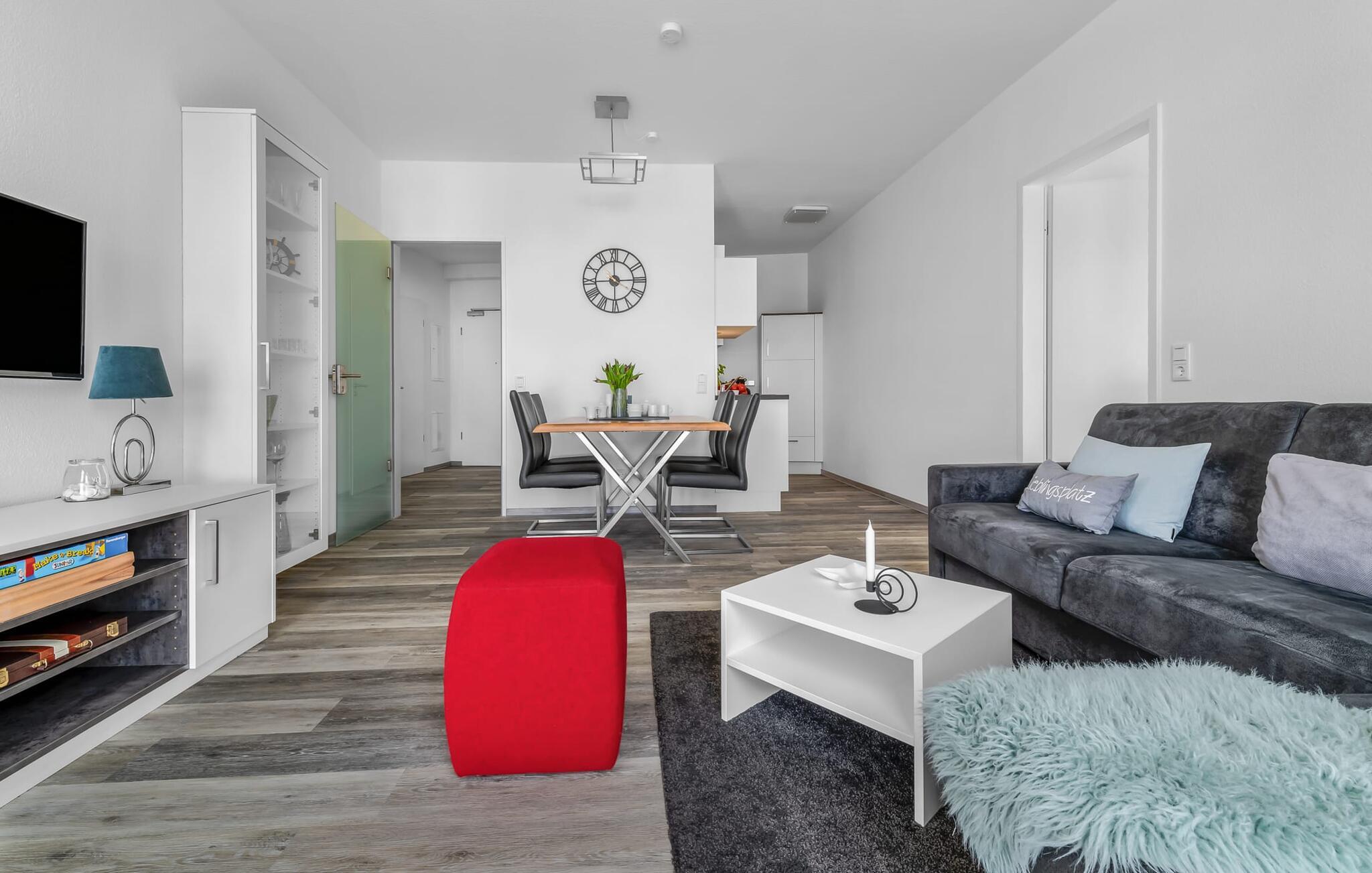 Die Wohnung verfügt über zwei geschmackvoll eingerichtete Schlafzimmer, eines mit einem komfortablen Doppelbett und das andere mit zwei Einzelboxspringbetten. Für zusätzlichen Schlafplatz kann die ausziehbare Couch im Wohnzimmer in zwei weitere Schlafplätze (160x200cm) verwandelt werden. In jedem Schlafzimmer sowie im Wohnzimmer befindet sich ein moderner Smart-TV, der Euch für Unterhaltung sorgt. Neben der hochwertigen Ausstattung bietet die Ferienwohnung kostenfreies WLAN, um Euch mit der Welt zu verbinden.